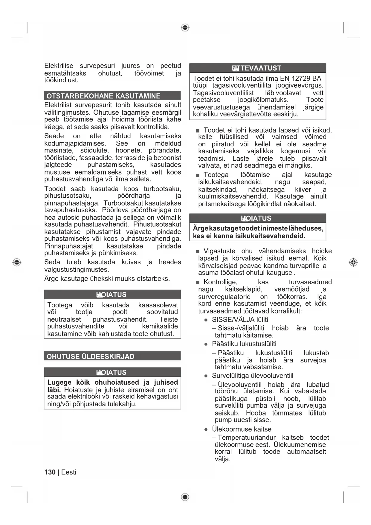 Hoidke päästikuga käepidemest mõlema käega tugevalt kinni. Olge valmis selleks, et käepide vöib päästiku tombamisel reaktsioonijoudude tottu liikuda. Kui päästikut kindlalt ei hoita, vöib kontroll pesuri üle kaduda ja te voite ennast voit eisi vigastada.