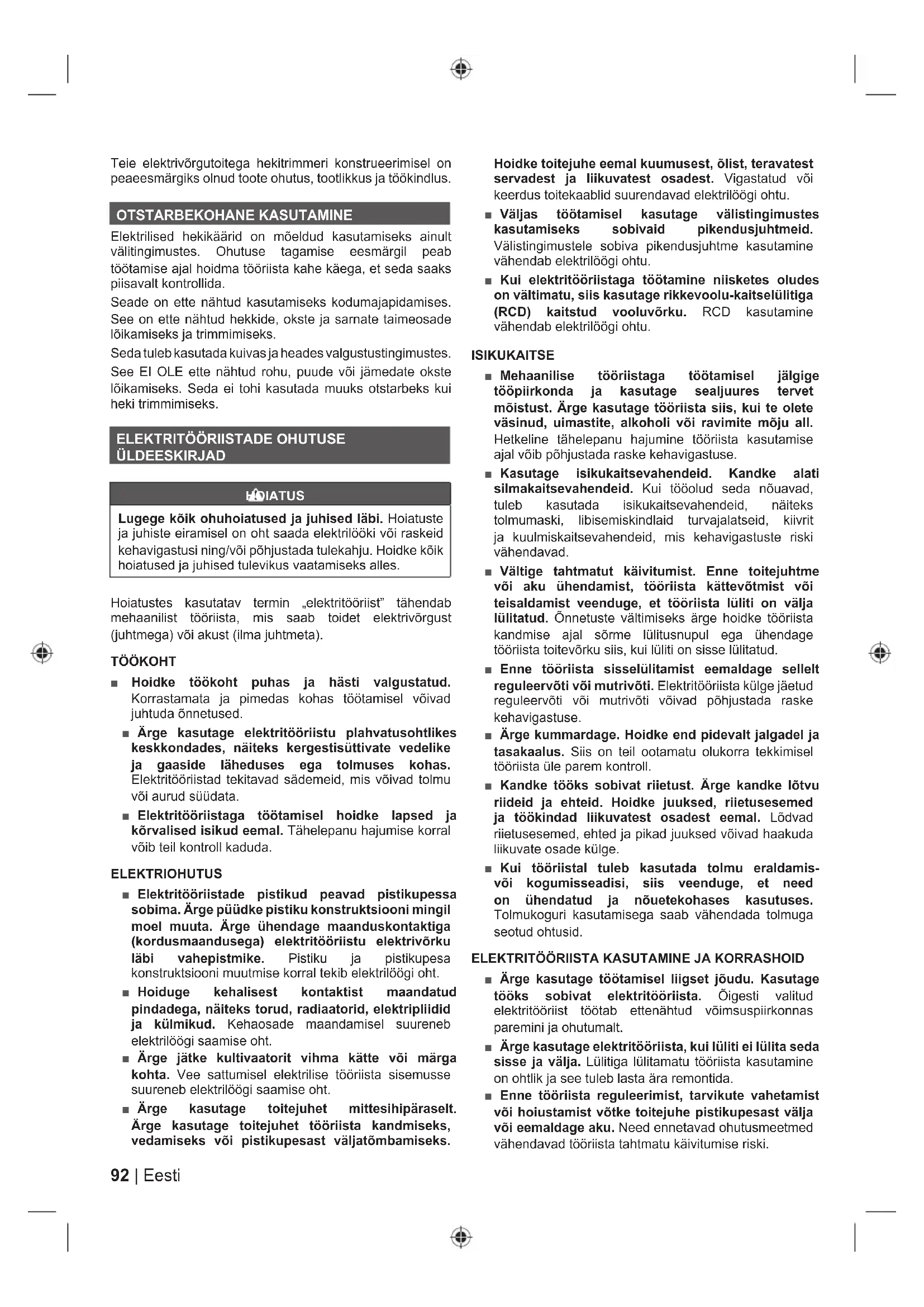 ■ Hoidke kasutuses mitteolevaid elektritööriistu lastele kättesaamatus kohas ja ärge lubage elektritööriista mitte tundvaid või kasutusjuhendiga mitte tutvunud isikuid elektritööriista kasutada. Oskamatu kasutaja käes olev elektritööriist on ohtlik. ■ Mehaaniliste elektritööriistade hooldus. Kontrollige liikuvate osade mittetsentreeritust ja kinnitumist, osade vigastusi ning tehke kindlaks muud seisundid, mis võivad mõjustada elektritööriista tööd. Kui mõni osa on vigastatud, siis laske elektritööriist enne kasutamist ära parandada. Halvasti hooldatud elektritööriistad põhjustavad palju õnnetusi. ■ Hoidke lõiketerad teravad ja puhtad. Teravate lõiketeradega ja nõuetekohaselt hooldatud lõikeriistad jäävad harvemini kinni ning neid on kergem kontrolli all hoida. ■ Tööriistade, tarvikute, otsakute ja muude lisaseadmete kasutamisel juhinduge nende kasutusjuhenditest, võttes arvesse tehtavat tööd ja tööolusid. Tööoperatsiooniks mitte ettenähtud tööriista kasutamine võib tekitada ohtliku olukorra. TEENINDAMINE ■ Laske oma elektrilist tööriista hooldada väljaõppinud teenindustöötajal; remontimisel tohib kasutada ainult originaalvaruosi. See tagab elektriseadme ohutuse. HEKITRIMMERI OHUTUSEESKIRJAD ■ Hoidke kõik kehaosad lõiketerast eemal. Ärge üritage eemaldada ega hoida lõigatavat materjali sel ajal kui lõiketerad liiguvad. Kui oks jääb terade vahele kinni, siis lülitage trimmer välja. Hetkeline tähelepanu hajumine seadme kasutamise ajal võib põhjustada raske kehavigastuse. ■ Teisaldamise ajaks lülitage hekitrimmer välja ja kandke seda käepidemest. Hekitrimmeri teisaldamisel või hoiulepanekul paigaldage latile alati kaitsekate. Hekitrimmeri õige käsitsemine vähendab lõiketeradega seotud kehavigastusi. ■ Hoidke tööriista kinni ainult isoleeritud haardepindadest, sest lõiketera võib sattuda kokkupuutesse varjatud juhtmega või tööriista enda toitejuhtmega. Kui tööriist satub kontakti pinge all olevate juhtmetega, jäävad tööriista isoleerimata metallosad pinge alla ja kasutaja võib saada elektrilöögi. ■ Hoidke toitejuhe lõikamispiirkonnast eemal. Töötamise ajal võib toitejuhe olla põõsaste varjus ja seetõttu võite sellesse juhuslikult sisse lõigata.