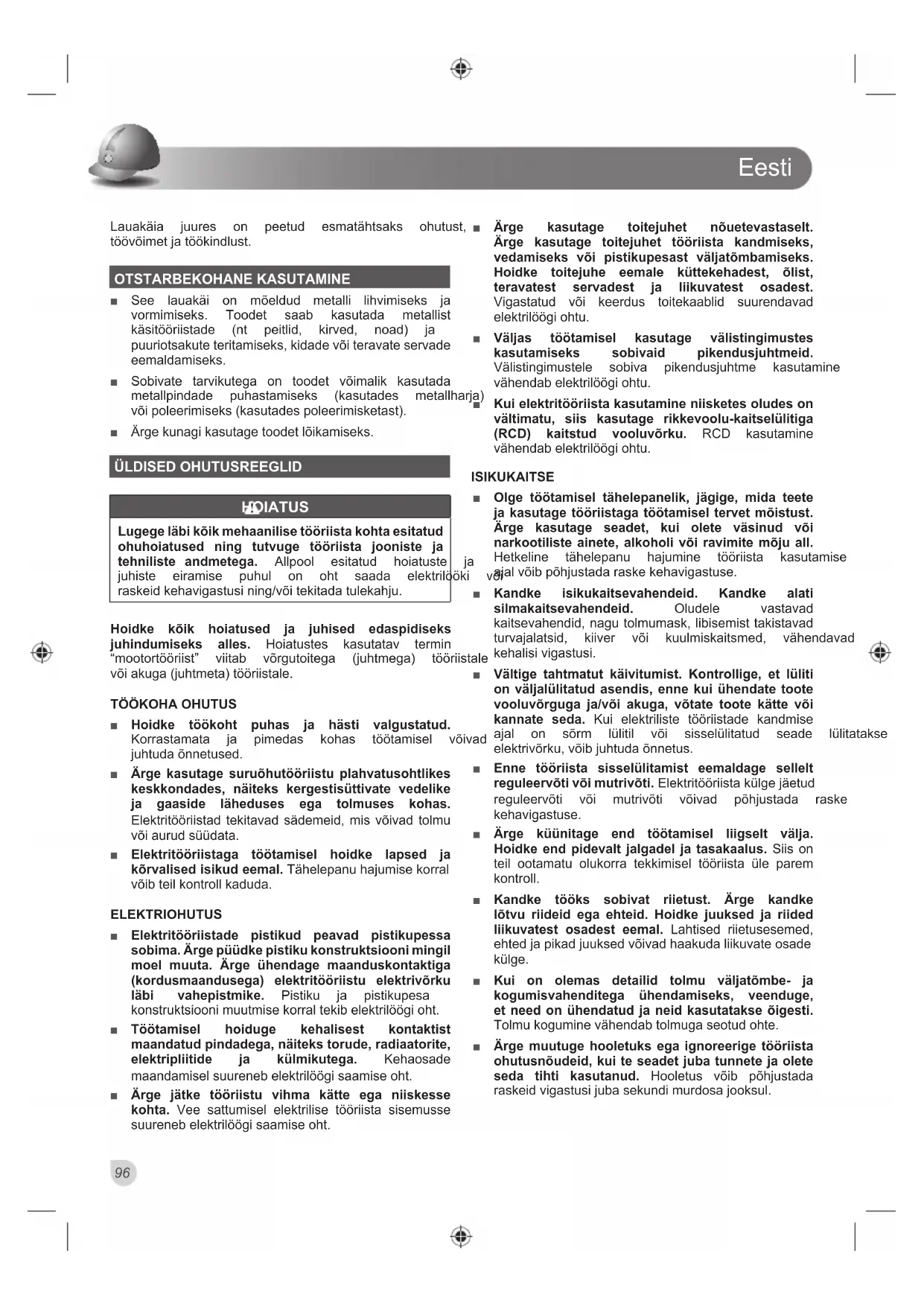 või poleerimiseks (kasutades poleerimisketast). Ŷ Ärge kunagi kasutage toodet lõikamiseks. ÜLDISED OHUTUSREEGLID HOIATUS Lugege läbi kõik mehaanilise tööriista kohta esitatud ohuhoiatused ning tutvuge tööriista jooniste ja tehniliste andmetega. $OOSRRO HVLWDWXG KRLDWXVWH MD MXKLVWH HLUDPLVH SXKXO RQ RKW VDDGD HOHNWULO||NL Y}L UDVNHLGNHKDYLJDVWXVLQLQJY}LWHNLWDGDWXOHNDKMX Hoidke kõik hoiatused ja juhised edaspidiseks juhindumiseks alles. Hoiatustes kasutatav termin ³PRRWRUW||ULLVW´ YLLWDE Y}UJXWRLWHJD MXKWPHJD W||ULLVWDOH