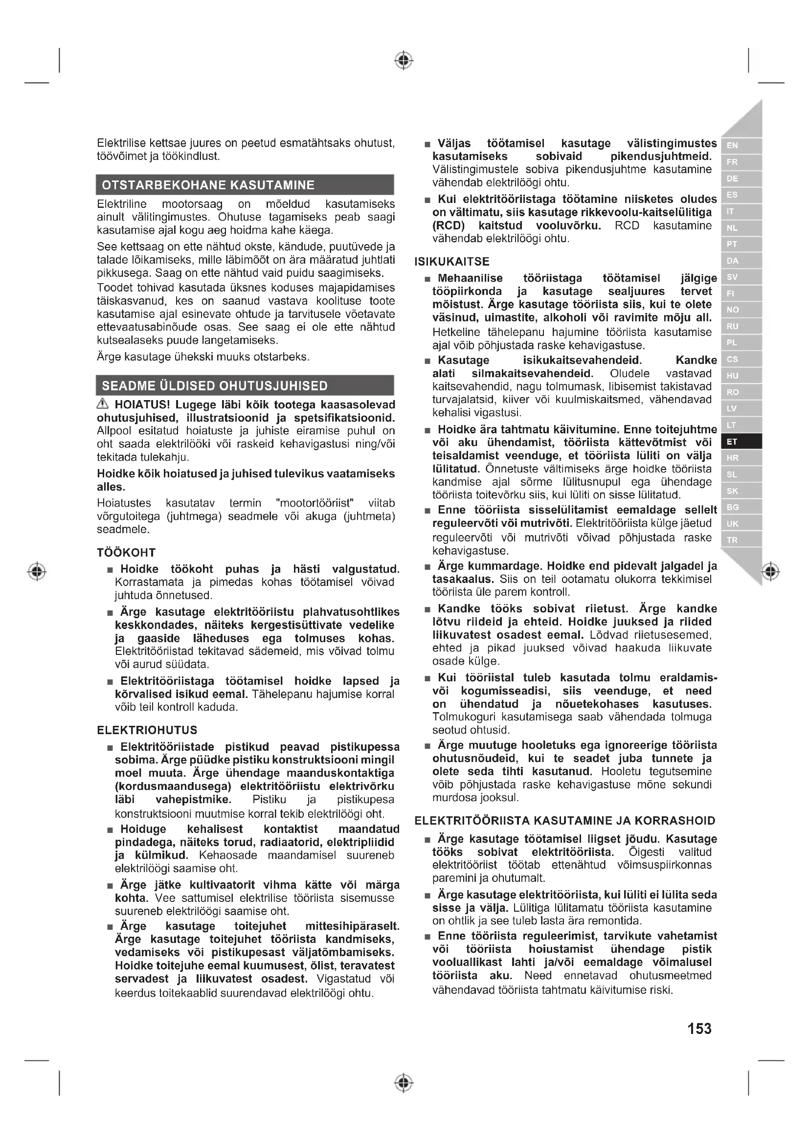 ■ Kettsaagide kasutamiseks, ohtude vältimiseks, esmaabiks ja hooldamiseks peate läbima professionaalselt korraldatud ohutustehnika kursused. Hoidke juhend edaspidiseks kasutamiseks alles. ■ Kettsaed on potentsiaalselt ohtlikud tööriistad. Kettsaega seotud õnnetused lõpevad tihti jäseme kaotuse või surmaga. Surma võib saada okste langemise, puude ümberkukkumise ja veerevate palkide tõttu. Täiendavat ohtu kujutavad haiged ja mädanenud puud. Hinnake oma võimet tööd ohutult teha. Kui teil on kahtlusi, jätke see kutselistele saagijatele. ■ Voolutõuked põhjustavad pingekõikumisi ja võivad mõjutada samasse toiteahelasse ühendatud elektriseadmete tööd. Ühendage seade toitevõrku, mille näivtakistus on 0,33 Ω või vähem, et pingekõikumisi minimeerida. Lisateabe saamiseks võtke ühendust oma elektritarnijaga. ■ Ärge saagige väätisid ja/või peenikest alusmetsa (peenemat kui 75 mm). ■ Enne iga kasutuskorda kontrollige toitejuhe üle vigastuste suhtes. Kui toitejuhe on kahjustatud, peab võimalike ohtude vältimiseks selle välja vahetama ametliku teeninduskeskuse kvalifitseeritud tehnik. ■ Elektriline tööriist tuleb ühendada vooluvõrku läbi rikkevoolu-kaitselüliti (RCD), mille rakendumisvoolu tugevus on maksimaalselt 30 mA. ■ Veenduge, et toitejuhe asetseb nii, et see ei saa teravate esemete sisselõike tõttu vigastada, sellele ei saa peale astuda, komistada ja see ei saa mingil muul viisil vigastada ega sattuda tõmbepinge alla. ■ Kui kasutate saagi esimest korda, on soovitatav on saagida ümarmaterjali saepukil või vastaval alusel. ■ Tööplatsi suurus sõltub töö iseloomust ja puu või muu saetava eseme suurusest. Näiteks puude langetamine nõuab rohkem tööruumi kui seda on vaja muudel lõikamistoimingutel, näiteks järkamisel. Saagija peab olema ettevaatlik ja jälgima kõike, mis toimub tööpiirkonnas. ■ Ärge hoidke oma keha samal joonel juhtlati ja ketiga. Kui tekib tagasilöök, aitab see ära hoida keti kokkupuudet teie pea või kehaga. ■ Ärge kasutage edasi-tagasi saeliigutust. Laske ketil oma tööd teha. Hoidke kett terav ja ärge püüdke suruda ketti lõikest läbi. ■ Saagimise lõppjärgus ärge avaldage enam survet. Olge valmis hoidma saagi hetkel, kui see läbistab puu. Muidu võite saada raske kehavigastuse. ■ Ärge peatage saagi saagimisoperatsiooni keskel. Laske sael töötada kuni see on lõikest välja võetud. ■ Et vähendada liikuvate osadega kokkupuutumisest tingitud vigastuste ohtu, peatage alati mootor, aktiveerige ketipidur ja eemaldage pistik vooluvõrgust. Veenduge, et kõik masina liikuvad osad on täielikult seiskunud: ● enne puhastamist ja ummistuse kõrvaldamist ● enne toote juurest lahkumist ● enne tarvikute paigaldamist ja eemaldamist ● enne seadme kontrollimist, hooldamist ja sellega töötamist. ■ Seadme pikaajalisel kasutamisel võite saada kehavigastusi ja varasemad vigastused võivad süveneda. Seadme kasutamisel pika aja jooksul tuleb teha korralisi vaheaegasid. ■ Kui seade on maha kukkunud, saanud tugeva löögi või hakkab ebanormaalselt vibreerima, seisake seade viivitamatult ja kontrollige see üle vigastuste suhtes. Kõik vigastused tuleb lasta volitatud hooldustöökojas parandada või asendada. ■ Kasutage toodet ainult temperatuurivahemikus 0–40 °C. ■ Hoidke toodet kohas, kus keskkonna temperatuur on vahemikus -10°C–50 °C. ISIKUKAITSEVAHENDID Hea kvaliteediga isikukaitsevahendid, mida kasutavad tavaliselt spetsialistid, aitavad vähendada käitleja vigastumisohtu. Kettsae kasutamisel kasutage järgmisi isikukaitsevahendeid: ■ Kaitsekiiver – peab vastama standardi EN 397 nõuetele ja olema CE-märgisega ■ Kuulmiskaitsevahendid – peab vastama standardi EN 352-1 nõuetele ja olema CE-märgisega ■ Silma- ja kuulmiskaitsevahendid – peavad olema CE-märgisega ja vastama standardi EN 166 nõuetele (turvaprillid) või standardi EN 1731 nõuetele (võrkvisiir) ■ Kaitsekindad – peab vastama standardi EN381-7 nõuetele ja olema CE-märgisega ■ Jalgakaitsed (säärised) – peavad vastama standardi EN381-5 nõuetele, olema CE-märgisega ja tagama üldkaitse. ■ Saagija turvajalatsid – peavad vastama standardi EN ISO 20345:2004 nõuetele ja peavad olema markeeritud kettsae sümboliga, mis näitab vastavust standardile EN 381-3. (Hooajalised kasutajad võivad kasutada terasest ninakaitsega turvasaapaid ja kaitsesääriseid, mis vastavad standardi EN 381-9 nõuetele, kui maapind on tasane, kukkumisoht on minimaalne ning puudub alusmets) ■ Saagija turvajakk – peab vastama standardi EN 381-11 nõuetele ja olema CE-märgisega