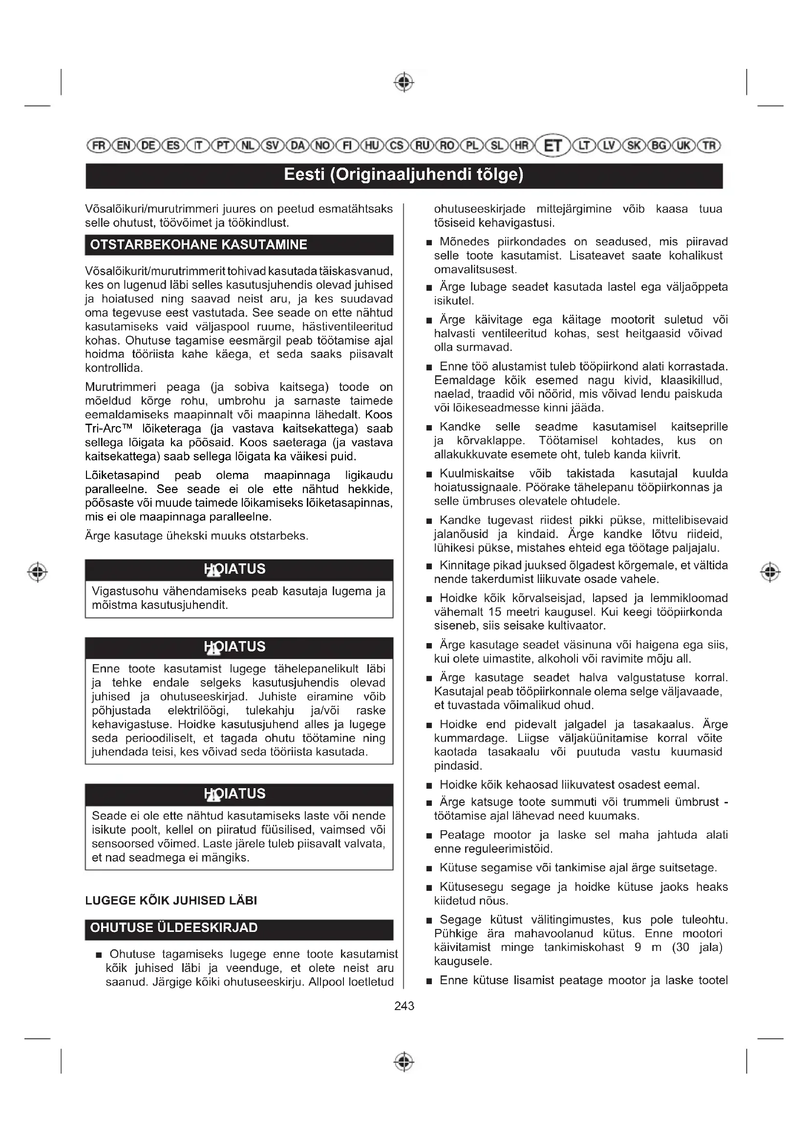 UPOZORENJE Čep za gorivo na koji istječe gorivo je opasnost od požara i mora se odmah zamijeniti. Čep za gorivo sadrži fi ltar koji se ne servisira i zaporni ventil. Začepljeni fi ltar za gorivo dovodi do slabog rada motora. Ako se poboljša rad motora kada se olabavi čep za gorivo, možda je zaporni ventil u kvaru ili je začepljen fi ltar. Po potrebi zamijenite čep za gorivo. SVJEĆICA Ovaj motor koristi svjećice L8RTF/NHSP LD, ili L8RTF/ BOSCH ili svjećice jednakih karakteristika, s razmakom između elektroda od 0,5 mm. Koristite točne zamjene. UPOZORENJE Pazite da dobro umetnete svjećicu Narezivanje u presjeku ozbiljno oštećuje motor.243 Eesti (Originaaljuhendi tõlge) Võsalõikuri/murutrimmeri juures on peetud esmatähtsaks selle ohutust, töövõimet ja töökindlust. OTSTARBEKOHANE KASUTAMINE Võsalõikurit/murutrimmerit tohivad kasutada täiskasvanud, kes on lugenud läbi selles kasutusjuhendis olevad juhised ja hoiatused ning saavad neist aru, ja kes suudavad oma tegevuse eest vastutada. See seade on ette nähtud kasutamiseks vaid väljaspool ruume, hästiventileeritud kohas. Ohutuse tagamise eesmärgil peab töötamise ajal hoidma tööriista kahe käega, et seda saaks piisavalt kontrollida. Murutrimmeri peaga (ja sobiva kaitsega) toode on mõeldud kõrge rohu, umbrohu ja sarnaste taimede eemaldamiseks maapinnalt või maapinna lähedalt. Koos Tri-Arc™ lõiketeraga (ja vastava kaitsekattega) saab sellega lõigata ka põõsaid. Koos saeteraga (ja vastava kaitsekattega) saab sellega lõigata ka väikesi puid. Lõiketasapind peab olema maapinnaga ligikaudu paralleelne. See seade ei ole ette nähtud hekkide, põõsaste või muude taimede lõikamiseks lõiketasapinnas, mis ei ole maapinnaga paralleelne. Ärge kasutage ühekski muuks otstarbeks. HOIATUS Vigastusohu vähendamiseks peab kasutaja lugema ja mõistma kasutusjuhendit. HOIATUS Enne toote kasutamist lugege tähelepanelikult läbi ja tehke endale selgeks kasutusjuhendis olevad juhised ja ohutuseeskirjad. Juhiste eiramine võib põhjustada elektrilöögi, tulekahju ja/või raske kehavigastuse. Hoidke kasutusjuhend alles ja lugege seda perioodiliselt, et tagada ohutu töötamine ning juhendada teisi, kes võivad seda tööriista kasutada. HOIATUS Seade ei ole ette nähtud kasutamiseks laste või nende isikute poolt, kellel on piiratud füüsilised, vaimsed või sensoorsed võimed. Laste järele tuleb piisavalt valvata, et nad seadmega ei mängiks.