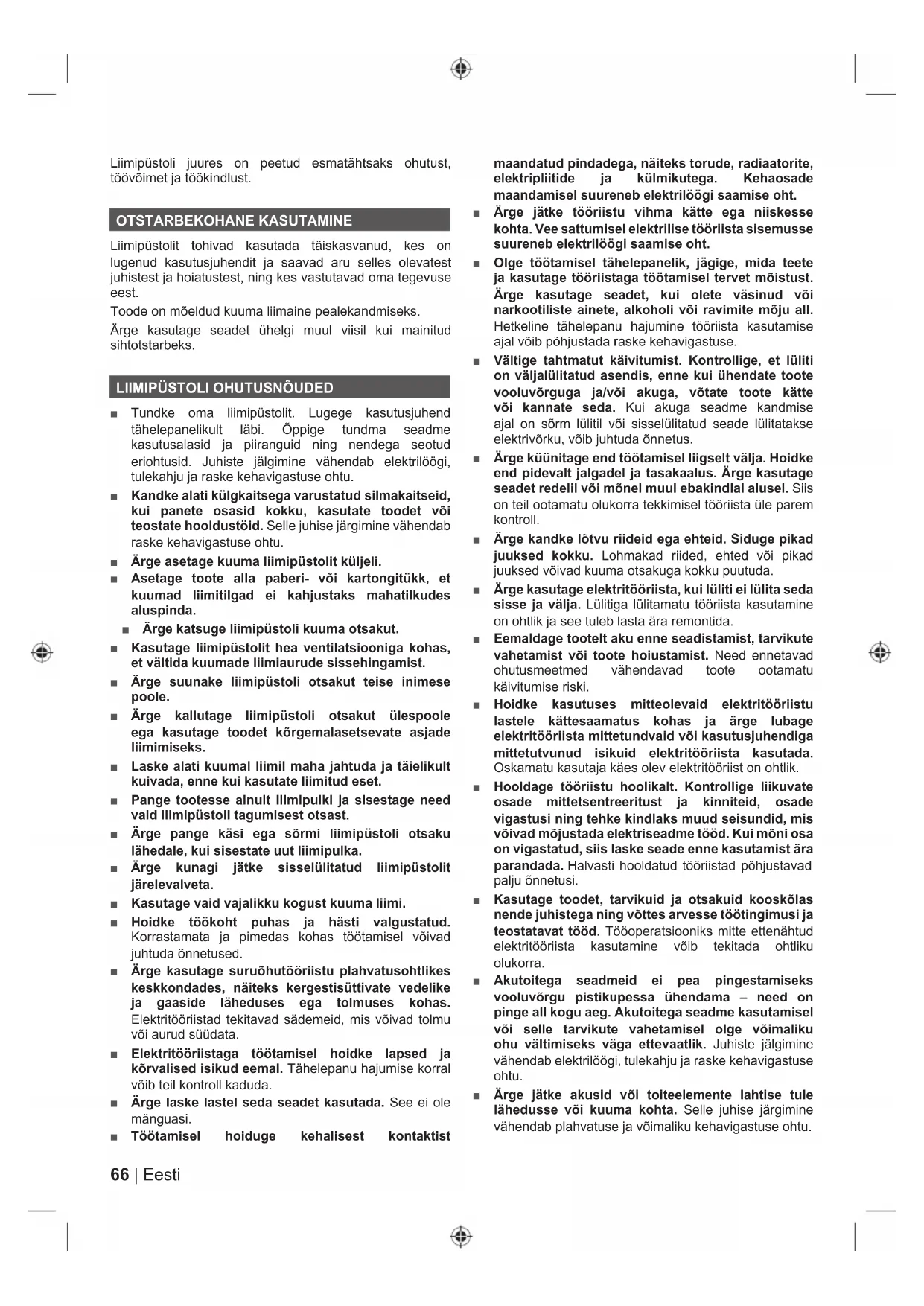 ■ Tundke oma liimipüstolit. Lugege kasutusjuhend tähelepanelikult läbi. Õppige tundma seadme kasutusalasid ja piiranguid ning nendega seotud eriohtusid. Juhiste jälgimine vähendab elektrilöögi, tulekahju ja raske kehavigastuse ohtu. ■ Kandke alati külgkaitsega varustatud silmakaitseid, kui panete osasid kokku, kasutate toodet või teostate hooldustöid. Selle juhise järgimine vähendab raske kehavigastuse ohtu. ■ Ärge asetage kuuma liimipüstolit küljeli. ■ Asetage toote alla paberi- või kartongitükk, et kuumad liimitilgad ei kahjustaks mahatilkudes aluspinda. ■ Ärge katsuge liimipüstoli kuuma otsakut. ■ Kasutage liimipüstolit hea ventilatsiooniga kohas, et vältida kuumade liimiaurude sissehingamist. ■ Ärge suunake liimipüstoli otsakut teise inimese poole. ■ Ärge kallutage liimipüstoli otsakut ülespoole ega kasutage toodet kõrgemalasetsevate asjade liimimiseks. ■ Laske alati kuumal liimil maha jahtuda ja täielikult kuivada, enne kui kasutate liimitud eset. ■ Pange tootesse ainult liimipulki ja sisestage need vaid liimipüstoli tagumisest otsast. ■ Ärge pange käsi ega sõrmi liimipüstoli otsaku lähedale, kui sisestate uut liimipulka. ■ Ärge kunagi jätke sisselülitatud liimipüstolit järelevalveta. ■ Kasutage vaid vajalikku kogust kuuma liimi. ■ Hoidke töökoht puhas ja hästi valgustatud. Korrastamata ja pimedas kohas töötamisel võivad juhtuda õnnetused. ■ Ärge kasutage suruõhutööriistu plahvatusohtlikes keskkondades, näiteks kergestisüttivate vedelike ja gaaside läheduses ega tolmuses kohas. Elektritööriistad tekitavad sädemeid, mis võivad tolmu või aurud süüdata. ■ Elektritööriistaga töötamisel hoidke lapsed ja kõrvalised isikud eemal. Tähelepanu hajumise korral võib teil kontroll kaduda. ■ Ärge laske lastel seda seadet kasutada. See ei ole mänguasi. ■ Töötamisel hoiduge kehalisest kontaktist maandatud pindadega, näiteks torude, radiaatorite, elektripliitide ja külmikutega. Kehaosade maandamisel suureneb elektrilöögi saamise oht. ■ Ärge jätke tööriistu vihma kätte ega niiskesse kohta. Vee sattumisel elektrilise tööriista sisemusse suureneb elektrilöögi saamise oht. ■ Olge töötamisel tähelepanelik, jägige, mida teete ja kasutage tööriistaga töötamisel tervet mõistust. Ärge kasutage seadet, kui olete väsinud või narkootiliste ainete, alkoholi või ravimite mõju all. Hetkeline tähelepanu hajumine tööriista kasutamise ajal võib põhjustada raske kehavigastuse. ■ Vältige tahtmatut käivitumist. Kontrollige, et lüliti on väljalülitatud asendis, enne kui ühendate toote vooluvõrguga ja/või akuga, võtate toote kätte või kannate seda. Kui akuga seadme kandmise ajal on sõrm lülitil või sisselülitatud seade lülitatakse elektrivõrku, võib juhtuda õnnetus. ■ Ärge küünitage end töötamisel liigselt välja. Hoidke end pidevalt jalgadel ja tasakaalus. Ärge kasutage seadet redelil või mõnel muul ebakindlal alusel. Siis on teil ootamatu olukorra tekkimisel tööriista üle parem kontroll. ■ Ärge kandke lõtvu riideid ega ehteid. Siduge pikad juuksed kokku. Lohmakad riided, ehted või pikad juuksed võivad kuuma otsakuga kokku puutuda. ■ Ärge kasutage elektritööriista, kui lüliti ei lülita seda sisse ja välja. Lülitiga lülitamatu tööriista kasutamine on ohtlik ja see tuleb lasta ära remontida. ■ Eemaldage tootelt aku enne seadistamist, tarvikute vahetamist või toote hoiustamist. Need ennetavad ohutusmeetmed vähendavad toote ootamatu käivitumise riski. ■ Hoidke kasutuses mitteolevaid elektritööriistu lastele kättesaamatus kohas ja ärge lubage elektritööriista mittetundvaid või kasutusjuhendiga mittetutvunud isikuid elektritööriista kasutada. Oskamatu kasutaja käes olev elektritööriist on ohtlik. ■ Hooldage tööriistu hoolikalt. Kontrollige liikuvate osade mittetsentreeritust ja kinniteid, osade vigastusi ning tehke kindlaks muud seisundid, mis võivad mõjustada elektriseadme tööd. Kui mõni osa on vigastatud, siis laske seade enne kasutamist ära parandada. Halvasti hooldatud tööriistad põhjustavad palju õnnetusi. ■ Kasutage toodet, tarvikuid ja otsakuid kooskõlas nende juhistega ning võttes arvesse töötingimusi ja teostatavat tööd. Tööoperatsiooniks mitte ettenähtud elektritööriista kasutamine võib tekitada ohtliku olukorra. ■ Akutoitega seadmeid ei pea pingestamiseks vooluvõrgu pistikupessa ühendama – need on pinge all kogu aeg. Akutoitega seadme kasutamisel või selle tarvikute vahetamisel olge võimaliku ohu vältimiseks väga ettevaatlik. Juhiste jälgimine vähendab elektrilöögi, tulekahju ja raske kehavigastuse ohtu. ■ Ärge jätke akusid või toiteelemente lahtise tule lähedusse või kuuma kohta. Selle juhise järgimine vähendab plahvatuse ja võimaliku kehavigastuse ohtu.67 Eesti |