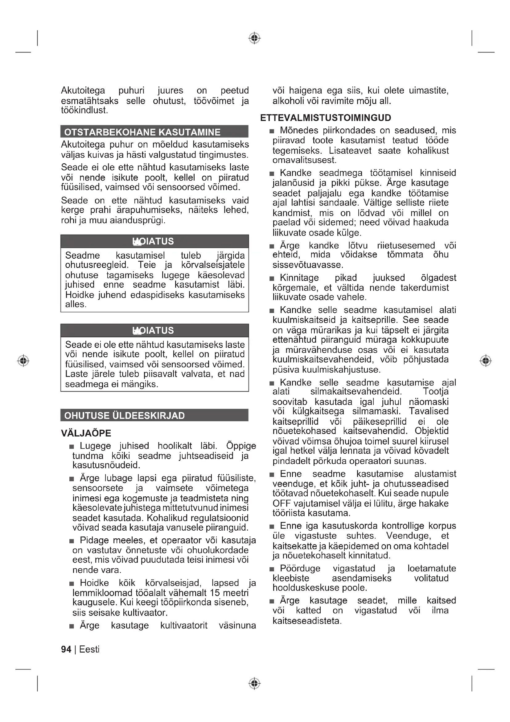 ■ Lugege juhised hoolikalt läbi. Õppige tundma kõiki seadme juhtseadiseid ja kasutusnõudeid. ■ Ärge lubage lapsi ega piiratud füüsiliste, sensoorsete ja vaimsete võimetega inimesi ega kogemuste ja teadmisteta ning käesolevate juhistega mittetutvunud inimesi seadet kasutada. Kohalikud regulatsioonid võivad seada kasutaja vanusele piiranguid. ■ Pidage meeles, et operaator või kasutaja on vastutav õnnetuste või ohuolukordade eest, mis võivad puudutada teisi inimesi või nende vara. ■ Hoidke kõik kõrvalseisjad, lapsed ja lemmikloomad tööalalt vähemalt 15 meetri kaugusele. Kui keegi tööpiirkonda siseneb, siis seisake kultivaator. ■ Ärge kasutage kultivaatorit väsinuna või haigena ega siis, kui olete uimastite, alkoholi või ravimite mõju all. ETTEVALMISTUSTOIMINGUD ■ Mõnedes piirkondades on seadused, mis piiravad toote kasutamist teatud tööde tegemiseks. Lisateavet saate kohalikust omavalitsusest. ■ Kandke seadmega töötamisel kinniseid jalanõusid ja pikki pükse. Ärge kasutage seadet paljajalu ega kandke töötamise ajal lahtisi sandaale. Vältige selliste riiete kandmist, mis on lõdvad või millel on paelad või sidemed; need võivad haakuda liikuvate osade külge. ■ Ärge kandke lõtvu riietusesemed või ehteid, mida võidakse tõmmata õhu sissevõtuavasse. ■ Kinnitage pikad juuksed õlgadest kõrgemale, et vältida nende takerdumist liikuvate osade vahele. ■ Kandke selle seadme kasutamisel alati kuulmiskaitseid ja kaitseprille. See seade on väga mürarikas ja kui täpselt ei järgita ettenähtud piiranguid müraga kokkupuute ja müravähenduse osas või ei kasutata kuulmiskaitsevahendeid, võib põhjustada püsiva kuulmiskahjustuse. ■ Kandke selle seadme kasutamise ajal alati silmakaitsevahendeid. Tootja soovitab kasutada igal juhul näomaski või külgkaitsega silmamaski. Tavalised kaitseprillid või päikeseprillid ei ole nõuetekohased kaitsevahendid. Objektid võivad võimsa õhujoa toimel suurel kiirusel igal hetkel välja lennata ja võivad kõvadelt pindadelt põrkuda operaatori suunas. ■ Enne seadme kasutamise alustamist veenduge, et kõik juht- ja ohutusseadised töötavad nõuetekohaselt. Kui seade nupule OFF vajutamisel välja ei lülitu, ärge hakake tööriista kasutama. ■ Enne iga kasutuskorda kontrollige korpus üle vigastuste suhtes. Veenduge, et kaitsekatte ja käepidemed on oma kohtadel ja nõuetekohaselt kinnitatud. ■ Pöörduge vigastatud ja loetamatute kleebiste asendamiseks volitatud hoolduskeskuse poole. ■ Ärge kasutage seadet, mille kaitsed või katted on vigastatud või ilma kaitseseadisteta.95 Eesti |