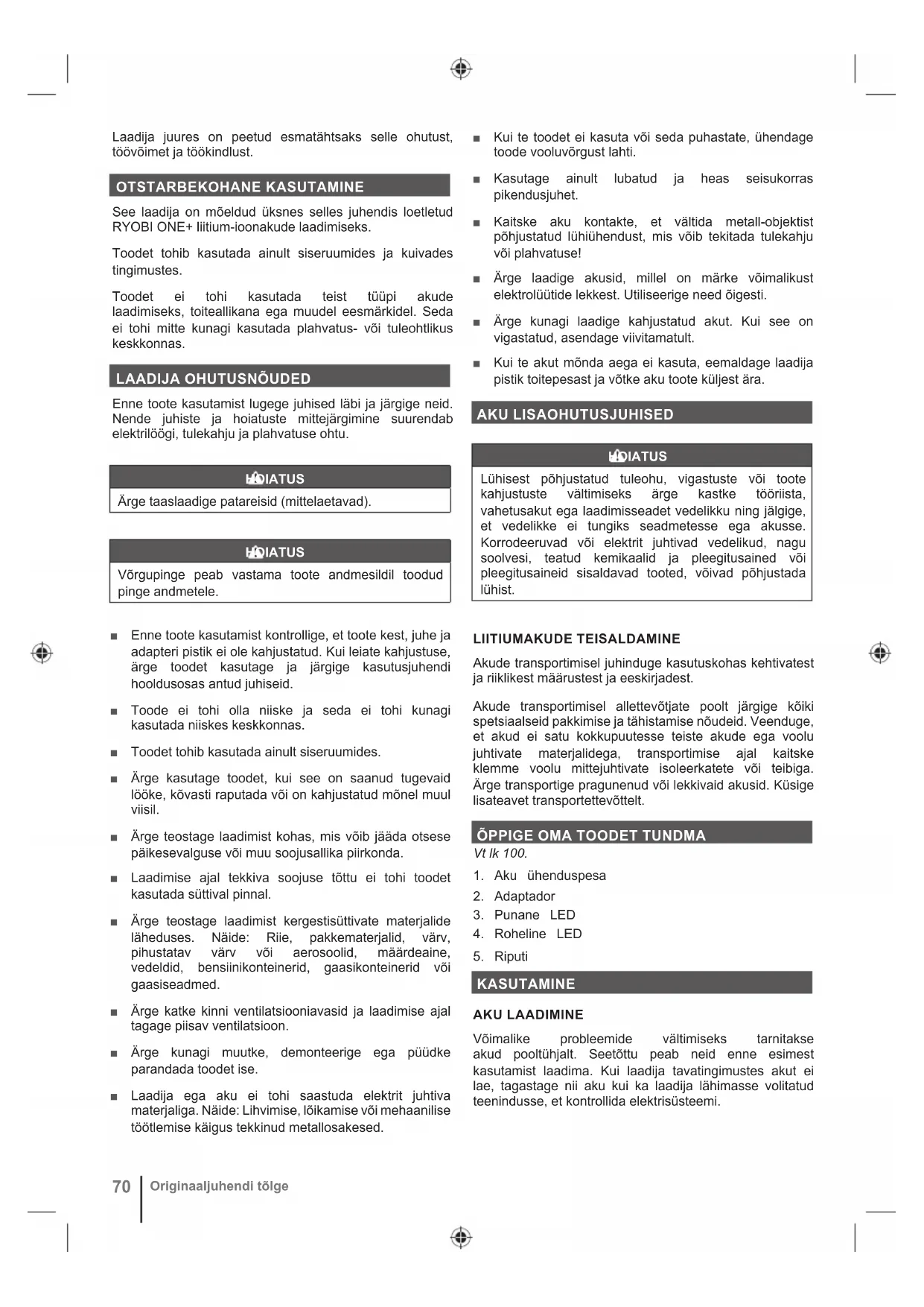 Enne toote kasutamist lugege juhised läbi ja järgige neid. Nende juhiste ja hoiatuste mittejärgimine suurendab elektrilöögi, tulekahju ja plahvatuse ohtu. HOIATUS Ärge taaslaadige patareisid (mittelaetavad). HOIATUS Võrgupinge peab vastama toote andmesildil toodud pinge andmetele. Ŷ Enne toote kasutamist kontrollige, et toote kest, juhe ja adapteri pistik ei ole kahjustatud. Kui leiate kahjustuse, ärge toodet kasutage ja järgige kasutusjuhendi hooldusosas antud juhiseid. Ŷ Toode ei tohi olla niiske ja seda ei tohi kunagi kasutada niiskes keskkonnas. Ŷ Toodet tohib kasutada ainult siseruumides. Ŷ Ärge kasutage toodet, kui see on saanud tugevaid lööke, kõvasti raputada või on kahjustatud mõnel muul viisil. Ŷ Ärge teostage laadimist kohas, mis võib jääda otsese päikesevalguse või muu soojusallika piirkonda. Ŷ Laadimise ajal tekkiva soojuse tõttu ei tohi toodet kasutada süttival pinnal. Ŷ Ärge teostage laadimist kergestisüttivate materjalide läheduses. Näide: Riie, pakkematerjalid, värv, pihustatav värv või aerosoolid, määrdeaine, vedeldid, bensiinikonteinerid, gaasikonteinerid või gaasiseadmed. Ŷ Ärge katke kinni ventilatsiooniavasid ja laadimise ajal tagage piisav ventilatsioon. Ŷ Ärge kunagi muutke, demonteerige ega püüdke parandada toodet ise. Ŷ Laadija ega aku ei tohi saastuda elektrit juhtiva materjaliga. Näide: Lihvimise, lõikamise või mehaanilise töötlemise käigus tekkinud metallosakesed. Ŷ Kui te toodet ei kasuta või seda puhastate, ühendage toode vooluvõrgust lahti. Ŷ Kasutage ainult lubatud ja heas seisukorras pikendusjuhet. Ŷ Kaitske aku kontakte, et vältida metall-objektist põhjustatud lühiühendust, mis võib tekitada tulekahju või plahvatuse! Ŷ Ärge laadige akusid, millel on märke võimalikust elektrolüütide lekkest. Utiliseerige need õigesti. Ŷ Ärge kunagi laadige kahjustatud akut. Kui see on vigastatud, asendage viivitamatult. Ŷ Kui te akut mõnda aega ei kasuta, eemaldage laadija pistik toitepesast ja võtke aku toote küljest ära. AKU LISAOHUTUSJUHISED HOIATUS Lühisest põhjustatud tuleohu, vigastuste või toote kahjustuste vältimiseks ärge kastke tööriista, vahetusakut ega laadimisseadet vedelikku ning jälgige, et vedelikke ei tungiks seadmetesse ega akusse. Korrodeeruvad või elektrit juhtivad vedelikud, nagu soolvesi, teatud kemikaalid ja pleegitusained või pleegitusaineid sisaldavad tooted, võivad põhjustada lühist. LIITIUMAKUDE TEISALDAMINE Akude transportimisel juhinduge kasutuskohas kehtivatest ja riiklikest määrustest ja eeskirjadest. Akude transportimisel allettevõtjate poolt järgige kõiki spetsiaalseid pakkimise ja tähistamise nõudeid. Veenduge, et akud ei satu kokkupuutesse teiste akude ega voolu juhtivate materjalidega, transportimise ajal kaitske klemme voolu mittejuhtivate isoleerkatete või teibiga. Ärge transportige pragunenud või lekkivaid akusid. Küsige lisateavet transportettevõttelt.