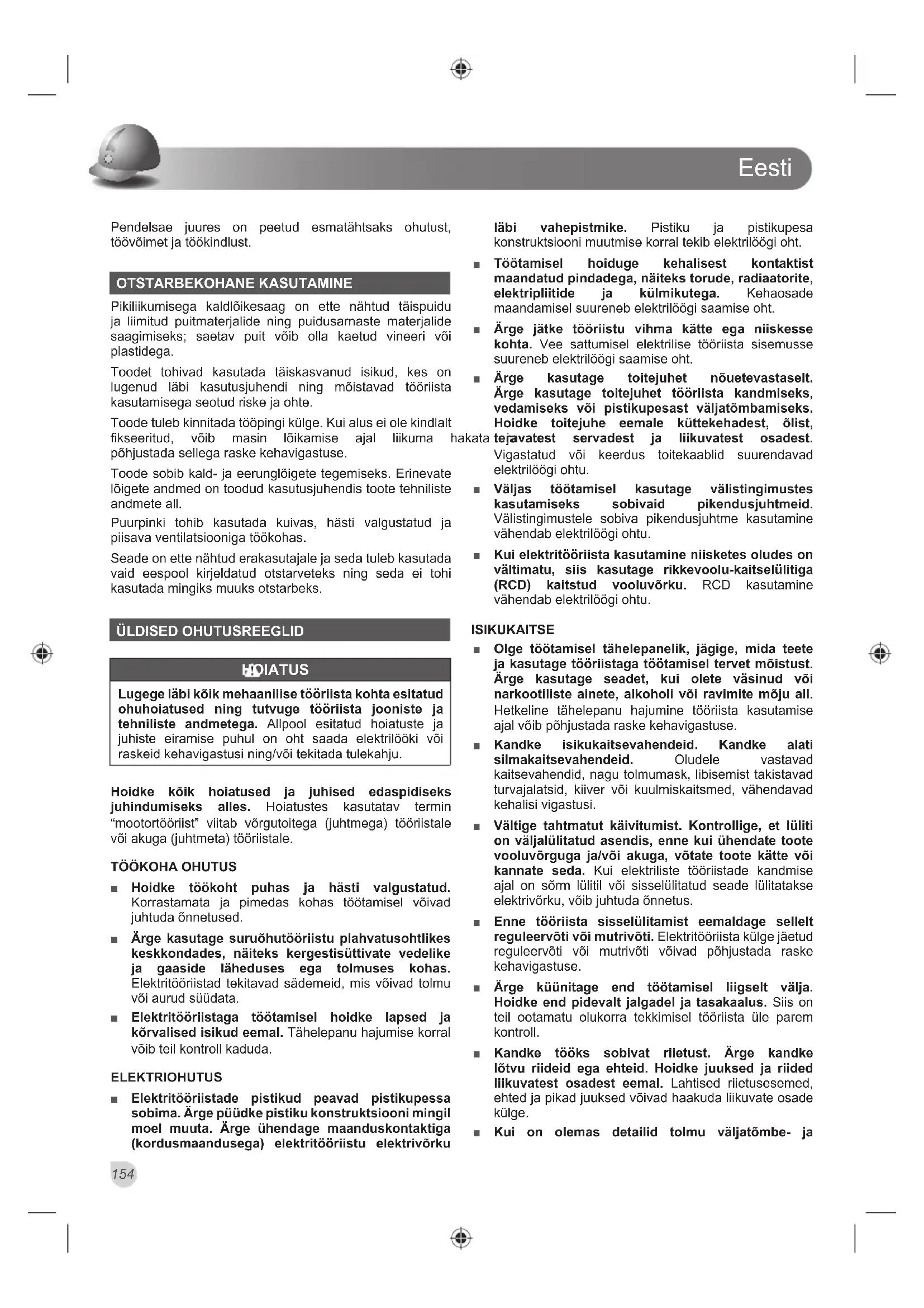 Pendelsae juures on peetud esmatähtsaks ohutust, töövõimet ja töökindlust. OTSTARBEKOHANE KASUTAMINE Pikiliikumisega kaldlõikesaag on ette nähtud täispuidu ja liimitud puitmaterjalide ning puidusarnaste materjalide saagimiseks; saetav puit võib olla kaetud vineeri või plastidega. Toodet tohivad kasutada täiskasvanud isikud, kes on lugenud läbi kasutusjuhendi ning mõistavad tööriista kasutamisega seotud riske ja ohte. Toode tuleb kinnitada tööpingi külge. Kui alus ei ole kindlalt ¿NVHHULWXG Y}LE PDVLQ O}LNDPLVH DMDO OLLNXPD KDNDWD MD põhjustada sellega raske kehavigastuse. Toode sobib kald- ja eerunglõigete tegemiseks. Erinevate lõigete andmed on toodud kasutusjuhendis toote tehniliste andmete all. Puurpinki tohib kasutada kuivas, hästi valgustatud ja piisava ventilatsiooniga töökohas. Seade on ette nähtud erakasutajale ja seda tuleb kasutada vaid eespool kirjeldatud otstarveteks ning seda ei tohi kasutada mingiks muuks otstarbeks. ÜLDISED OHUTUSREEGLID HOIATUS Lugege läbi kõik mehaanilise tööriista kohta esitatud ohuhoiatused ning tutvuge tööriista jooniste ja tehniliste andmetega. Allpool esitatud hoiatuste ja juhiste eiramise puhul on oht saada elektrilööki või UDVNHLGNHKDYLJDVWXVLQLQJY}LWHNLWDGDWXOHNDKMX Hoidke kõik hoiatused ja juhised edaspidiseks juhindumiseks alles. Hoiatustes kasutatav termin “mootortööriist” viitab võrgutoitega (juhtmega) tööriistale või akuga (juhtmeta) tööriistale.