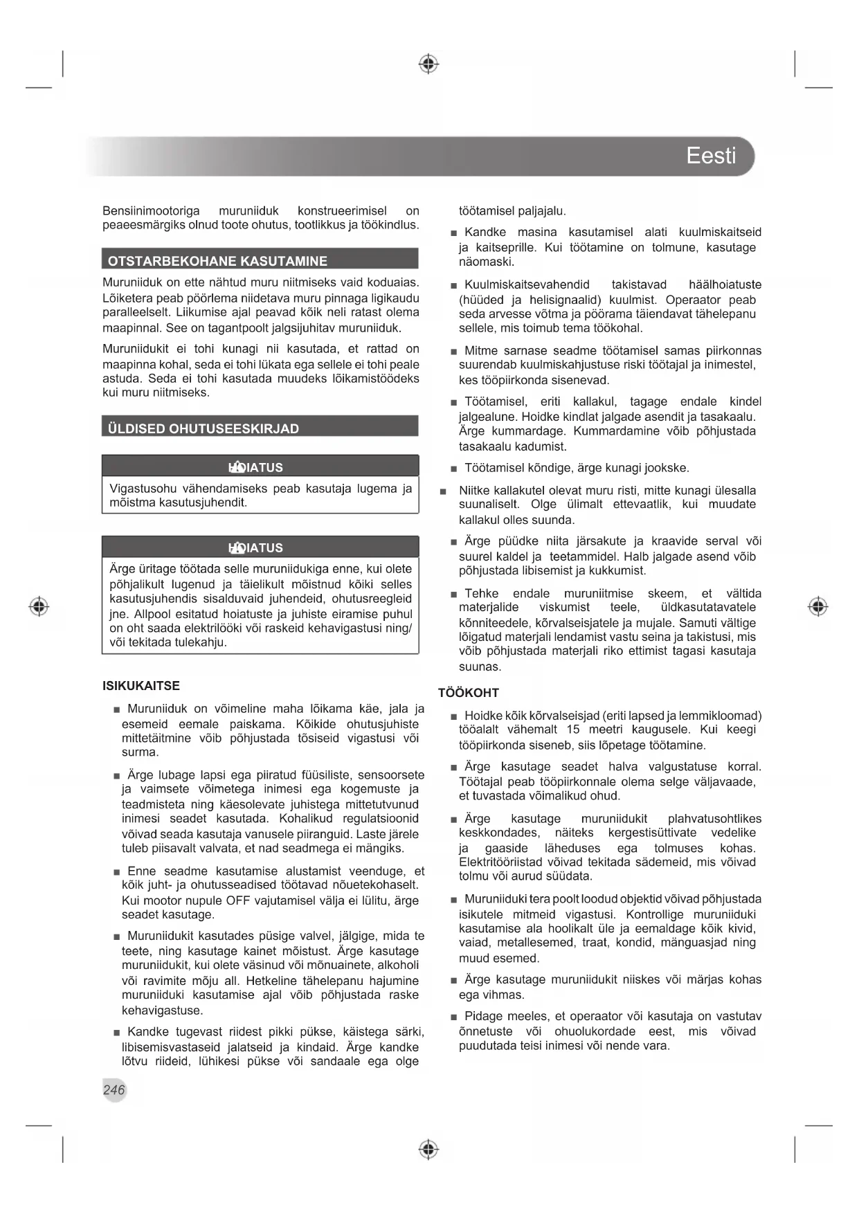 Bensiinimootoriga muruniiduk konstrueerimisel on peaeesmärgiks olnud toote ohutus, tootlikkus ja töökindlus. OTSTARBEKOHANE KASUTAMINE Muruniiduk on ette nähtud muru niitmiseks vaid koduaias. Lõiketera peab pöörlema niidetava muru pinnaga ligikaudu paralleelselt. Liikumise ajal peavad kõik neli ratast olema maapinnal. See on tagantpoolt jalgsijuhitav muruniiduk. Muruniidukit ei tohi kunagi nii kasutada, et rattad on maapinna kohal, seda ei tohi lükata ega sellele ei tohi peale astuda. Seda ei tohi kasutada muudeks lõikamistöödeks kui muru niitmiseks. ÜLDISED OHUTUSEESKIRJAD HOIATUS Vigastusohu vähendamiseks peab kasutaja lugema ja mõistma kasutusjuhendit. HOIATUS Ärge üritage töötada selle muruniidukiga enne, kui olete põhjalikult lugenud ja täielikult mõistnud kõiki selles kasutusjuhendis sisalduvaid juhendeid, ohutusreegleid jne. Allpool esitatud hoiatuste ja juhiste eiramise puhul on oht saada elektrilööki või raskeid kehavigastusi ning/ või tekitada tulekahju. ISIKUKAITSE ■ Muruniiduk on võimeline maha lõikama käe, jala ja esemeid eemale paiskama. Kõikide ohutusjuhiste mittetäitmine võib põhjustada tõsiseid vigastusi või surma. ■ Ärge lubage lapsi ega piiratud füüsiliste, sensoorsete ja vaimsete võimetega inimesi ega kogemuste ja teadmisteta ning käesolevate juhistega mittetutvunud inimesi seadet kasutada. Kohalikud regulatsioonid võivad seada kasutaja vanusele piiranguid. Laste järele tuleb piisavalt valvata, et nad seadmega ei mängiks. ■ Enne seadme kasutamise alustamist veenduge, et kõik juht- ja ohutusseadised töötavad nõuetekohaselt. Kui mootor nupule OFF vajutamisel välja ei lülitu, ärge seadet kasutage. ■ Muruniidukit kasutades püsige valvel, jälgige, mida te teete, ning kasutage kainet mõistust. Ärge kasutage muruniidukit, kui olete väsinud või mõnuainete, alkoholi või ravimite mõju all. Hetkeline tähelepanu hajumine muruniiduki kasutamise ajal võib põhjustada raske kehavigastuse. ■ Kandke tugevast riidest pikki pükse, käistega särki, libisemisvastaseid jalatseid ja kindaid. Ärge kandke lõtvu riideid, lühikesi pükse või sandaale ega olge töötamisel paljajalu. ■ Kandke masina kasutamisel alati kuulmiskaitseid ja kaitseprille. Kui töötamine on tolmune, kasutage näomaski. ■ Kuulmiskaitsevahendid takistavad häälhoiatuste (hüüded ja helisignaalid) kuulmist. Operaator peab seda arvesse võtma ja pöörama täiendavat tähelepanu sellele, mis toimub tema töökohal. ■ Mitme sarnase seadme töötamisel samas piirkonnas suurendab kuulmiskahjustuse riski töötajal ja inimestel, kes tööpiirkonda sisenevad. ■ Töötamisel, eriti kallakul, tagage endale kindel jalgealune. Hoidke kindlat jalgade asendit ja tasakaalu. Ärge kummardage. Kummardamine võib põhjustada tasakaalu kadumist. ■ Töötamisel kõndige, ärge kunagi jookske. ■ Niitke kallakutel olevat muru risti, mitte kunagi ülesalla suunaliselt. Olge ülimalt ettevaatlik, kui muudate kallakul olles suunda. ■ Ärge püüdke niita järsakute ja kraavide serval või suurel kaldel ja teetammidel. Halb jalgade asend võib põhjustada libisemist ja kukkumist. ■ Tehke endale muruniitmise skeem, et vältida materjalide viskumist teele, üldkasutatavatele kõnniteedele, kõrvalseisjatele ja mujale. Samuti vältige lõigatud materjali lendamist vastu seina ja takistusi, mis võib põhjustada materjali riko ettimist tagasi kasutaja suunas. TÖÖKOHT ■ Hoidke kõik kõrvalseisjad (eriti lapsed ja lemmikloomad) tööalalt vähemalt 15 meetri kaugusele. Kui keegi tööpiirkonda siseneb, siis lõpetage töötamine. ■ Ärge kasutage seadet halva valgustatuse korral. Töötajal peab tööpiirkonnale olema selge väljavaade, et tuvastada võimalikud ohud. ■ Ärge kasutage muruniidukit plahvatusohtlikes keskkondades, näiteks kergestisüttivate vedelike ja gaaside läheduses ega tolmuses kohas. Elektritööriistad võivad tekitada sädemeid, mis võivad tolmu või aurud süüdata. ■ Muruniiduki tera poolt loodud objektid võivad põhjustada isikutele mitmeid vigastusi. Kontrollige muruniiduki kasutamise ala hoolikalt üle ja eemaldage kõik kivid, vaiad, metallesemed, traat, kondid, mänguasjad ning muud esemed. ■ Ärge kasutage muruniidukit niiskes või märjas kohas ega vihmas. ■ Pidage meeles, et operaator või kasutaja on vastutav õnnetuste või ohuolukordade eest, mis võivad puudutada teisi inimesi või nende vara.Eesti