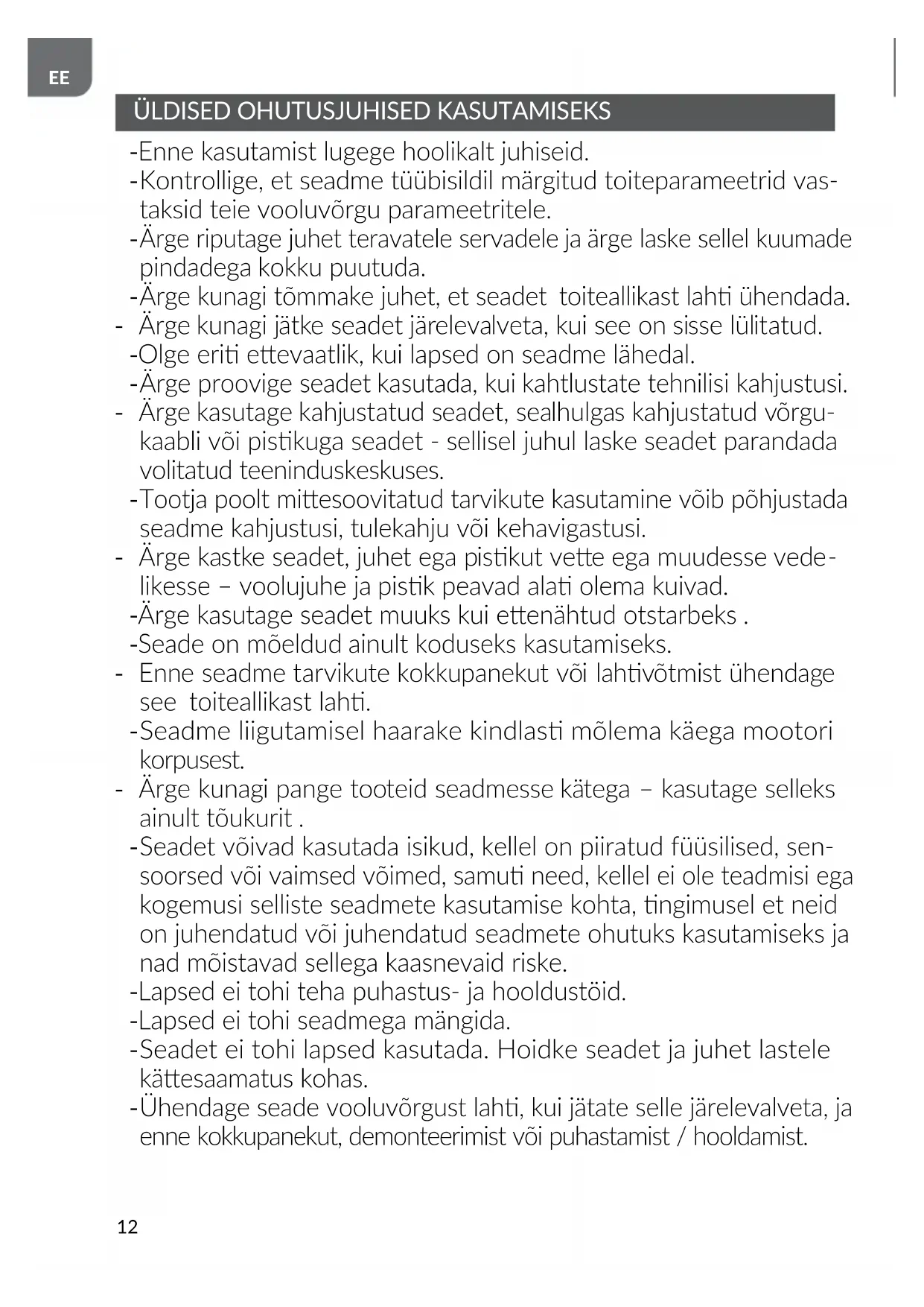 likesse – voolujuhe ja pisk peavad ala olema kuivad. - Ärge kasutage seadet muuks kui eenähtud otstarbeks . - Seade on mõeldud ainult koduseks kasutamiseks. - Enne seadme tarvikute kokkupanekut või lahvõtmist ühendage see toiteallikast lah.