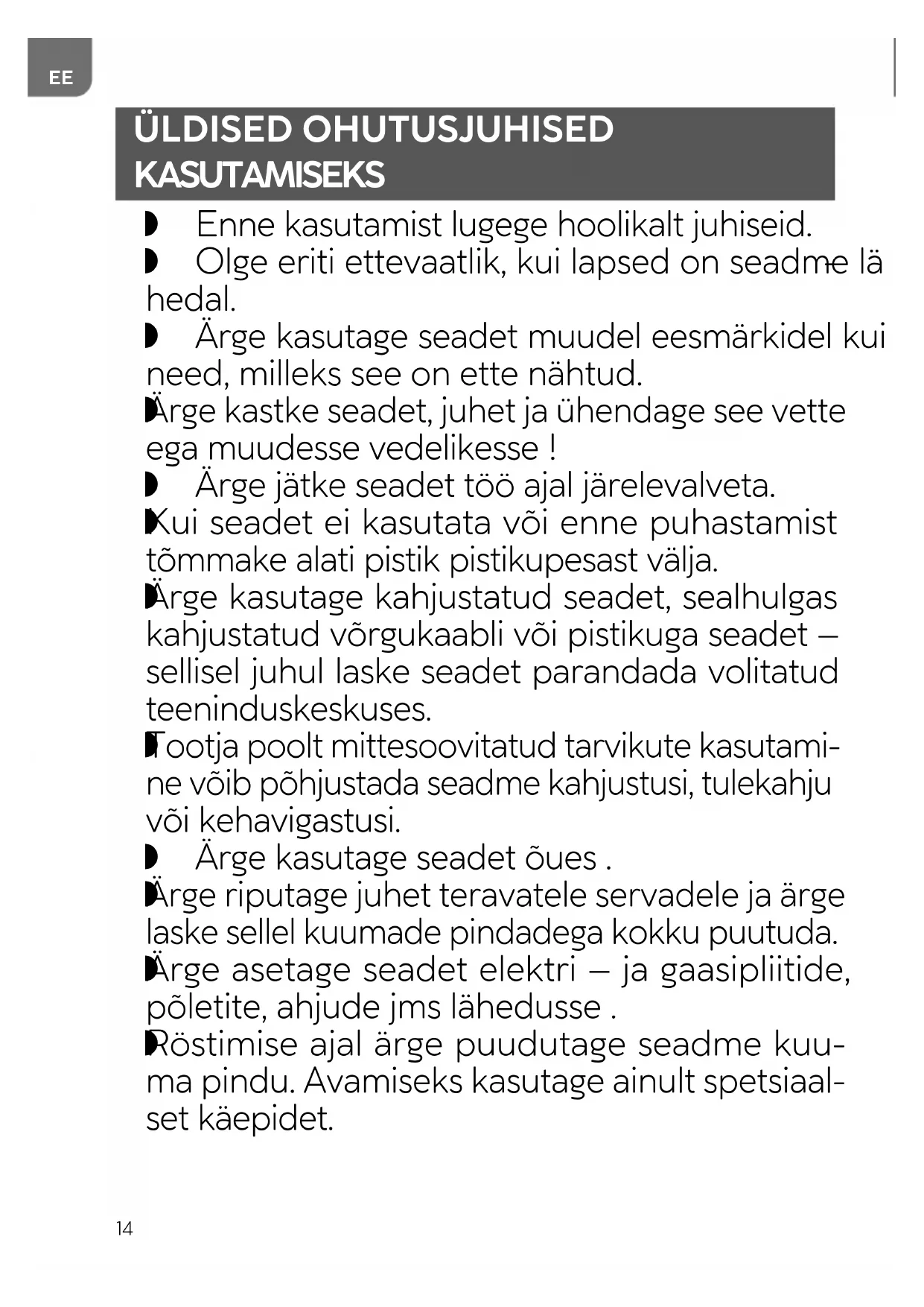 Hoidke seade ja selle toitejuhe alla 8-aastastele lastele kättesaamatus kohas. Lapsed ei tohi seadmega mängida. Juurdepääsetavate pindade temperatuur võib seadme töötamise ajal olla kõrgem. Seade on mõeldud ainult koduseks kasutami