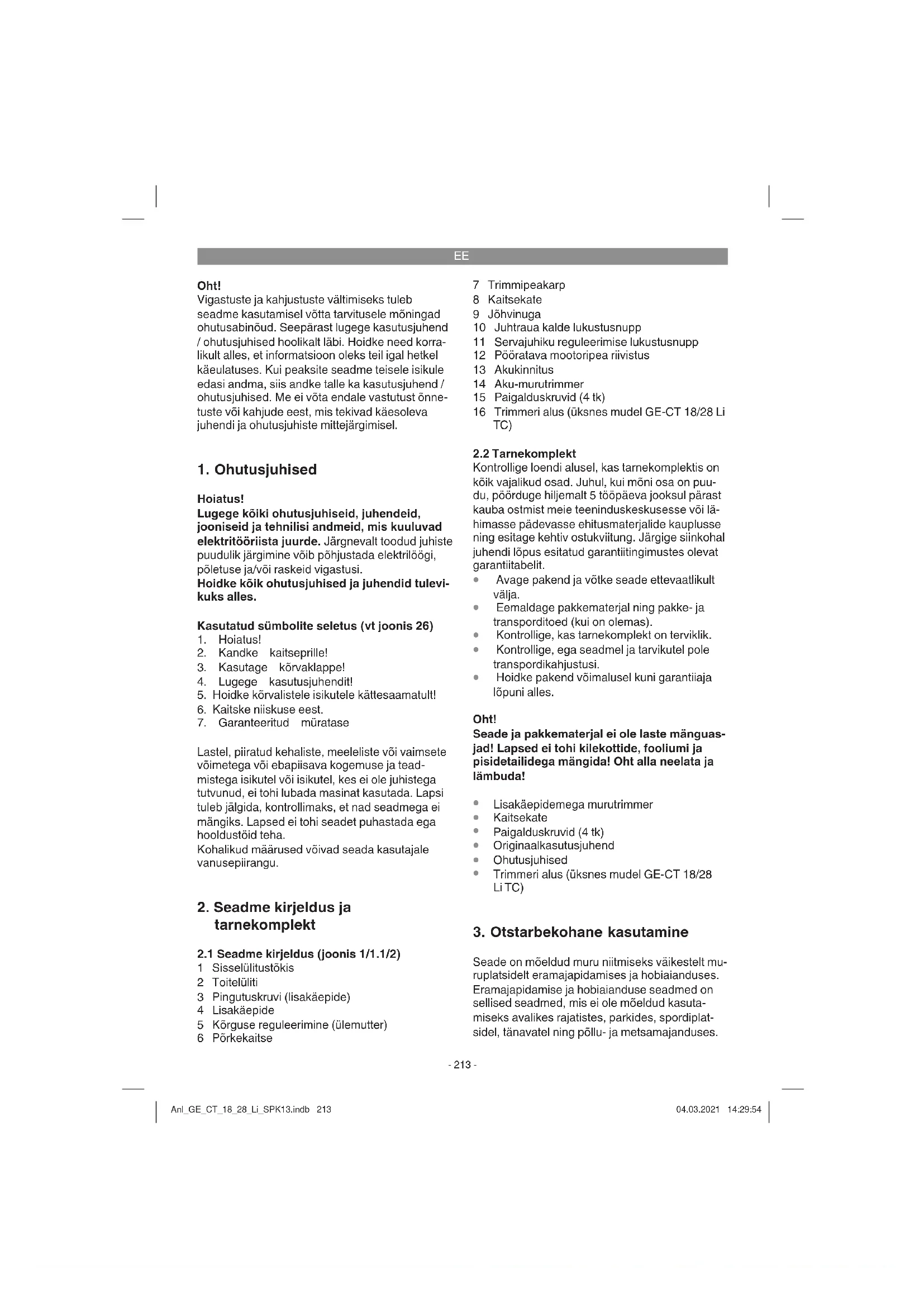 Seade on mõeldud muru niitmiseks väikestelt mu- ruplatsidelt eramajapidamises ja hobiaianduses. Eramajapidamise ja hobiaianduse seadmed on sellised seadmed, mis ei ole mõeldud kasuta- miseks avalikes rajatistes, parkides, spordiplat- sidel, tänavatel ning põllu- ja metsamajanduses. Anl_GE_CT_18_28_Li_SPK13.indb 213Anl_GE_CT_18_28_Li_SPK13.indb 213 04.03.2021 14:29:5404.03.2021 14:29:54EE