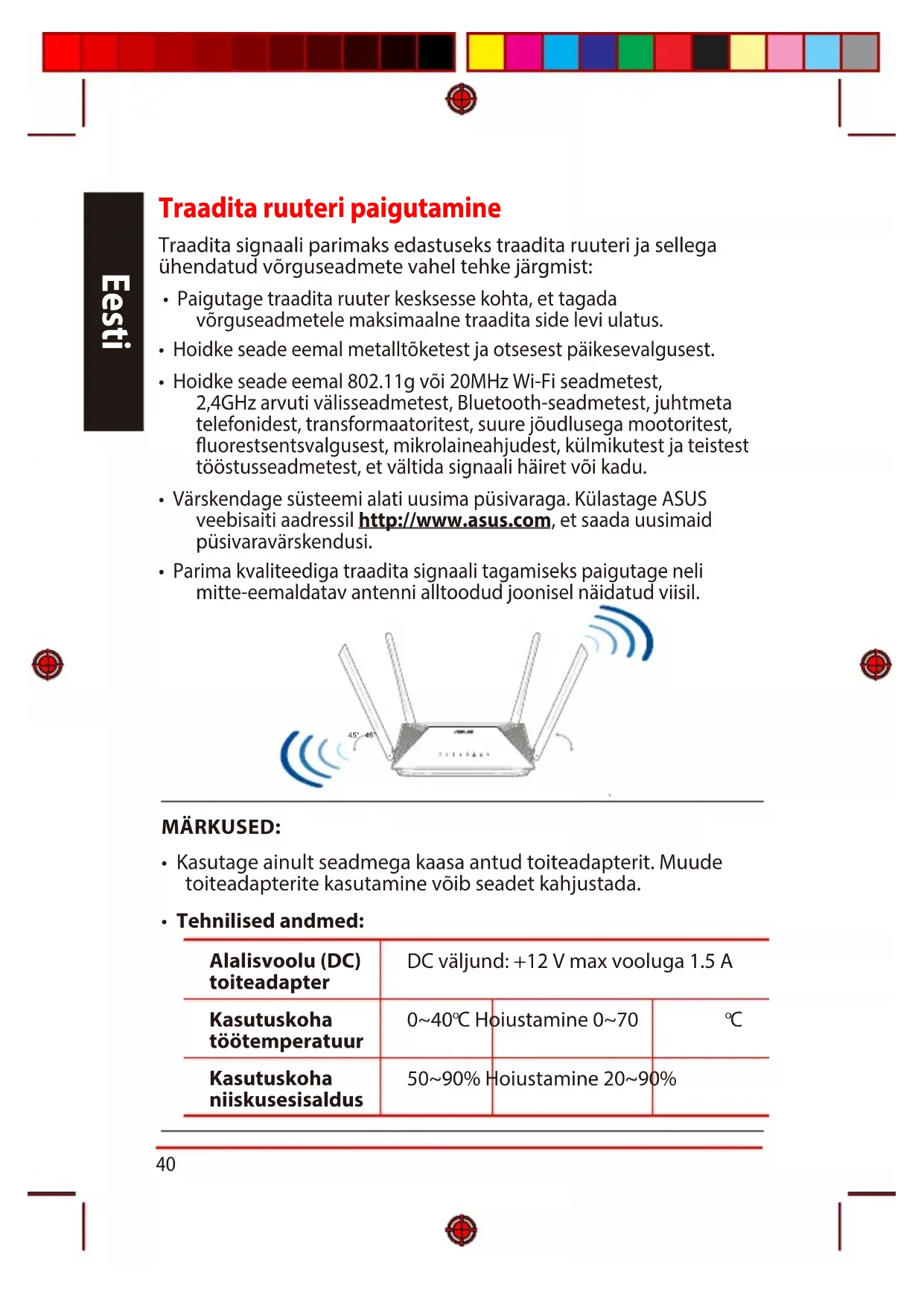 Eesti Traadita ruuteri paigutamine Traadita ruuteri paigutamine Traadita signaali parimaks edastuseks traadita ruuteri ja sellega ühendatud võrguseadmete vahel tehke järgmist: