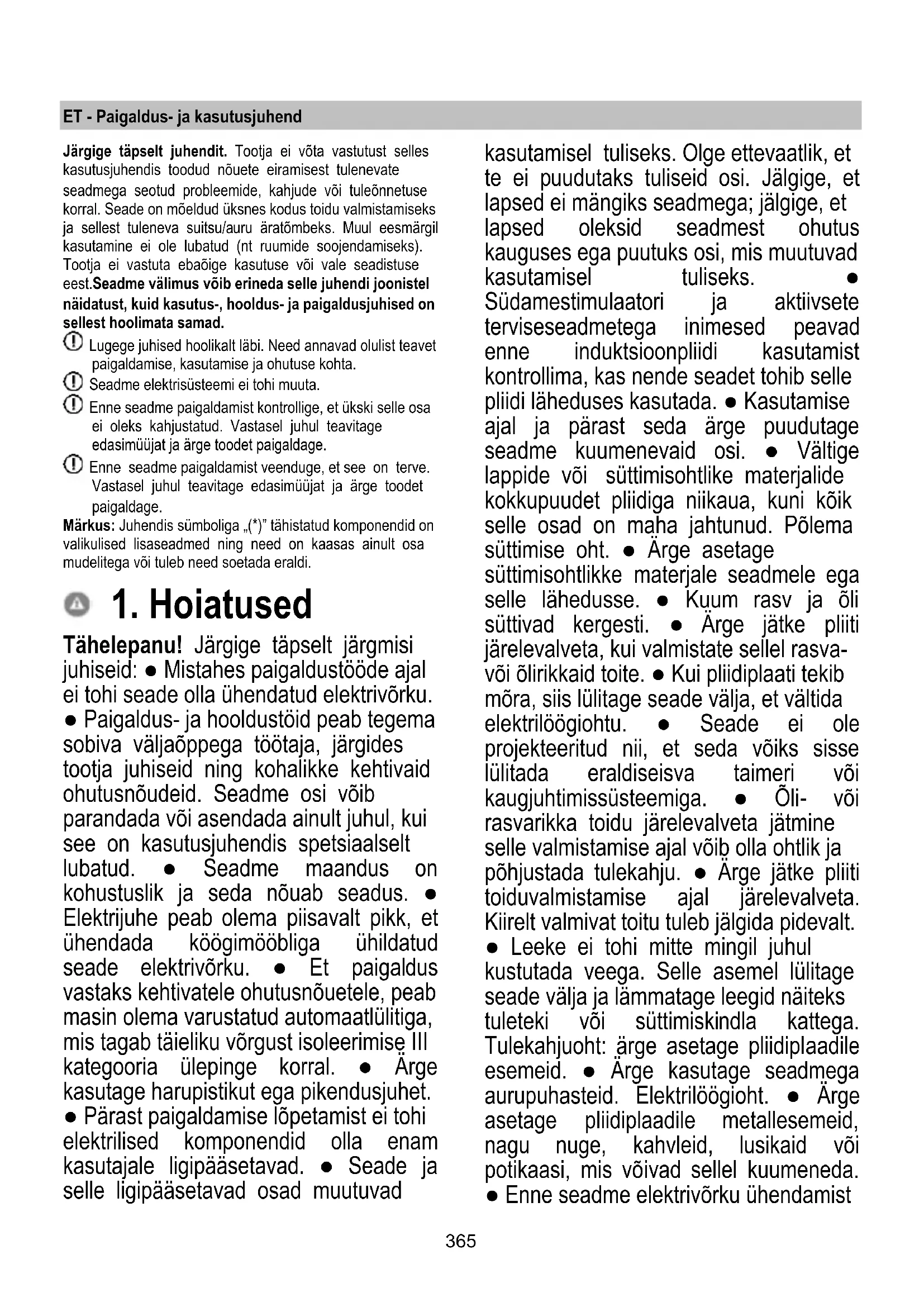 Tähelepanu! Järgige täpselt järgmisi juhiseid: ● Mistahes paigaldustööde ajal ei tohi seade olla ühendatud elektrivõrku. ● Paigaldus- ja hooldustöid peab tegema sobiva väljaõppega töötaja, järgides tootja juhiseid ning kohalikke kehtivaid ohutusnõudeid. Seadme osi võib parandada või asendada ainult juhul, kui see on kasutusjuhendis spetsiaalselt lubatud. ● Seadme maandus on kohustuslik ja seda nõuab seadus. ● Elektrijuhe peab olema piisavalt pikk, et ühendada köögimööbliga ühildatud seade elektrivõrku. ● Et paigaldus vastaks kehtivatele ohutusnõuetele, peab masin olema varustatud automaatlülitiga, mis tagab täieliku võrgust isoleerimise III kategooria ülepinge korral. ● Ärge kasutage harupistikut ega pikendusjuhet. ● Pärast paigaldamise lõpetamist ei tohi elektrilised komponendid olla enam kasutajale ligipääsetavad. ● Seade ja selle ligipääsetavad osad muutuvad kasutamisel tuliseks. Olge ettevaatlik, et te ei puudutaks tuliseid osi. Jälgige, et lapsed ei mängiks seadmega; jälgige, et lapsed oleksid seadmest ohutus kauguses ega puutuks osi, mis muutuvad kasutamisel tuliseks. ● Südamestimulaatori ja aktiivsete terviseseadmetega inimesed peavad enne induktsioonpliidi kasutamist kontrollima, kas nende seadet tohib selle pliidi läheduses kasutada. ● Kasutamise ajal ja pärast seda ärge puudutage seadme kuumenevaid osi. ● Vältige lappide või süttimisohtlike materjalide kokkupuudet pliidiga niikaua, kuni kõik selle osad on maha jahtunud. Põlema süttimise oht. ● Ärge asetage süttimisohtlikke materjale seadmele ega selle lähedusse. ● Kuum rasv ja õli süttivad kergesti. ● Ärge jätke pliiti järelevalveta, kui valmistate sellel rasva- või õlirikkaid toite. ● Kui pliidiplaati tekib mõra, siis lülitage seade välja, et vältida elektrilöögiohtu. ● Seade ei ole projekteeritud nii, et seda võiks sisse lülitada eraldiseisva taimeri või kaugjuhtimissüsteemiga. ● Õli- või rasvarikka toidu järelevalveta jätmine selle valmistamise ajal võib olla ohtlik ja põhjustada tulekahju. ● Ärge jätke pliiti toiduvalmistamise ajal järelevalveta. Kiirelt valmivat toitu tuleb jälgida pidevalt. ● Leeke ei tohi mitte mingil juhul kustutada veega. Selle asemel lülitage seade välja ja lämmatage leegid näiteks tuleteki või süttimiskindla kattega. Tulekahjuoht: ärge asetage pliidiplaadile esemeid. ● Ärge kasutage seadmega aurupuhasteid. Elektrilöögioht. ● Ärge asetage pliidiplaadile metallesemeid, nagu nuge, kahvleid, lusikaid või potikaasi, mis võivad sellel kuumeneda. ● Enne seadme elektrivõrku ühendamist366 kontrollige, kas andmesildil (seadme alumisel küljel) toodud väärtused sobivad elektrivõrgu ja pistiku pinge ning võimsusega. Kahtluste korral pöörduge väljaõppinud elektriku poole. Tähtis: ● Pärast kasutamist lülitage keeduala vastavast nupust välja, ärge usaldage seda, mida näitab keedunõude detektor. ● Vältige vedeliku sattumist pliidile ning vedelike keetmisel või soojendamisel kasutage madalat kuumust. ● Soojendavad osad ei tohi töötada, kui neil on tühjad anumad või kui neil anumaid ei ole. ● Pärast toiduvalmistamise lõpetamist lülitage vastav keeduala välja. ● Ärge valmistage toitu fooliumis ega asetage otse pliidile fooliumi pakitud toitu. Alumiiniumist foolium sulab ja kahjustab pliiti pöördumatult. ● Ärge soojendage pliidil konservikarpe või plekkpurke, mida ei ole enne avatud ● need võivad plahvatada! See hoiatus kehtib igat tüüpi pliidi kohta. ● Suure võimsuse, näiteks funktsiooni Booster kasutamine ei sobi kõigi vedelike soojendamisel (nii ei tohi soojendada nt praadimisõli). Liigne kuumus võib olla ohtlik. Neil juhtudel on soovitatav on kasutada väiksemat võimsust. ● Pott/pann tuleb asetada otse pliidiplaadile ja keeduala keskele. Mitte mingil juhul ei tohi midagi panna pliidiplaadi ja poti/panni vahele. ● Kõrge temperatuuri korral vähendab seade keedualade võimsust automaatselt. ● Enne seadme puhastamist või mis tahes hooldustöö tegemist eraldage seade elektrivõrgust, võttes toitekaabli pistiku pistikupesast välja või lülitades peakilbist välja seadme elektriühenduse pealüliti. ● Kõigi paigaldus- ja hooldustööde tegemisel kasutage töökindaid. ● Lapsed alates 8. eluaastast, piiratud füüsiliste, sensoorsete või vaimsete võimetega inimesed ning isikud, kellel puuduvad selleks kogemused või teadmised, tohivad seadet kasutada ainult järelevalve all või kui neid on õpetatud seadet turvaliselt kasutama ning nad mõistavad kasutusest tulenevaid ohte. ● Tuleb kontrollida, et lapsed ei mängiks seadmega. ● Lapsed ei tohi ilma järelevalveta teha puhastus- ja hooldustöid. ● Kui seadme paigalduskohas kasutatakse gaasi või mõne muu kütteainega töötavaid seadmeid, peab kindlasti olema tagatud piisav ventilatsioon. ● Seadet tuleb korrapäraselt puhastada nii seest kui ka väljast (VÄHEMALT KORD KUUS), pidades seejuures kinni hooldusjuhendis esitatud täpsetest nõuetest. ● Seadme puhastusnõuete ja filtrite puhastamise või vahetamise kohustuse eiramine toob kaasa tuleohu. ● Leekide kasutamise toidu valmistamisel on rangelt keelatud. ● Lahtine leek kahjustab filtreid ja võib põhjustada tulekahju, seepärast tuleb selle kasutamist igal juhul vältida. ● Praadimisel olge ettevaatlik, et vältida kuuma õli süttimist. TÄHELEPANU: Kui pliidiplaat töötab, võivad seadme ligipääsetavad osad kuumeneda. Tähelepanu! Ärge ühendage seadet elektrivõrku enne, kui paigaldamine on täielikult lõpule viidud. ● Suitsu väljatõmbe tehniliste ja ohutusmeetmete kohaldamisel pidage eranditult kinni kohalike asjakohaste volitatud ametite määrustest. ● Puhastatavat õhku ei tohi suunata torusse, mis on mõeldud gaasi või mõne muu kütusega töötava seadme suitsu väljajuhtimiseks. Seadme kasutamine on keelatud, kui võre pole õigesti paigaldatud! ● Paigaldamisel kasutage