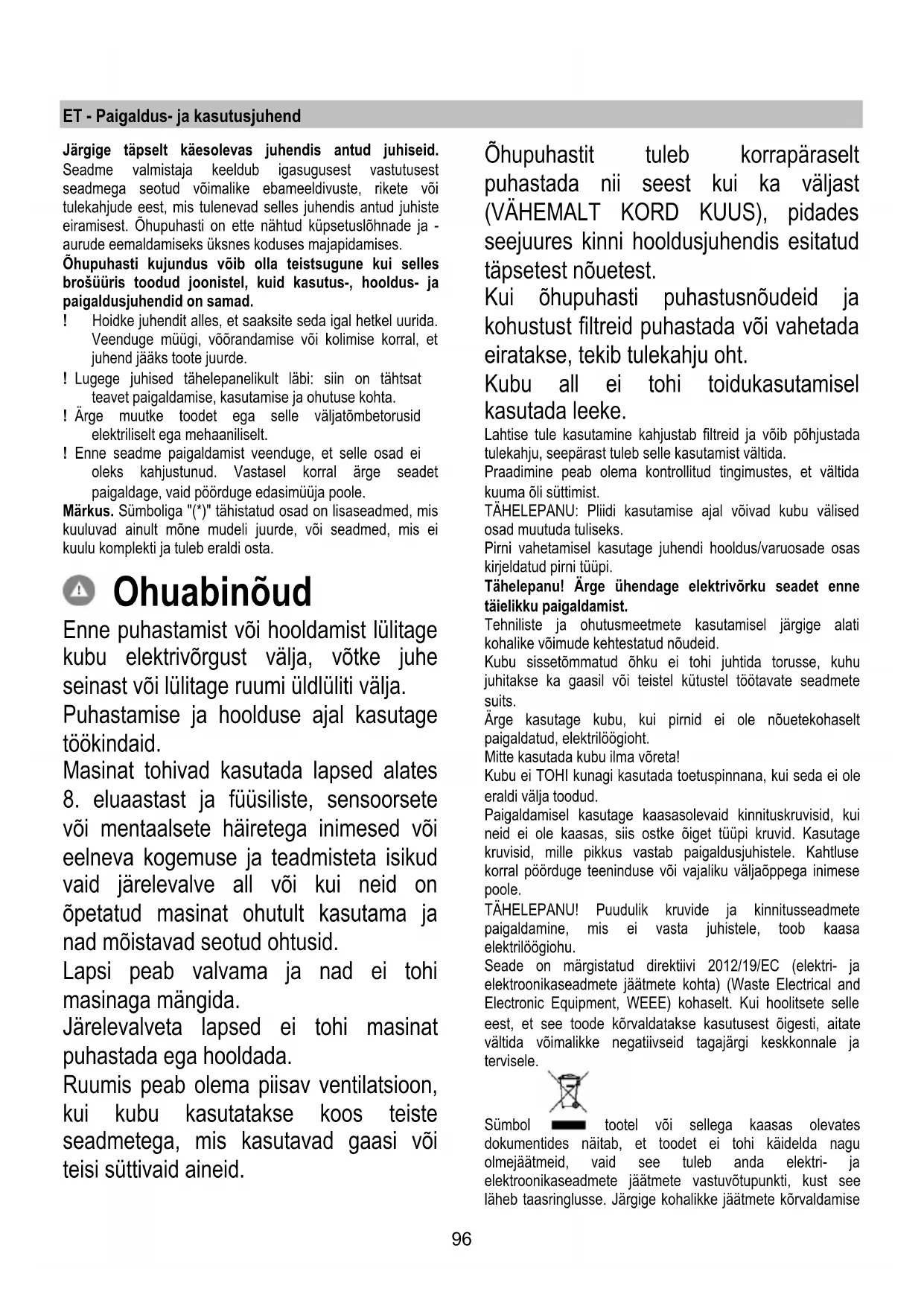 või mentaalsete häiretega inimesed või eelneva kogemuse ja teadmisteta isikud vaid järelevalve all või kui neid on õpetatud masinat ohutult kasutama ja nad mõistavad seotud ohtusid. Lapsi peab valvama ja nad ei tohi masinaga mängida. Järelevalveta lapsed ei tohi masinat puhastada ega hooldada. Ruumis peab olema piisav ventilatsioon, kui kubu kasutatakse koos teiste seadmetega, mis kasutavad gaasi või teisi süttivaid aineid. Õhupuhastit tuleb korrapäraselt puhastada nii seest kui ka väljast (VÄHEMALT KORD KUUS), pidades seejuures kinni hooldusjuhendis esitatud täpsetest nõuetest. Kui õhupuhasti puhastusnõudeid ja kohustust filtreid puhastada või vahetada eiratakse, tekib tulekahju oht. Kubu all ei tohi toidukasutamisel kasutada leeke. Lahtise tule kasutamine kahjustab filtreid ja võib põhjustada tulekahju, seepärast tuleb selle kasutamist vältida. Praadimine peab olema kontrollitud tingimustes, et vältida kuuma õli süttimist. TÄHELEPANU: Pliidi kasutamise ajal võivad kubu välised osad muutuda tuliseks. Pirni vahetamisel kasutage juhendi hooldus/varuosade osas kirjeldatud pirni tüüpi. Tähelepanu! Ärge ühendage elektrivõrku seadet enne täielikku paigaldamist. Tehniliste ja ohutusmeetmete kasutamisel järgige alati kohalike võimude kehtestatud nõudeid. Kubu sissetõmmatud õhku ei tohi juhtida torusse, kuhu juhitakse ka gaasil või teistel kütustel töötavate seadmete suits. Ärge kasutage kubu, kui pirnid ei ole nõuetekohaselt paigaldatud, elektrilöögioht. Mitte kasutada kubu ilma võreta! Kubu ei TOHI kunagi kasutada toetuspinnana, kui seda ei ole eraldi välja toodud. Paigaldamisel kasutage kaasasolevaid kinnituskruvisid, kui neid ei ole kaasas, siis ostke õiget tüüpi kruvid. Kasutage kruvisid, mille pikkus vastab paigaldusjuhistele. Kahtluse korral pöörduge teeninduse või vajaliku väljaõppega inimese poole. TÄHELEPANU! Puudulik kruvide ja kinnitusseadmete paigaldamine, mis ei vasta juhistele, toob kaasa elektrilöögiohu. Seade on märgistatud direktiivi 2012/19/EC (elektri- ja elektroonikaseadmete jäätmete kohta) (Waste Electrical and Electronic Equipment, WEEE) kohaselt. Kui hoolitsete selle eest, et see toode kõrvaldatakse kasutusest õigesti, aitate vältida võimalikke negatiivseid tagajärgi keskkonnale ja tervisele. Sümbol tootel või sellega kaasas olevates dokumentides näitab, et toodet ei tohi käidelda nagu olmejäätmeid, vaid see tuleb anda elektri- ja elektroonikaseadmete jäätmete vastuvõtupunkti, kust see läheb taasringlusse. Järgige kohalikke jäätmete kõrvaldamise97 alaseid õigusnorme. Lisateabe saamiseks selle toote käitlemise, taaskasutamise ja ringlussevõtu kohta võtke ühendust vastava kohaliku asutuse, olmejäätmete kogumise ettevõtte või selle firmaga, kelle käest te toote ostsite. Seade on välja töötatud, testitud ja toodetud vastavalt: