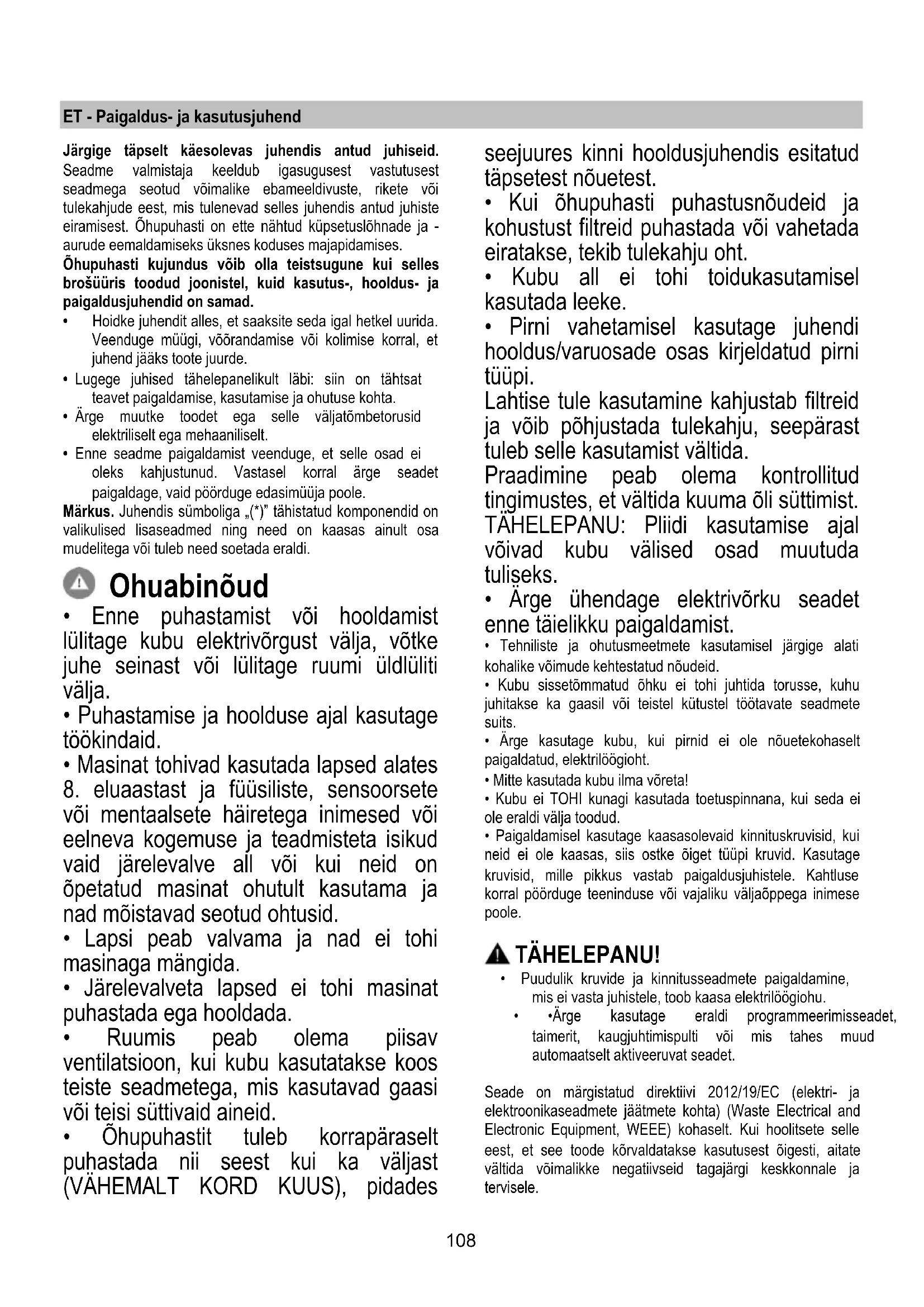 - Ruumis peab olema piisav ventilatsioon, kui kubu kasutatakse koos teiste seadmetega, mis kasutavad gaasi või teisi süttivaid aineid.