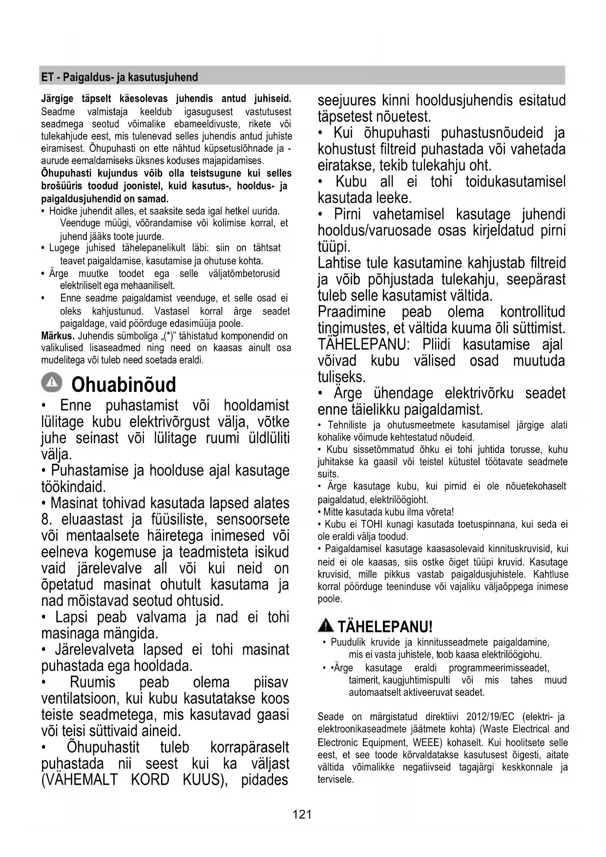 - Ruumis peab olema piisav ventilatsioon, kui kubu kasutatakse koos teiste seadmetega, mis kasutavad gaasi või teisi süttivaid aineid.
