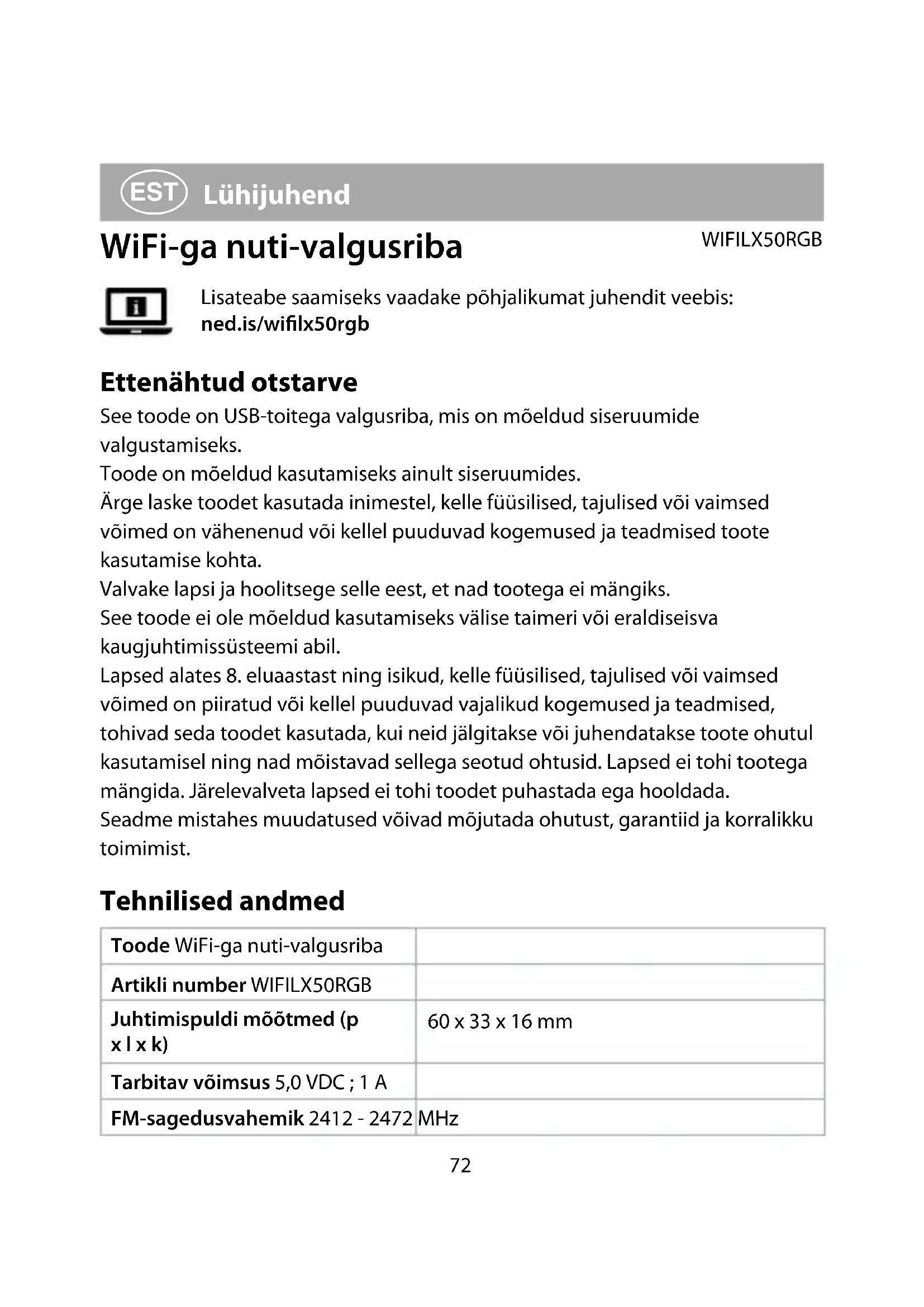Lühijuhend WiFi-ga nuti-valgusriba WIFILX50RGB Lisateabe saamiseks vaadake põhjalikumat juhendit veebis: ned.is/wilx50rgb Ettenähtud otstarve See toode on USB-toitega valgusriba, mis on mõeldud siseruumide valgustamiseks. Toode on mõeldud kasutamiseks ainult siseruumides. Ärge laske toodet kasutada inimestel, kelle füüsilised, tajulised või vaimsed võimed on vähenenud või kellel puuduvad kogemused ja teadmised toote kasutamise kohta. Valvake lapsi ja hoolitsege selle eest, et nad tootega ei mängiks. See toode ei ole mõeldud kasutamiseks välise taimeri või eraldiseisva kaugjuhtimissüsteemi abil. Lapsed alates 8. eluaastast ning isikud, kelle füüsilised, tajulised või vaimsed võimed on piiratud või kellel puuduvad vajalikud kogemused ja teadmised, tohivad seda toodet kasutada, kui neid jälgitakse või juhendatakse toote ohutul kasutamisel ning nad mõistavad sellega seotud ohtusid. Lapsed ei tohi tootega mängida. Järelevalveta lapsed ei tohi toodet puhastada ega hooldada. Seadme mistahes muudatused võivad mõjutada ohutust, garantiid ja korralikku toimimist. Tehnilised andmed Toode WiFi-ga nuti-valgusriba Artikli number WIFILX50RGB Juhtimispuldi mõõtmed (p x l x k) 60 x 33 x 16 mm Tarbitav võimsus 5,0 VDC ; 1 A FM-sagedusvahemik 2412 - 2472 MHz73 Maksimaalne ülekandevõimsus 16 dBm Kaal 145 g Juhtme pikkus 100 cm Valgusketi pikkus 500 cm Peamised osad (joonis A) 1 USB-toitejuhe 2 Toitenupp 3 Värvinupp 4 Muusikanupp 5 Mikrofon 6 Juhtimisseade 7 LED-riba Ohutusnõuded Ärge kasutage toodet kohtades, kus võib tekkida veepritsmeid, nt vannitoas, basseinis või pesukausi läheduses.