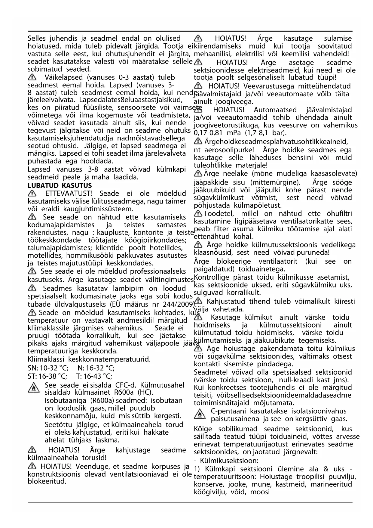 OHUTUSJUHISED OLULINE! LUGEGE LÄBI JA JÄRGIGE HOOLIKALT! Enneseadmekasutamistlugegeseeohutusjuhend hoolikalt läbi. Hoidke see hilisemaks läbivaatamiseks käepärast.Selles juhendis ja seadmel endal on olulised hoiatused, mida tuleb pidevalt järgida. Tootja ei vastuta selle eest, kui ohutusjuhendit ei järgita, seadet kasutatakse valesti või määratakse sellele sobimatud seaded. Väikelapsed (vanuses 0-3 aastat) tuleb seadmest eemal hoida. Lapsed (vanuses 3- 8 aastat) tuleb seadmest eemal hoida, kui nende järeleeivalvata. Lapsedalates8eluaastastjaisikud, kes on piiratud füüsiliste, sensoorsete või vaimsete võimetega või ilma kogemuste või teadmisteta, võivad seadet kasutada ainult siis, kui nende tegevust jälgitakse või neid on seadme ohutuks kasutamiseksjuhendatudja nadmõistavadsellega seotud ohtusid. Jälgige, et lapsed seadmega ei mängiks. Lapsed ei tohi seadet ilma järelevalveta puhastada ega hooldada. Lapsed vanuses 3-8 aastat võivad külmkapi seadmeid peale ja maha laadida. LUBATUD KASUTUS ETTEVAATUST! Seade ei ole mõeldud kasutamiseks välise lülitusseadmega, nagu taimer või eraldi kaugjuhtimissüsteem. See seade on nähtud ette kasutamiseks kodumajapidamistes ja teistes sarnastes rakendustes, nagu : kaupluste, kontorite ja teiste töökeskkondade töötajate köögipiirkondades; talumajapidamistes; klientide poolt hotellides, motellides, hommikusööki pakkuvates asutustes ja teistes majutustüüpi keskkondades. See seade ei ole mõeldud professionaalseks kasutuseks. Ärge kasutage seadet välitingimustes. Seadmes kasutatav lambipirn on loodud spetsiaalselt kodumasinate jaoks ega sobi kodus tubade üldvalgustuseks (EÜ määrus nr 244/2009). Seade on mõeldud kasutamiseks kohtades, kus temperatuur on vastavalt andmesildil märgitud kliimaklassile järgmises vahemikus. Seade ei pruugi töötada korralikult, kui see jäetakse pikaks ajaks märgitud vahemikust väljapoole jääva temperatuuriga keskkonda. Kliimaklassi keskkonnatemperatuurid. SN: 10-32 °C; N: 16-32 °C; ST: 16-38 °C; T: 16-43 °C; See seade ei sisalda CFC-d. Külmutusahel sisaldab külmaainet R600a (HC). Isobutaaniga (R600a) seadmed: isobutaan on looduslik gaas, millel puudub keskkonnamõju, kuid mis süttib kergesti. Seetõttu jälgige, et külmaaineahela torud ei oleks kahjustatud, eriti kui hakkate ahelat tühjaks laskma. HOIATUS! Ärge kahjustage seadme külmaaineahela torusid! HOIATUS! Veenduge, et seadme korpuses ja konstruktsioonis olevad ventilatsiooniavad ei ole blokeeritud. HOIATUS! Ärge kasutage sulamise kiirendamiseks muid kui tootja soovitatud mehaanilisi, elektrilisi või keemilisi vahendeid! HOIATUS! Ärge asetage seadme sektsioonidesse elektriseadmeid, kui need ei ole tootja poolt selgesõnaliselt lubatud tüüpi! HOIATUS! Veevarustusega mitteühendatud jäävalmistajaid ja/või veeautomaate võib täita ainult joogiveega. HOIATUS! Automaatsed jäävalmistajad ja/või veeautomaadid tohib ühendada ainult joogiveetorustikuga, kus veesurve on vahemikus 0,17-0,81 mPa (1,7-8,1 bar). Ärgehoidkeseadmesplahvatusohtlikkeaineid, nt aerosoolipurke! Ärge hoidke seadmes ega kasutage selle läheduses bensiini või muid tuleohtlikke materjale! Ärge neelake (mõne mudeliga kaasasolevate) jääpakkide sisu (mittemürgine). Ärge sööge jääkuubikuid või jääpulki kohe pärast nende sügavkülmikust võtmist, sest need võivad põhjustada külmapõletust. Toodetel, millel on nähtud ette õhufiltri kasutamine ligipääsetava ventilaatorikatte sees, peab filter asuma külmiku töötamise ajal alati ettenähtud kohal. Ärge hoidke külmutussektsioonis vedelikega klaasnõusid, sest need võivad puruneda! Ärge blokeerige ventilaatorit (kui see on paigaldatud) toiduainetega. Kontrollige pärast toidu külmikusse asetamist, kas sektsioonide uksed, eriti sügavkülmiku uks, sulguvad korralikult. Kahjustatud tihend tuleb võimalikult kiiresti välja vahetada. Kasutage külmikut ainult värske toidu hoidmiseks ja külmutussektsiooni ainult külmutatud toidu hoidmiseks, värske toidu külmutamiseks ja jääkuubikute tegemiseks. Äge hoiustage pakendamata toitu külmikus või sügavkülma sektsioonides, vältimaks otsest kontakti sisemiste pindadega. Seadmetel võivad olla spetsiaalsed sektsioonid (värske toidu sektsioon, null-kraadi kast jms). Kui konkreetses tootejuhendis ei ole märgitud teisiti, võibsellisedsektsioonideemaldadaseadme toimimisnäitajaid mõjutamata. C-pentaani kasutatakse isolatsioonivahus paisutusainena ja see on kergsüttiv gaas. Kõige sobilikumad seadme sektsioonid, kus säilitada teatud tüüpi toiduaineid, võttes arvesse erinevat temperatuurijaotust erinevates seadme sektsioonides, on jaotatud järgnevalt: - Külmikusektsioon: