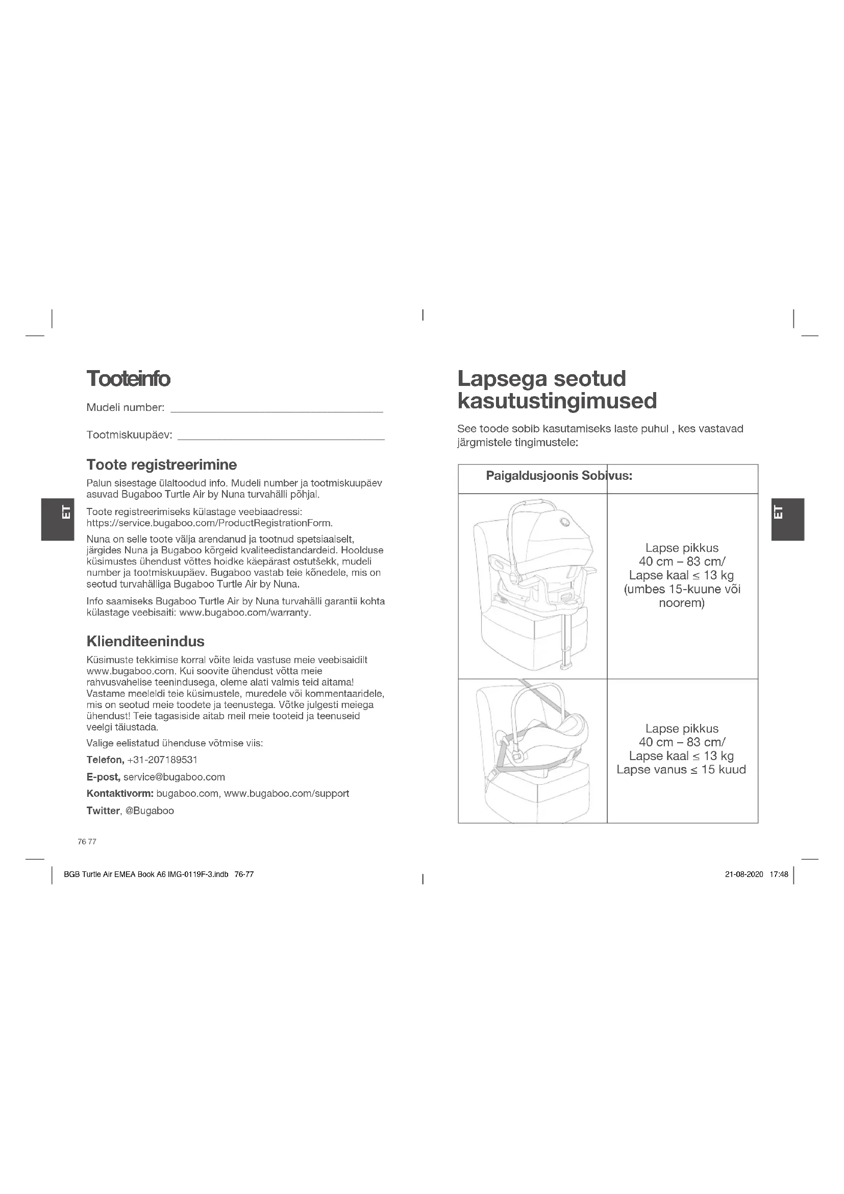 BGB Turtle Air EMEA Book A6 IMG-0119F-3.indb 74-75BGB Turtle Air EMEA Book A6 IMG-0119F-3.indb 74-75 21-08-2020 17:4821-08-2020 17:48Tooteinfo Mudeli number: ______________________________________ Tootmiskuupäev: _____________________________________ Toote registreerimine Palun sisestage ülaltoodud info. Mudeli number ja tootmiskuupäev asuvad Bugaboo Turtle Air by Nuna turvahälli põhjal. Toote registreerimiseks külastage veebiaadressi: https://service.bugaboo.com/ProductRegistrationForm. Nuna on selle toote välja arendanud ja tootnud spetsiaalselt, järgides Nuna ja Bugaboo kõrgeid kvaliteedistandardeid. Hoolduse küsimustes ühendust võttes hoidke käepärast ostutšekk, mudeli number ja tootmiskuupäev. Bugaboo vastab teie kõnedele, mis on seotud turvahälliga Bugaboo Turtle Air by Nuna. Info saamiseks Bugaboo Turtle Air by Nuna turvahälli garantii kohta külastage veebisaiti: www.bugaboo.com/warranty. Klienditeenindus Küsimuste tekkimise korral võite leida vastuse meie veebisaidilt www.bugaboo.com. Kui soovite ühendust võtta meie rahvusvahelise teenindusega, oleme alati valmis teid aitama! Vastame meeleldi teie küsimustele, muredele või kommentaaridele, mis on seotud meie toodete ja teenustega. Võtke julgesti meiega ühendust! Teie tagasiside aitab meil meie tooteid ja teenuseid veelgi täiustada. Valige eelistatud ühenduse võtmise viis: Telefon, +31-207189531 E-post, service@bugaboo.com Kontaktivorm: bugaboo.com, www.bugaboo.com/support Twitter, @Bugaboo Lapsega seotud kasutustingimused Paigaldusjoonis Sobivus: Lapse pikkus 40 cm – 83 cm/ Lapse kaal ≤ 13 kg (umbes 15-kuune või noorem) Lapse pikkus 40 cm – 83 cm/ Lapse kaal ≤ 13 kg Lapse vanus ≤ 15 kuud See toode sobib kasutamiseks laste puhul , kes vastavad järgmistele tingimustele: