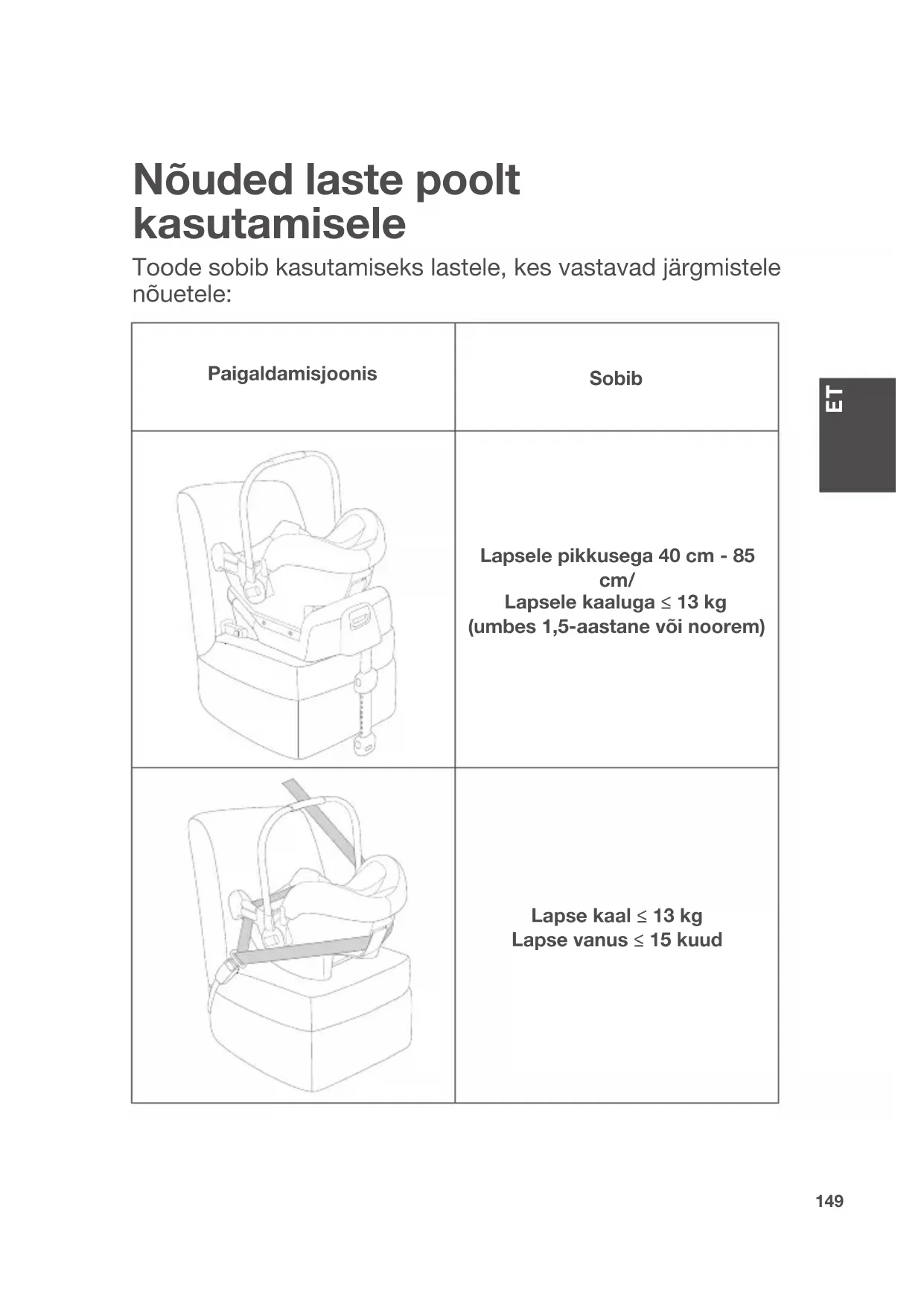Nõuded laste poolt kasutamisele Toode sobib kasutamiseks lastele, kes vastavad järgmistele nõuetele: Paigaldamisjoonis Sobib Lapsele pikkusega 40 cm - 85 cm/ Lapsele kaaluga ≤ 13 kg (umbes 1,5-aastane või noorem) Lapse kaal ≤ 13 kg Lapse vanus ≤ 15 kuud150