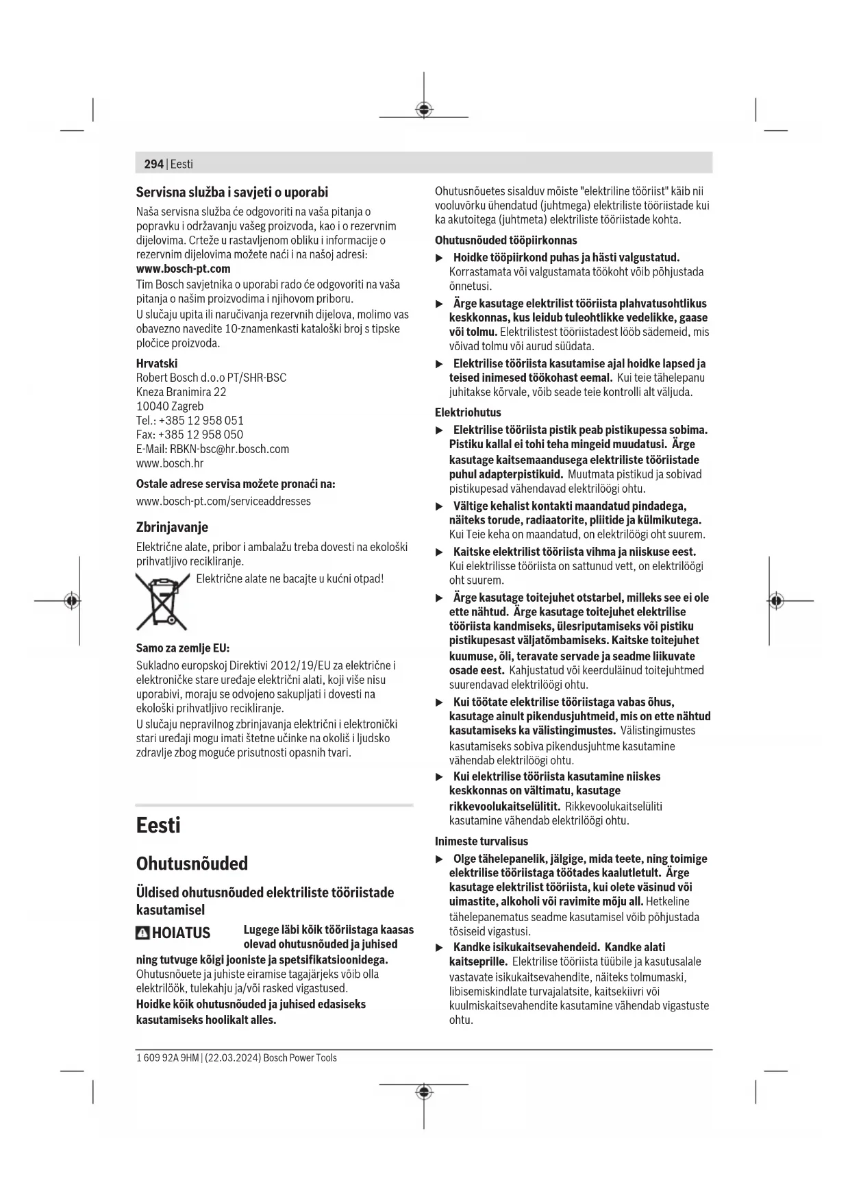 Izvedba prekidača s blokadom Za puštanje električnog alata u rad najprije pritisnite prekidač za uključivanje/isključivanje(2) ➊, zatim ga pomaknite prema naprijed ➋. Zatim ga pritisnite i držite pritisnut ➌. Za blokadu pritisnutog prekidača za uključivanje/ isključivanje(2), prekidač za uključivanje/isključivanje(2) pomaknite dalje prema naprijed ➍. Za isključivanje električnog alata otpustite prekidač za uključivanje/isključivanje (2) odnosno ako je blokiran, pritisnite kratko prekidač za uključivanje/isključivanje (2) i zatim ga otpustite. Izvedba prekidača bez blokade Za puštanje električnog alata u rad najprije pritisnite prekidač za uključivanje/isključivanje(2) ➊, zatim ga pomaknite prema naprijed ➋. Zatim ga pritisnite i držite pritisnut ➌. Za isključivanje električnog alata otpustite prekidač za uključivanje/isključivanje(2). u Prije uporabe provjerite brusne alate. Brusni alat mora biti besprijekorno montiran i mora se moći slobodno okretati. Provedite probni rad od najmanje 1 minute bez opterećenja. Ne koristite oštećene, nezaobljene ili vibrirajuće brusne alate. Oštećeni alati mogu puknuti i uzrokovati ozljede. Održavanje i servisiranje Održavanje i čišćenje u Prije svih radova na električnom alatu izvucite mrežni utikač iz utičnice. u Električni alat i otvore za hlađenje održavajte čistima kako bi se moglo dobro i sigurno raditi. u Kod ekstremnih uvjeta po mogućnosti uvijek koristite stacionarni uređaj za usisavanje. Često ispuhavajte otvore za hlađenje i predspojite zaštitnu strujnu sklopku (PRCD). Kod obrade metala vodljiva prašina se može nakupiti unutar električnog alata. To može negativno utjecati na zaštitnu izolaciju električnog alata. Pažljivo uskladištite i postupajte s priborom. Ako je potrebna zamjena priključnog kabela, tada je treba provesti u Bosch servisu ili u ovlaštenom servisu za Bosch električne alate kako bi se izbjeglo ugrožavanje sigurnosti. Bosch Power Tools 1 609 92A 9HM | (22.03.2024)294 | Eesti Servisna služba i savjeti o uporabi Naša servisna služba će odgovoriti na vaša pitanja o popravku i održavanju vašeg proizvoda, kao i o rezervnim dijelovima. Crteže u rastavljenom obliku i informacije o rezervnim dijelovima možete naći i na našoj adresi: www.bosch-pt.com Tim Bosch savjetnika o uporabi rado će odgovoriti na vaša pitanja o našim proizvodima i njihovom priboru. U slučaju upita ili naručivanja rezervnih dijelova, molimo vas obavezno navedite 10‑znamenkasti kataloški broj s tipske pločice proizvoda. Hrvatski Robert Bosch d.o.o PT/SHR-BSC Kneza Branimira 22 10040 Zagreb Tel.: +385 12 958 051 Fax: +385 12 958 050 E-Mail: RBKN-bsc@hr.bosch.com www.bosch.hr Ostale adrese servisa možete pronaći na: www.bosch-pt.com/serviceaddresses Zbrinjavanje Električne alate, pribor i ambalažu treba dovesti na ekološki prihvatljivo recikliranje. Električne alate ne bacajte u kućni otpad! Samo za zemljeEU: Sukladno europskoj Direktivi 2012/19/EU za električne i elektroničke stare uređaje električni alati, koji više nisu uporabivi, moraju se odvojeno sakupljati i dovesti na ekološki prihvatljivo recikliranje. U slučaju nepravilnog zbrinjavanja električni i elektronički stari uređaji mogu imati štetne učinke na okoliš i ljudsko zdravlje zbog moguće prisutnosti opasnih tvari. Eesti Ohutusnõuded Üldised ohutusnõuded elektriliste tööriistade kasutamisel HOIATUS Lugege läbi kõik tööriistaga kaasas olevad ohutusnõuded ja juhised ning tutvuge kõigi jooniste ja spetsifikatsioonidega. Ohutusnõuete ja juhiste eiramise tagajärjeks võib olla elektrilöök, tulekahju ja/või rasked vigastused. Hoidke kõik ohutusnõuded ja juhised edasiseks kasutamiseks hoolikalt alles. Ohutusnõuetes sisalduv mõiste "elektriline tööriist" käib nii vooluvõrku ühendatud (juhtmega) elektriliste tööriistade kui ka akutoitega (juhtmeta) elektriliste tööriistade kohta. Ohutusnõuded tööpiirkonnas u Hoidke tööpiirkond puhas ja hästi valgustatud. Korrastamata või valgustamata töökoht võib põhjustada õnnetusi. u Ärge kasutage elektrilist tööriista plahvatusohtlikus keskkonnas, kus leidub tuleohtlikke vedelikke, gaase või tolmu. Elektrilistest tööriistadest lööb sädemeid, mis võivad tolmu või aurud süüdata. u Elektrilise tööriista kasutamise ajal hoidke lapsed ja teised inimesed töökohast eemal. Kui teie tähelepanu juhitakse kõrvale, võib seade teie kontrolli alt väljuda. Elektriohutus u Elektrilise tööriista pistik peab pistikupessa sobima. Pistiku kallal ei tohi teha mingeid muudatusi. Ärge kasutage kaitsemaandusega elektriliste tööriistade puhul adapterpistikuid. Muutmata pistikud ja sobivad pistikupesad vähendavad elektrilöögi ohtu. u Vältige kehalist kontakti maandatud pindadega, näiteks torude, radiaatorite, pliitide ja külmikutega. Kui Teie keha on maandatud, on elektrilöögi oht suurem. u Kaitske elektrilist tööriista vihma ja niiskuse eest. Kuielektrilisse tööriista on sattunud vett, on elektrilöögi oht suurem. u Ärge kasutage toitejuhet otstarbel, milleks see ei ole ette nähtud. Ärge kasutage toitejuhet elektrilise tööriista kandmiseks, ülesriputamiseks või pistiku pistikupesast väljatõmbamiseks. Kaitske toitejuhet kuumuse, õli, teravate servade ja seadme liikuvate osade eest. Kahjustatud või keerduläinud toitejuhtmed suurendavad elektrilöögi ohtu. u Kui töötate elektrilise tööriistaga vabas õhus, kasutage ainult pikendusjuhtmeid, mis on ette nähtud kasutamiseks ka välistingimustes. Välistingimustes kasutamiseks sobiva pikendusjuhtme kasutamine vähendab elektrilöögi ohtu. u Kui elektrilise tööriista kasutamine niiskes keskkonnas on vältimatu, kasutage rikkevoolukaitselülitit. Rikkevoolukaitselüliti kasutamine vähendab elektrilöögi ohtu. Inimeste turvalisus u Olge tähelepanelik, jälgige, mida teete, ning toimige elektrilise tööriistaga töötades kaalutletult. Ärge