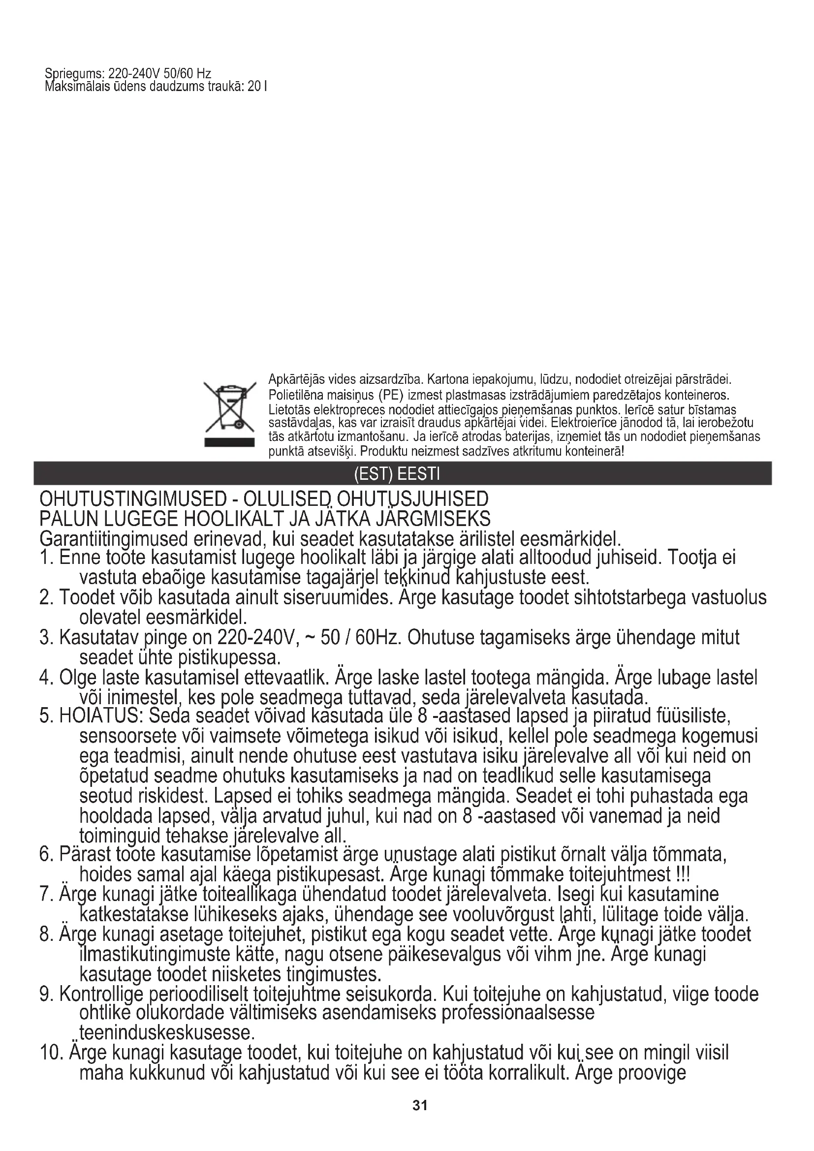 maha kukkunud või kahjustatud või kui see ei tööta korralikult. Ärge proovige Spriegums: 220-240V 50/60 Hz Maksimālais ūdens daudzums traukā: 20 l32