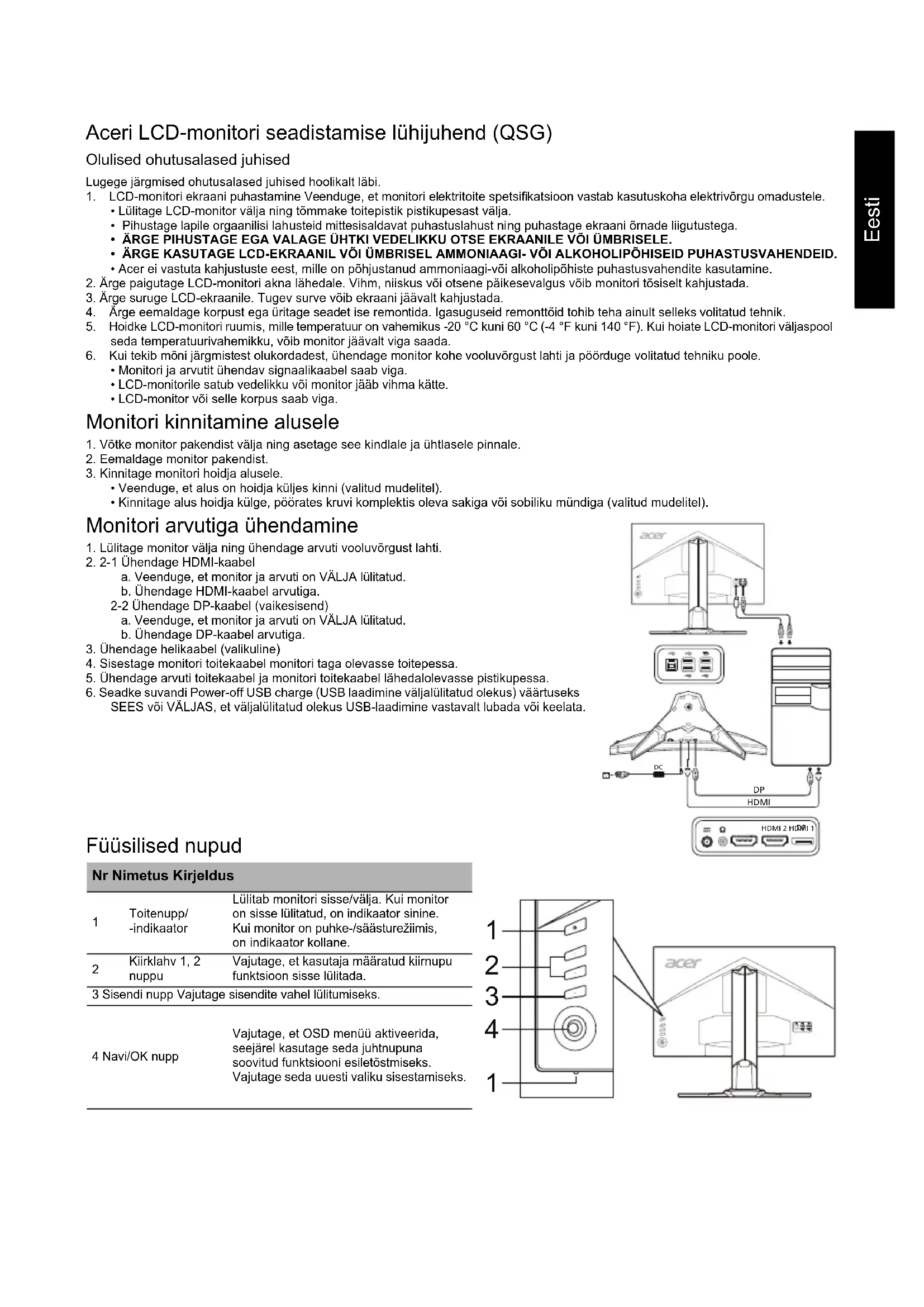 - Monitori ja arvutit ühendav signaalikaabel saab viga. • LCD-monitorile satub vedelikku või monitor jääb vihma kätte. • LCD-monitor või selle korpus saab viga. Monitori kinnitamine alusele 1. Võtke monitor pakendist välja ning asetage see kindlale ja ühtlasele pinnale.2. Eemaldage monitor pakendist.3. Kinnitage monitori hoidja alusele.• Veenduge, et alus on hoidja küljes kinni (valitud mudelitel).• Kinnitage alus hoidja külge, pöörates kruvi komplektis oleva sakiga või sobiliku mündiga (valitud mudelitel). Monitori arvutiga ühendamine 1. Lülitage monitor välja ning ühendage arvuti vooluvõrgust lahti.2. 2-1 Ühendage HDMI-kaabela. Veenduge, et monitor ja arvuti on VÄLJA lülitatud.b. Ühendage HDMI-kaabel arvutiga.2-2 Ühendage DP-kaabel (vaikesisend) a. Veenduge, et monitor ja arvuti on VÄLJA lülitatud.b. Ühendage DP-kaabel arvutiga.3. Ühendage helikaabel (valikuline)4. Sisestage monitori toitekaabel monitori taga olevasse toitepessa.5. Ühendage arvuti toitekaabel ja monitori toitekaabel lähedalolevasse pistikupessa. 6. Seadke suvandi Power-off USB charge (USB laadimine väljalülitatud olekus) väärtuseks SEES või VÄLJAS, et väljalülitatud olekus USB-laadimine vastavalt lubada või keelata. Füüsilised nupud Nr Nimetus Kirjeldus