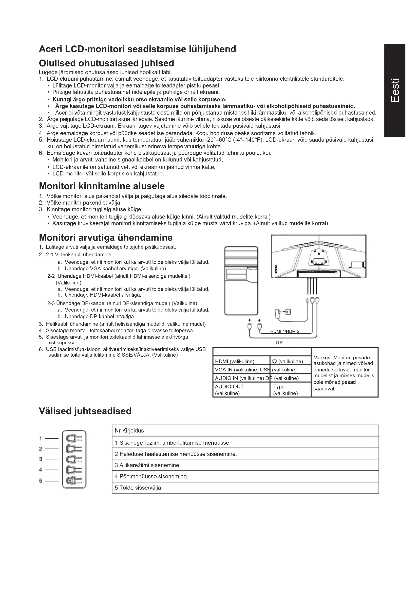 HDMI (ainult HDMI-sisendiga mudel, valikuline) Kõlarid 2 W, 2 tk (ainult helisisendiga mudel, valikuline) Ekraani maksimaalsed mõõtmed Horisontaalne: 797 mm Vertikaalne: 334 mm Toiteallikas SISEND: 100–240 V, vahelduvvool, sagedus 50/60 Hz Ümbritseva keskkonna tingimused Töötemperatuur: 0° kuni 40°C Hoiustamise temperatuur: -20° kuni 60°C Suhteline niiskus: 20% kuni 80% Mõõtmed 806 (L) × 462~592 (K) × 269 (S) mm Mass (neto) 7,6 kg (netomass) Mehhanismi andmed Kallutamine: -5° kuni +35° Pööramine: 360° Kõrguse reguleerimine: 130±5 mm Telje ümber pööramine: Ei Eemaldatav tugijalg: Jah Välised juhtseadised Lüliti/nupud Toitenupp Kiirklahv 1 Kiirklahv 2 Kiirklahv 3 Kiirklahv 4 Funktsioonid Heledus Kontrastsus Sinine valgus Musta võimendus ACM HDR400 Üliteravus Gamma Värvitemperatuur Režiimid Värviruumile Hallskaala režiim 6-komponendiline värvitoon 6-komponendiline küllastus Helitugevus Vaigistatud Helimoonutused Adaptiivne sünkroonimine VRB Värskendussageduse väärtus Ülilühikest peiteaega AimPoint-sihik Keel Ekraanilekuvatava teate kestus Läbipaistvus Ekraanikuva lukk Sisend Allika automaatvalimine DP vaade Lai (dün.) režiim Kiirklahvi määramine DDC/CI HDMI musta tase Kiirkäivitusrežiim Teave Lähtesta kõik sätted Tehnilised andmed erinevad mudeliti ja/või piirkonniti. Aceri toote kasutusjuhend ja muud dokumendid on saadaval Aceri ametlikul veebisaidil.Lietuvių LCD monitoriaus „Acer“ trumpasis sąrankos vadovas Svarbios saugos instrukcijos Atidžiai perskaitykite šias instrukcijas. 1. LCD ekrano valymas: pirmiausia užtikrinkite, kad maitinimo adapteris, kurį naudojate, atitiktų jūsų regiono elektros standartus.