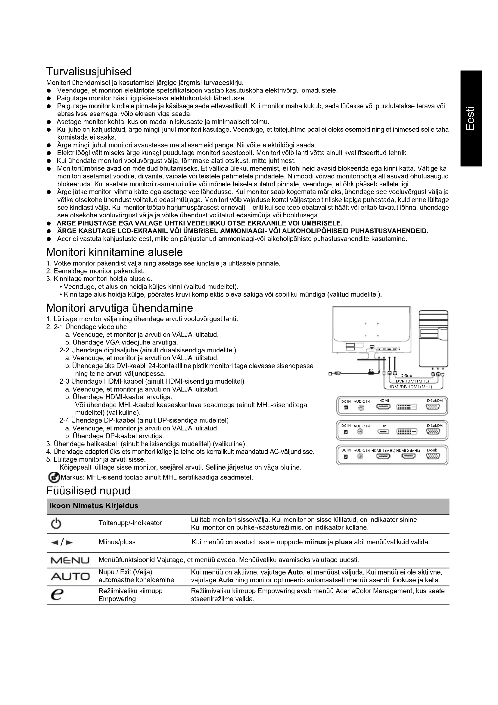 Kõigepealt lülitage sisse monitor, seejärel arvuti. Selline järjestus on väga oluline. Märkus: MHL-sisend töötab ainult MHL sertifikaadiga seadmetel. Füüsilised nupud Ikoon Nimetus Kirjeldus Toitenupp/-indikaator Lülitab monitori sisse/välja. Kui monitor on sisse lülitatud, on indikaator sinine. Kui monitor on puhke-/säästurežiimis, on indikaator kollane. Miinus/pluss Kui menüü on avatud, saate nuppude miinus ja pluss abil menüüvalikuid valida. Menüüfunktsioonid Vajutage, et menüü avada. Menüüvaliku avamiseks vajutage uuesti. Nupu / Exit (Välja) automaatne kohaldamine Kui menüü on aktiivne, vajutage Auto, et menüüst väljuda. Kui menüü ei ole aktiivne, vajutage Auto ning monitor optimeerib automaatselt menüü asendi, fookuse ja kella. Režiimivaliku kiirnupp Empowering Režiimivaliku kiirnupp Empowering avab menüü Acer eColor Management, kus saate stseenirežiime valida.