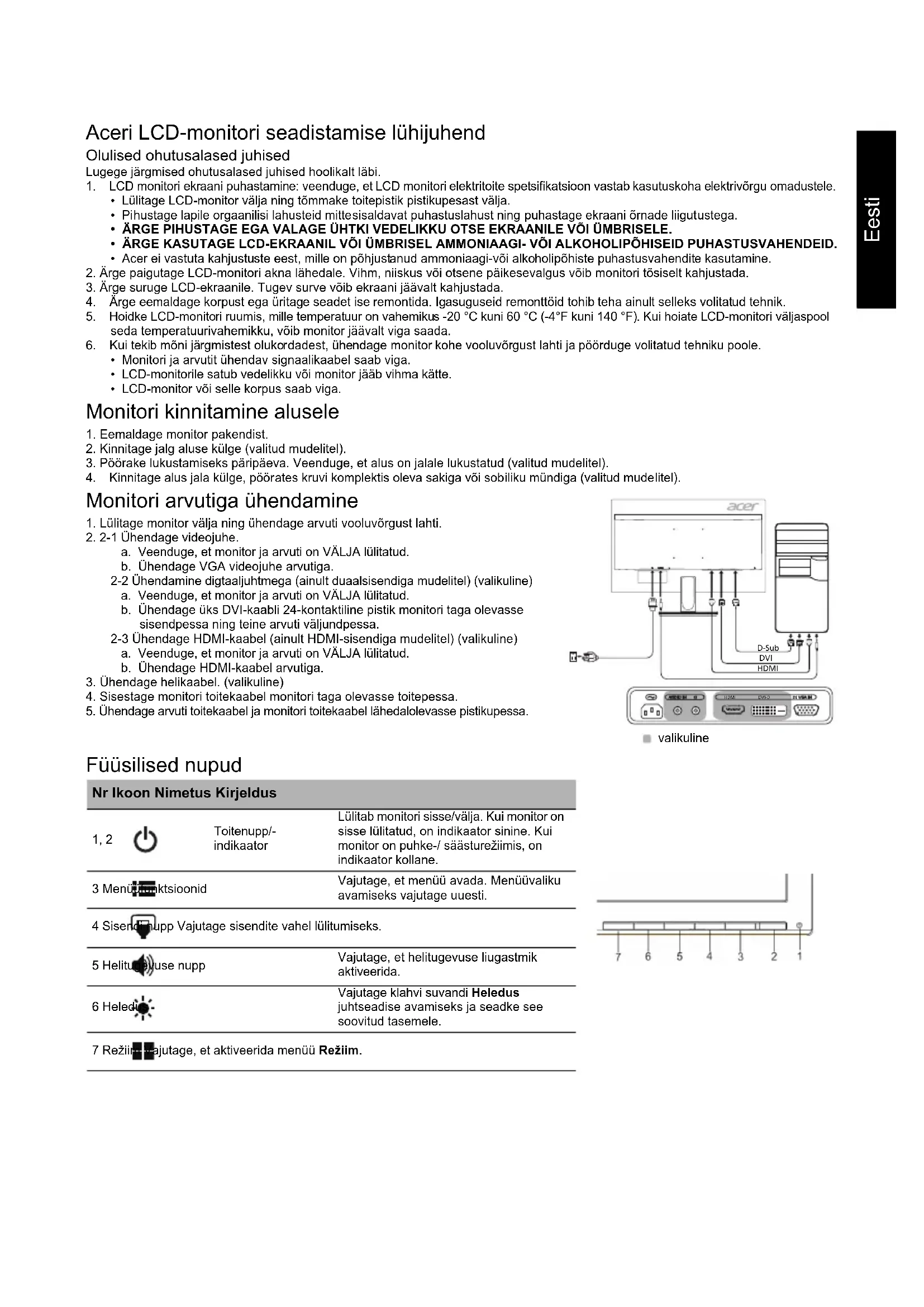 спецификации подлежат на промяна без предизвестие.Eesti Aceri LCD-monitori seadistamise lühijuhend Olulised ohutusalased juhised Lugege järgmised ohutusalased juhised hoolikalt läbi. 1. LCD monitori ekraani puhastamine: veenduge, et LCD monitori elektritoite spetsifikatsioon vastab kasutuskoha elektrivõrgu omadustele.