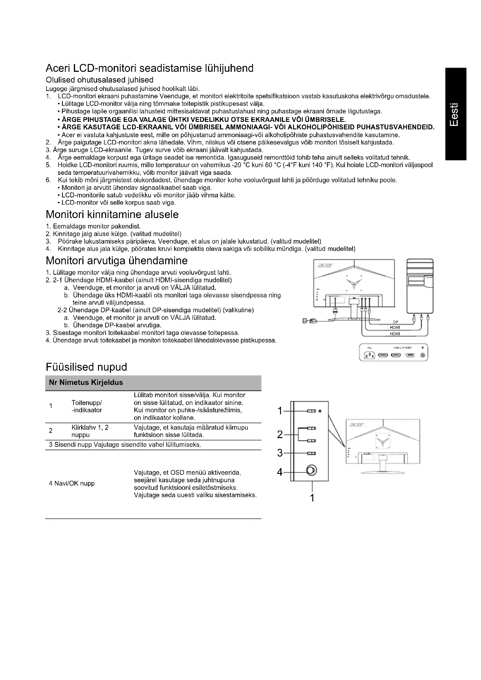 Monitori arvutiga ühendamine 1. Lülitage monitor välja ning ühendage arvuti vooluvõrgust lahti.2. 2-1 Ühendage HDMI-kaabel (ainult HDMI-sisendiga mudelitel)a. Veenduge, et monitor ja arvuti on VÄLJA lülitatud.b. Ühendage üks HDMI-kaabli ots monitori taga olevasse sisendpessa ning teine arvuti väljundpessa.2-2 Ühendage DP-kaabel (ainult DP-sisendiga mudelitel) (valikuline)a. Veenduge, et monitor ja arvuti on VÄLJA lülitatud.b. Ühendage DP-kaabel arvutiga.3. Sisestage monitori toitekaabel monitori taga olevasse toitepessa.4. Ühendage arvuti toitekaabel ja monitori toitekaabel lähedalolevasse pistikupessa. Füüsilised nupud Nr Nimetus Kirjeldus