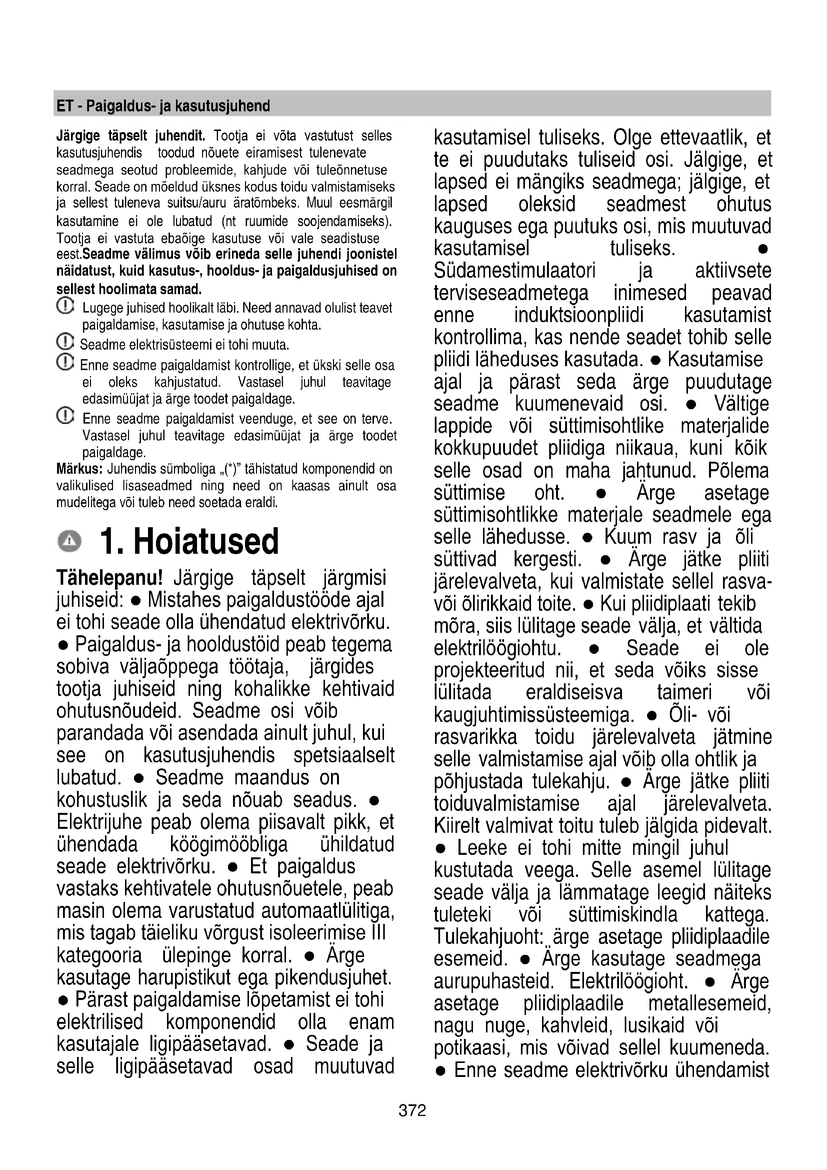 Tähelepanu! Järgige täpselt järgmisi juhiseid: ● Mistahes paigaldustööde ajal ei tohi seade olla ühendatud elektrivõrku. ● Paigaldus- ja hooldustöid peab tegema sobiva väljaõppega töötaja, järgides tootja juhiseid ning kohalikke kehtivaid ohutusnõudeid. Seadme osi võib parandada või asendada ainult juhul, kui see on kasutusjuhendis spetsiaalselt lubatud. ● Seadme maandus on kohustuslik ja seda nõuab seadus. ● Elektrijuhe peab olema piisavalt pikk, et ühendada köögimööbliga ühildatud seade elektrivõrku. ● Et paigaldus vastaks kehtivatele ohutusnõuetele, peab masin olema varustatud automaatlülitiga, mis tagab täieliku võrgust isoleerimise III kategooria ülepinge korral. ● Ärge kasutage harupistikut ega pikendusjuhet. ● Pärast paigaldamise lõpetamist ei tohi elektrilised komponendid olla enam kasutajale ligipääsetavad. ● Seade ja selle ligipääsetavad osad muutuvad kasutamisel tuliseks. Olge ettevaatlik, et te ei puudutaks tuliseid osi. Jälgige, et lapsed ei mängiks seadmega; jälgige, et lapsed oleksid seadmest ohutus kauguses ega puutuks osi, mis muutuvad kasutamisel tuliseks. ● Südamestimulaatori ja aktiivsete terviseseadmetega inimesed peavad enne induktsioonpliidi kasutamist kontrollima, kas nende seadet tohib selle pliidi läheduses kasutada. ● Kasutamise ajal ja pärast seda ärge puudutage seadme kuumenevaid osi. ● Vältige lappide või süttimisohtlike materjalide kokkupuudet pliidiga niikaua, kuni kõik selle osad on maha jahtunud. Põlema süttimise oht. ● Ärge asetage süttimisohtlikke materjale seadmele ega selle lähedusse. ● Kuum rasv ja õli süttivad kergesti. ● Ärge jätke pliiti järelevalveta, kui valmistate sellel rasva- või õlirikkaid toite. ● Kui pliidiplaati tekib mõra, siis lülitage seade välja, et vältida elektrilöögiohtu. ● Seade ei ole projekteeritud nii, et seda võiks sisse lülitada eraldiseisva taimeri või kaugjuhtimissüsteemiga. ● Õli- või rasvarikka toidu järelevalveta jätmine selle valmistamise ajal võib olla ohtlik ja põhjustada tulekahju. ● Ärge jätke pliiti toiduvalmistamise ajal järelevalveta. Kiirelt valmivat toitu tuleb jälgida pidevalt. ● Leeke ei tohi mitte mingil juhul kustutada veega. Selle asemel lülitage seade välja ja lämmatage leegid näiteks tuleteki või süttimiskindla kattega. Tulekahjuoht: ärge asetage pliidiplaadile esemeid. ● Ärge kasutage seadmega aurupuhasteid. Elektrilöögioht. ● Ärge asetage pliidiplaadile metallesemeid, nagu nuge, kahvleid, lusikaid või potikaasi, mis võivad sellel kuumeneda. ● Enne seadme elektrivõrku ühendamist373 kontrollige, kas andmesildil (seadme alumisel küljel) toodud väärtused sobivad elektrivõrgu ja pistiku pinge ning võimsusega. Kahtluste korral pöörduge väljaõppinud elektriku poole. Tähtis: ● Pärast kasutamist lülitage keeduala vastavast nupust välja, ärge usaldage seda, mida näitab keedunõude detektor. ● Vältige vedeliku sattumist pliidile ning vedelike keetmisel või soojendamisel kasutage madalat kuumust. ● Soojendavad osad ei tohi töötada, kui neil on tühjad anumad või kui neil anumaid ei ole. ● Pärast toiduvalmistamise lõpetamist lülitage vastav keeduala välja. ● Ärge valmistage toitu fooliumis ega asetage otse pliidile fooliumi pakitud toitu. Alumiiniumist foolium sulab ja kahjustab pliiti pöördumatult. ● Ärge soojendage pliidil konservikarpe või plekkpurke, mida ei ole enne avatud ● need võivad plahvatada! See hoiatus kehtib igat tüüpi pliidi kohta. ● Suure võimsuse, näiteks funktsiooni Booster kasutamine ei sobi kõigi vedelike soojendamisel (nii ei tohi soojendada nt praadimisõli). Liigne kuumus võib olla ohtlik. Neil juhtudel on soovitatav on kasutada väiksemat võimsust. ● Pott/pann tuleb asetada otse pliidiplaadile ja keeduala keskele. Mitte mingil juhul ei tohi midagi panna pliidiplaadi ja poti/panni vahele. ● Kõrge temperatuuri korral vähendab seade keedualade võimsust automaatselt. ● Enne seadme puhastamist või mis tahes hooldustöö tegemist eraldage seade elektrivõrgust, võttes toitekaabli pistiku pistikupesast välja või lülitades peakilbist välja seadme elektriühenduse pealüliti. ● Kõigi paigaldus- ja hooldustööde tegemisel kasutage töökindaid. ● Lapsed alates 8. eluaastast, piiratud füüsiliste, sensoorsete või vaimsete võimetega inimesed ning isikud, kellel puuduvad selleks kogemused või teadmised, tohivad seadet kasutada ainult järelevalve all või kui neid on õpetatud seadet turvaliselt kasutama ning nad mõistavad kasutusest tulenevaid ohte. ● Tuleb kontrollida, et lapsed ei mängiks seadmega. ● Lapsed ei tohi ilma järelevalveta teha puhastus- ja hooldustöid. ● Kui seadme paigalduskohas kasutatakse gaasi või mõne muu kütteainega töötavaid seadmeid, peab kindlasti olema tagatud piisav ventilatsioon. ● Seadet tuleb korrapäraselt puhastada nii seest kui ka väljast (VÄHEMALT KORD KUUS), pidades seejuures kinni hooldusjuhendis esitatud täpsetest nõuetest. ● Seadme puhastusnõuete ja filtrite puhastamise või vahetamise kohustuse eiramine toob kaasa tuleohu. ● Leekide kasutamise toidu valmistamisel on rangelt keelatud. ● Lahtine leek kahjustab filtreid ja võib põhjustada tulekahju, seepärast tuleb selle kasutamist igal juhul vältida. ● Praadimisel olge ettevaatlik, et vältida kuuma õli süttimist. TÄHELEPANU: Kui pliidiplaat töötab, võivad seadme ligipääsetavad osad kuumeneda. Tähelepanu! Ärge ühendage seadet elektrivõrku enne, kui paigaldamine on täielikult lõpule viidud. ● Suitsu väljatõmbe tehniliste ja ohutusmeetmete kohaldamisel pidage eranditult kinni kohalike asjakohaste volitatud ametite määrustest. ● Puhastatavat õhku ei tohi suunata torusse, mis on mõeldud gaasi või mõne muu kütusega töötava seadme suitsu väljajuhtimiseks. Seadme kasutamine on keelatud, kui võre pole õigesti paigaldatud! ● Paigaldamisel kasutage
