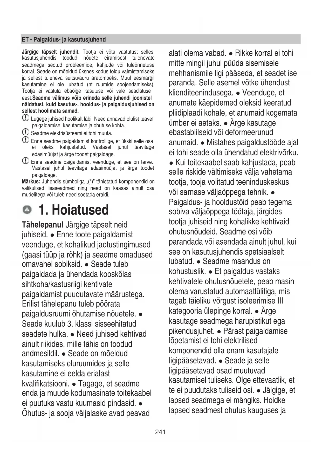 Tähelepanu! Järgige täpselt neid juhiseid. ● Enne toote paigaldamist veenduge, et kohalikud jaotustingimused (gaasi tüüp ja rõhk) ja seadme omadused omavahel sobiksid. ● Seade tuleb paigaldada ja ühendada kooskõlas sihtkoha/kastusriigi kehtivate paigaldamist puudutavate määrustega. Erilist tähelepanu tuleb pöörata paigaldusruumi õhutamise nõuetele. ● Seade kuulub 3. klassi sisseehitatud seadete hulka. ● Need juhised kehtivad ainult riikides, mille tähis on toodud andmesildil. ● Seade on mõeldud kasutamiseks eluruumides ja selle kasutamine ei eelda erialast kvalifikatsiooni. ● Tagage, et seadme enda ja muude kodumasinate toitekaabel ei puutuks vastu kuumasid pindasid. ● Õhutus- ja sooja väljalaske avad peavad alati olema vabad. ● Rikke korral ei tohi mitte mingil juhul püüda sisemisele mehhanismile ligi pääseda, et seadet ise paranda. Selle asemel võtke ühendust klienditeenindusega. ● Veenduge, et anumate käepidemed oleksid keeratud pliidiplaadi kohale, et anumaid kogemata ümber ei aetaks. ● Ärge kasutage ebastabiilseid või deformeerunud anumaid. ● Mistahes paigaldustööde ajal ei tohi seade olla ühendatud elektrivõrku. ● Kui toitekaabel saab kahjustada, peab selle riskide vältimiseks välja vahetama tootja, tooja volitatud teeninduskeskus või sarnase väljaõppega tehnik. ● Paigaldus- ja hooldustöid peab tegema sobiva väljaõppega töötaja, järgides tootja juhiseid ning kohalikke kehtivaid ohutusnõudeid. Seadme osi võib parandada või asendada ainult juhul, kui see on kasutusjuhendis spetsiaalselt lubatud. ● Seadme maandus on kohustuslik. ● Et paigaldus vastaks kehtivatele ohutusnõuetele, peab masin olema varustatud automaatlülitiga, mis tagab täieliku võrgust isoleerimise III kategooria ülepinge korral. ● Ärge kasutage seadmega harupistikut ega pikendusjuhet. ● Pärast paigaldamise lõpetamist ei tohi elektrilised komponendid olla enam kasutajale ligipääsetavad. ● Seade ja selle ligipääsetavad osad muutuvad kasutamisel tuliseks. Olge ettevaatlik, et te ei puudutaks tuliseid osi. ● Jälgige, et lapsed seadmega ei mängiks. Hoidke lapsed seadmest ohutus kauguses ja242 jälgige neid, sest seadme ligipääsetavad osad muutuvad kasutamisel väga tuliseks. ● Kasutamise ajal ja pärast seda ärge puudutage seadme kuumenevaid osi. ● Vältige lappide või süttimisohtlike materjalide kokkupuudet pliidiplaadiga niikaua, kuni kõik selle osad on maha jahtunud. ● Ärge asetage süttimisohtlikke materjale seadmele ega selle lähedusse. ● Kuum rasv ja õli süttivad kergesti. Olge eriti hoolikas, kui valmistate rasva- või õlirikast toitu. ● Kui pliidiplaati tekib mõra, siis elektrilöögiohtu vältimiseks lülitage seade välja. ● Seade ei ole projekteeritud nii, et seda võiks sisse lülitada eraldiseisva taimeri või kaugjuhtimissüsteemiga. ● Ärge jätke pliiti toiduvalmistamise ajal järelevalveta. ● Leeke ei tohi mitte mingil juhul kustutada veega. Selle asemel lülitage seade välja ja lämmatage leegid näiteks tuleteki või süttimiskindla kattega. Tulekahjuoht: ärge asetage pliidiplaadile esemeid. ● Ärge kasutage seadmega aurupuhasteid. ● Enne seadme elektrivõrku ühendamist kontrollige, kas andmesildil (seadme alumisel küljel) toodud väärtused sobivad elektrivõrgu ja pistiku pinge ning võimsusega. Kahtluste korral pöörduge väljaõppinud elektriku poole. Tähtis! ● Pärast kasutamist lülitage seade välja. ● Et vältida vedelike ülevoolamist, vähendage leegi intensiivsust. ● Soojendavad osad ei tohi töötada, kui neil on tühjad anumad või kui neil anumaid ei ole. ● Pärast toiduvalmistamise lõpetamist lülitage kasutatud keedualad välja. ● Ärge asetage töötavale pliidiplaadile tühjasid anumeid. ● Ärge kasutage anumaid, mis ulatuvad üle pliidiplaadi ääre.