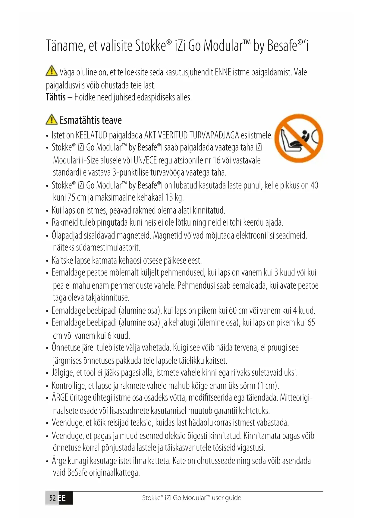 - Stokke® iZi Go Modular™ by Besafe®i saab paigaldada vaatega taha iZi Modulari i-Size alusele või UN/ECE regulatsioonile nr 16 või vastavale standardile vastava 3-punktilise turvavööga vaatega taha.