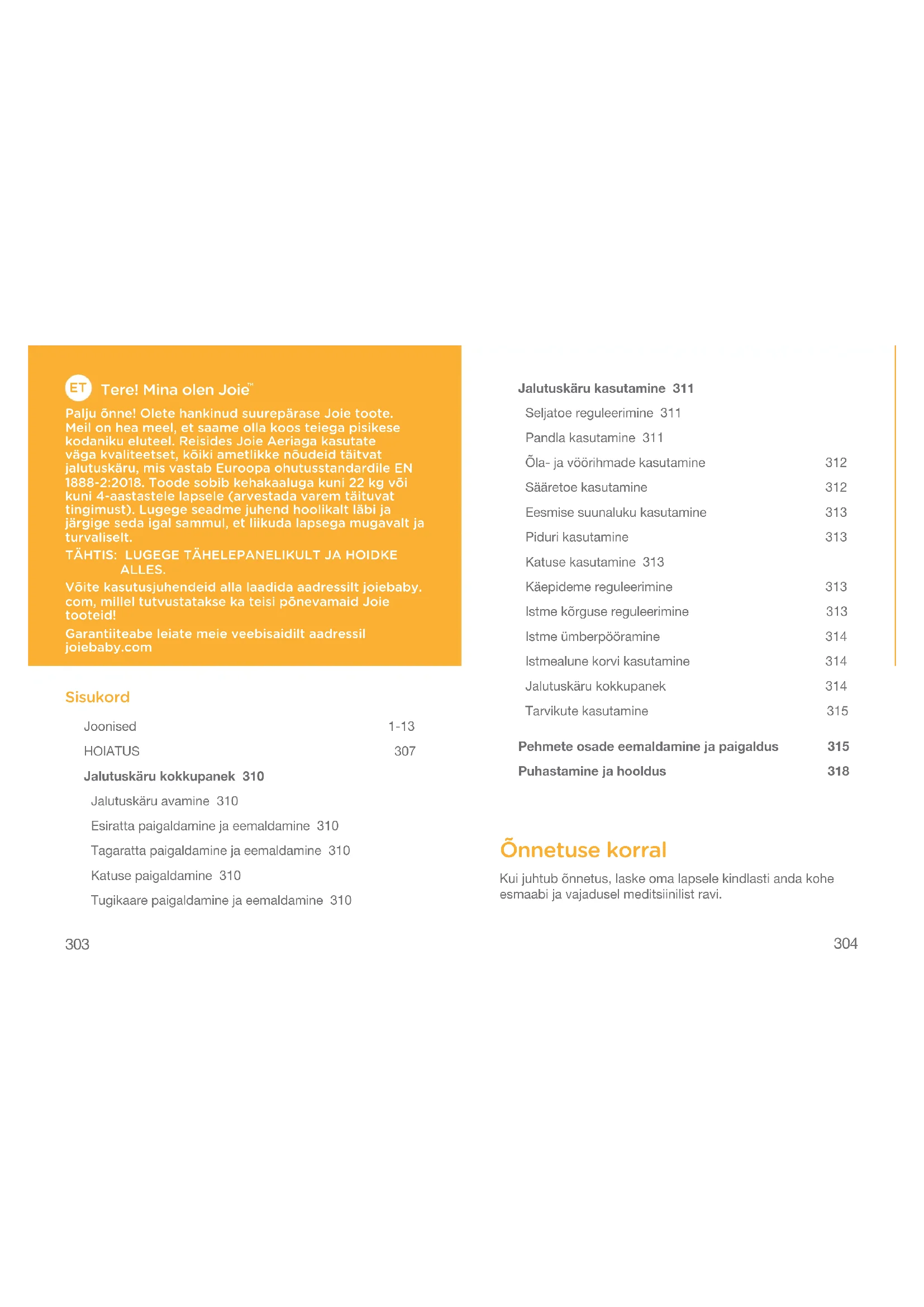 Palju õnne! Olete hankinud suurepärase Joie toote. Meil on hea meel, et saame olla koos teiega pisikese kodaniku eluteel. Reisides Joie Aeriaga kasutate väga kvaliteetset, kõiki ametlikke nõudeid täitvat jalutuskäru, mis vastab Euroopa ohutusstandardile EN 1888-2:2018. Toode sobib kehakaaluga kuni 22kg või kuni 4-aastastele lapsele (arvestada varem täituvat tingimust). Lugege seadme juhend hoolikalt läbi ja järgige seda igal sammul, et liikuda lapsega mugavalt ja turvaliselt. TÄHTIS: LUGEGE TÄHELEPANELIKULT JA HOIDKE ALLES. Võite kasutusjuhendeid alla laadida aadressilt joiebaby. com, millel tutvustatakse ka teisi põnevamaid Joie tooteid! Garantiiteabe leiate meie veebisaidilt aadressil joiebaby.com Sisukord Joonised 1-13 HOIATUS 307 Jalutuskäru kokkupanek 310 Jalutuskäru avamine 310 Esiratta paigaldamine ja eemaldamine 310 Tagaratta paigaldamine ja eemaldamine 310 Katuse paigaldamine 310 Tugikaare paigaldamine ja eemaldamine 310 Jalutuskäru kasutamine 311 Seljatoe reguleerimine 311 Pandla kasutamine 311 Õla- ja vöörihmade kasutamine 312 Sääretoe kasutamine 312 Eesmise suunaluku kasutamine 313 Piduri kasutamine 313 Katuse kasutamine 313 Käepideme reguleerimine 313 Istme kõrguse reguleerimine 313 Istme ümberpööramine 314 Istmealune korvi kasutamine 314 Jalutuskäru kokkupanek 314 Tarvikute kasutamine 315 Pehmete osade eemaldamine ja paigaldus 315 Puhastamine ja hooldus 318 Õnnetuse korral Kui juhtub õnnetus, laske oma lapsele kindlasti anda kohe esmaabi ja vajadusel meditsiinilist ravi.305