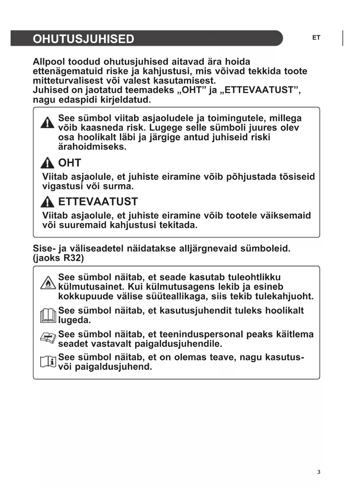 Allpool toodud ohutusjuhised aitavad ära hoida ettenägematuid riske ja kahjustusi, mis võivad tekkida toote mitteturvalisest või valest kasutamisest. Juhised on jaotatud teemadeks „OHT” ja „ETTEVAATUST”, nagu edaspidi kirjeldatud. See sümbol viitab asjaoludele ja toimingutele, millega võib kaasneda risk. Lugege selle sümboli juures olev osa hoolikalt läbi ja järgige antud juhiseid riski ärahoidmiseks. OHT Viitab asjaolule, et juhiste eiramine võib põhjustada tõsiseid vigastusi või surma. ETTEVAATUST Viitab asjaolule, et juhiste eiramine võib tootele väiksemaid või suuremaid kahjustusi tekitada. Sise- ja väliseadetel näidatakse alljärgnevaid sümboleid. (jaoks R32) See sümbol näitab, et seade kasutab tuleohtlikku külmutusainet. Kui külmutusagens lekib ja esineb kokkupuude välise süüteallikaga, siis tekib tulekahjuoht. See sümbol näitab, et kasutusjuhendit tuleks hoolikalt lugeda. See sümbol näitab, et teeninduspersonal peaks käitlema seadet vastavalt paigaldusjuhendile. See sümbol näitab, et on olemas teave, nagu kasutus- või paigaldusjuhend.4