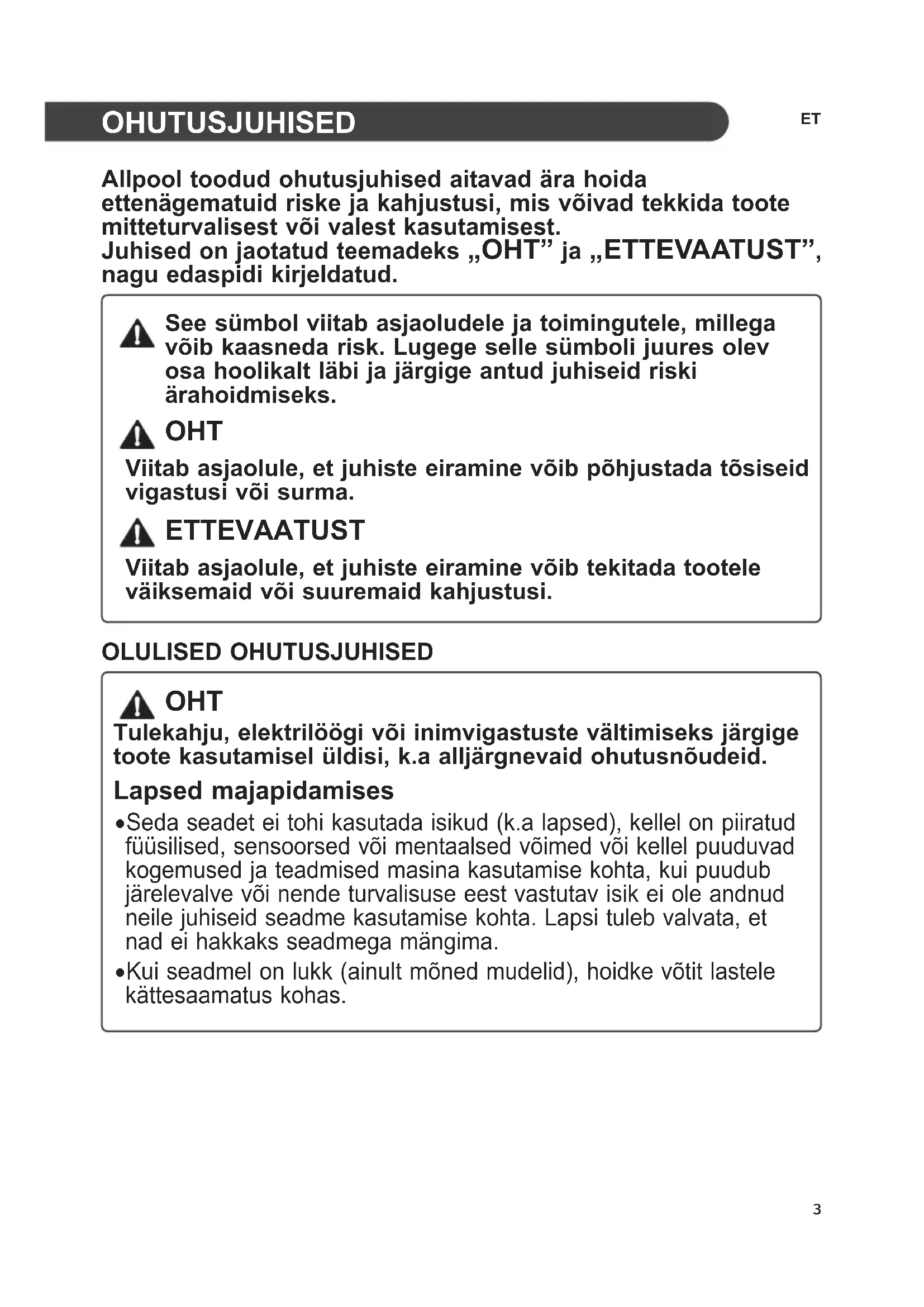 Allpool toodud ohutusjuhised aitavad ära hoida ettenägematuid riske ja kahjustusi, mis võivad tekkida toote mitteturvalisest või valest kasutamisest. Juhised on jaotatud teemadeks „OHT” ja „ETTEVAATUST”, nagu edaspidi kirjeldatud. See sümbol viitab asjaoludele ja toimingutele, millega võib kaasneda risk. Lugege selle sümboli juures olev osa hoolikalt läbi ja järgige antud juhiseid riski ärahoidmiseks. OHT Viitab asjaolule, et juhiste eiramine võib põhjustada tõsiseid vigastusi või surma. ETTEVAATUST Viitab asjaolule, et juhiste eiramine võib tekitada tootele väiksemaid või suuremaid kahjustusi. OLULISED OHUTUSJUHISED OHT Tulekahju, elektrilöögi või inimvigastuste vältimiseks järgige toote kasutamisel üldisi, k.a alljärgnevaid ohutusnõudeid. Lapsed majapidamises