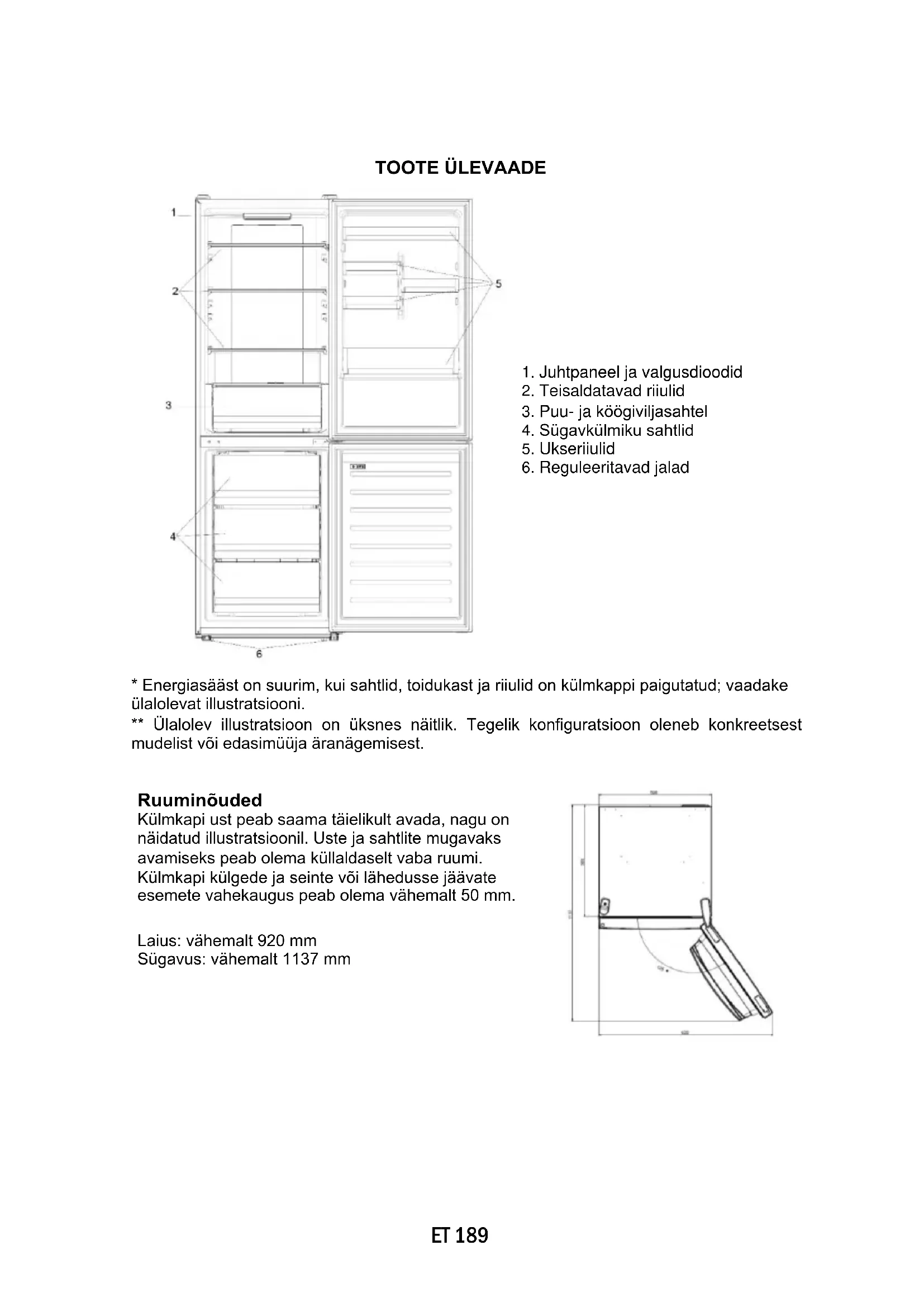 - Energiasääst on suurim, kui sahtlid, toidukast ja riiulid on külmkappi paigutatud; vaadake ülalolevat illustratsiooni. ** Ülalolev illustratsioon on üksnes näitlik. Tegelik konfiguratsioon oleneb konkreetsest mudelist või edasimüüja äranägemisest. Ruuminõuded Külmkapi ust peab saama täielikult avada, nagu on näidatud illustratsioonil. Uste ja sahtlite mugavaks avamiseks peab olema küllaldaselt vaba ruumi. Külmkapi külgede ja seinte või lähedusse jäävate esemete vahekaugus peab olema vähemalt 50 mm. Laius: vähemalt 920 mm Sügavus: vähemalt 1137 mmET 190 KASUTAMINE Sisse-/väljalülitusnupp külmkapi sisse või välja lülitamiseks. Režiiminupp SET külmiku temperatuuri või erifunktsioonide valimiseks. Kiirjahutusfunktsiooni Super Cool ikoon, mis annab ülevaate sellest, kas funktsioon on aktiveeritud. Temperatuuritasemed, mis annavad ülevaate valitud temperatuurist. Kasutamine