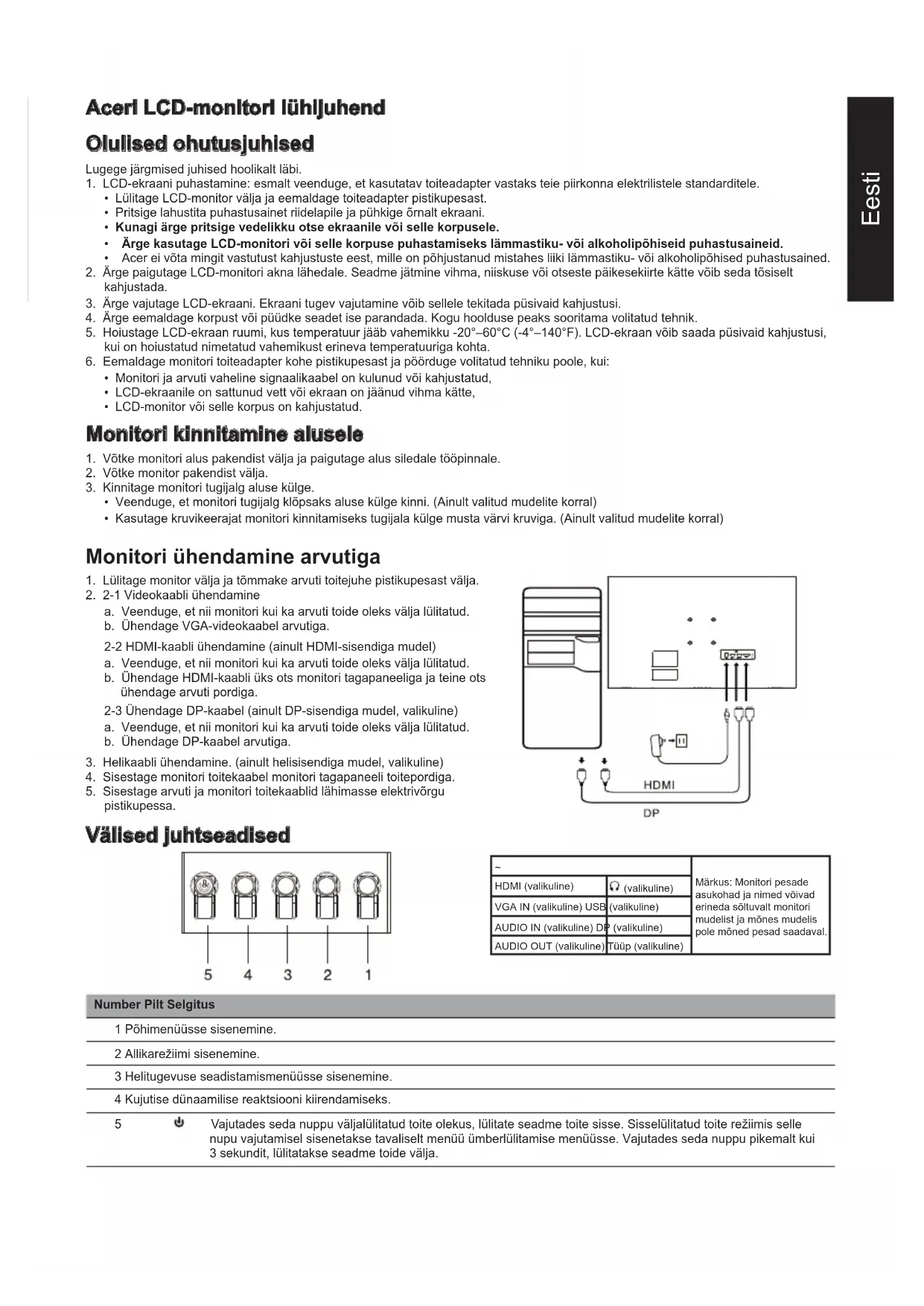 Märkus: Monitori pesade asukohad ja nimed võivad erineda sõltuvalt monitori mudelist ja mõnes mudelis pole mõned pesad saadaval. HDMI (valikuline) (valikuline) VGA IN (valikuline) USB (valikuline) AUDIO IN (valikuline) DP (valikuline) AUDIO OUT (valikuline) Tüüp (valikuline) Number Pilt Selgitus 1 Põhimenüüsse sisenemine. 2 Allikarežiimi sisenemine. 3 Helitugevuse seadistamismenüüsse sisenemine. 4 Kujutise dünaamilise reaktsiooni kiirendamiseks. 5 Vajutades seda nuppu väljalülitatud toite olekus, lülitate seadme toite sisse. Sisselülitatud toite režiimis selle nupu vajutamisel sisenetakse tavaliselt menüü ümberlülitamise menüüsse. Vajutades seda nuppu pikemalt kui 3 sekundit, lülitatakse seadme toide välja.Eesti Normatiivsed ja ohutuseeskirjad FCC-avaldus Seda toodet on testitud ja leitud, et see seade vastab FCC-reeglite 15. osa klass B digiseadme piirnormidele. Vastavad piirnormid on koostatud, et pakkuda koju paigaldatud seadmete jaoks mõistlikku kaitset kahjulike häirete eest. See seade genereerib, kasutab ja võib kiirata raadiosageduslikku energiat ning kui seade pole paigaldatud ega seda ei kasutata vastavalt juhistele, võib see põhjustada raadioside häireid. Siiski pole mingit garantiid, et ka asjakohasel paigaldusel häireid ei tekiks. Kui seade põhjustab raadio- või televisioonisaate vastuvõttu kahjustavaid häireid, (mida saab tuvastada seadet sisse/välja lülitades), võib kasutaja häirete kõrvaldamiseks proovida ühte või mitut järgmist viisi: