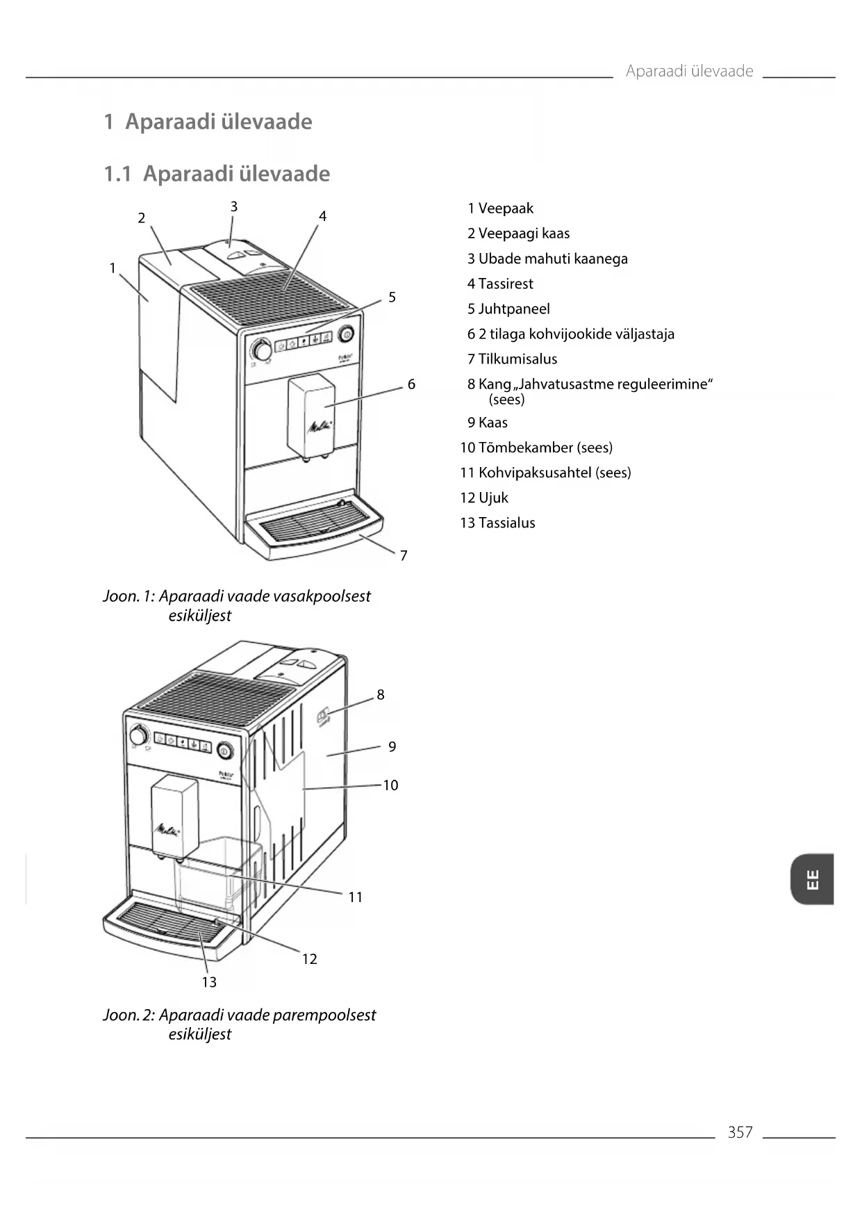 Joon. 2: Aparaadi vaade parempoolsest esiküljest 1 Veepaak 2 Veepaagi kaas 3 Ubade mahuti kaanega 4 Tassirest 5 Juhtpaneel 6 2 tilaga kohvijookide väljastaja 7 Tilkumisalus 8 Kang „Jahvatusastme reguleerimine“ (sees) 9 Kaas 10 Tõmbekamber (sees) 11 Kohvipaksusahtel (sees) 12 Ujuk 13 TassialusAparaadi ülevaade