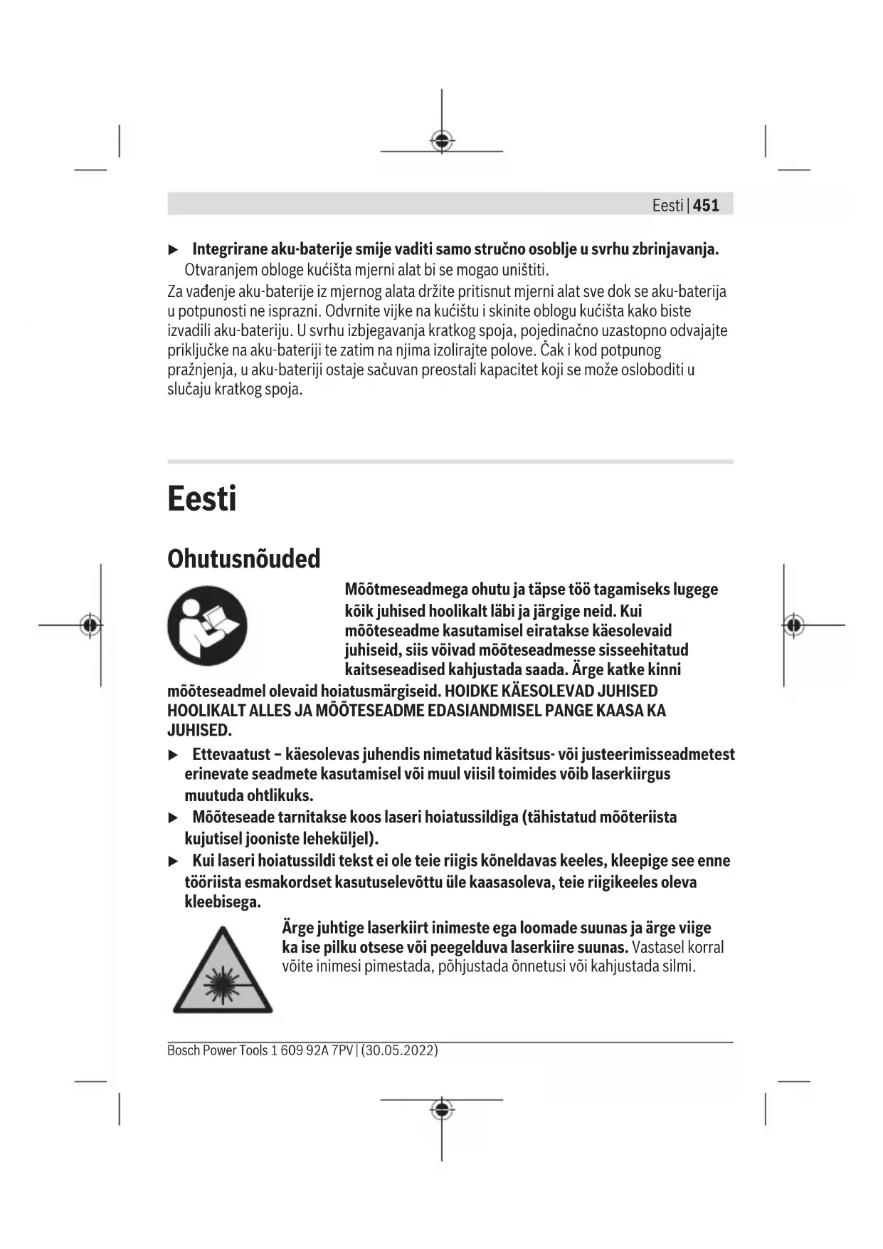 Liitiumioonaku laadimine u Kasutage laadimiseks USB-toiteplokki, mille tehnilised andmed (pinge ja laadimisvool) vastavad soovitatud toiteploki andmetele. Järgige USB-toiteallika kasutusjuhendit. Soovitatav toiteallikas: vt tehnilised andmed. u Pöörake tähelepanu võrgupingele! Vooluallika pinge peab vastama pistiktoiteploki tüübisildil märgitud pingele. 230V-ga tähistatud pistiktoiteplokke võib kasutada ka pingega 220V. Liitiumioonakud tarnitakse rahvusvaheliste transpordieeskirjade tõttu osaliselt laetuna. Aku täisvõimsuse tagamiseks laadige aku enne esmakordset kasutamist täielikult. Lisateavet leiate veebikasutusjuhendist: www.bosch-pt.com/manuals Kasutamine Kasutuselevõtt u Ärge jätke sisselülitatud mõõteseadet järelevalveta ja lülitage mõõteseade pärast kasutamist välja. Laserkiir võib teisi inimesi pimestada. u Kaitske mõõteriista niiskuse ja otsese päikesekiirguse eest. u Ärge jätke mõõteriista äärmuslike temperatuuride ja temperatuurikõikumiste kätte. Ärge jätke seda nt pikemaks ajaks autosse. Suurte temperatuurikõikumiste 1 609 92A 7PV | (30.05.2022) Bosch Power ToolsEesti | 459 korral laske mõõteriistal enne kasutuselevõtmist esmalt keskkonnatemperatuuriga kohaneda. Äärmuslike temperatuuride või temperatuurikõikumiste korral võib mõõteriista täpsus väheneda. u Vältige tugevaid lööke ja mõõteseadme kukkumist. Pärast tugevaid välismõjusid mõõteriistale tuleks enne töö jätkamist alati teostada täpsuskontroll (vaadake „Täpsuse kontroll“, Lehekülg464). Sisse-/väljalülitamine Mõõteseadme ja laseri sisselülitamiseks vajutage nuppu . Mõõteseadme saate sisse lülitada ka ilma laserita, vajutades nuppu . Vajutage ja hoidke all nuppu , et lülitada mõõteseade välja. Mälus olevad väärtused ja seadme seaded jäävad alles. Kaamera Vajutage nuppu / , selleks et kaamerat sisse või välja lülitada. Pärast mõõteseadme väljalülitamist jääb valitud olek salvestatuks. Suuremate kauguste puhul (ca > 5m) kuvatakse täiendavalt sihimärgistus, selleks et mõõtepunkti märgistada. Lisateavet leiate veebikasutusjuhendist: www.bosch-pt.com/manuals Mõõtmine Pärast sisselülitamist on mõõteseade pikkuse mõõtmise režiimil. Sisselülitamise järel on mõõtmise lähtetasandiks mõõteseadme tagaserv. Lähtetasandit saab muuta:. (vaadake „Lähtetasandi valik“, Lehekülg460) Asetage mõõteseade mõõtmise soovitud alguspunkti (nt vastu seina). Vajutage mõõtmise alustamiseks nuppu . Pärast mõõtmist lülitub laserikiir välja. Uueks mõõtmiseks korrake seda toimingut. Mõõteväärtusi ja lõpptulemusi saab liita või lahutada. Sisselülitatud püsiva laserkiire puhul ja pidevmõõtmise funktsioonis algab mõõtmine juba pärast esimest vajutamist nupule . Sisselülitatud püsivat laserkiirt ei lülitata pärast mõõtmist välja Püsiv laserkiir. Bosch Power Tools 1 609 92A 7PV | (30.05.2022)460 | Eesti Lisateavet leiate veebikasutusjuhendist: www.bosch-pt.com/manuals Mõõteseadet ei tohi mõõtmise ajal liigutada. Seepärast asetage mõõteseade võimaluse korral stabiilsele tugi- või aluspinnale. Vastuvõtulääts(20), laserkiirguse väljumisava(21) ja kaamera(22) ei tohi mõõtmise ajal kinni kaetud olla. Lähtetasandi valik Mõõtmiseks saate valida erinevate lähtetasandite vahel: mõõteseadme tagaserv (nt seinale toetamisel), Positsioonimisplaadi ots 180° võrra kokkuklapitav (nt nurkadest mõõtmiseks) mõõteseadme esiserv (nt lauaservalt mõõtmisel), statiivi keerme(19) keskpunkt (nt statiiviga mõõtmisel). Lisateavet leiate veebikasutusjuhendist: www.bosch-pt.com/manuals Põhiseadete menüü Menüü Põhiseaded sisaldab järgmisi põhiseadeid: – Bluetooth® sisse-/väljalülitamine – Lähtetasandi vahetamine (vaadake „Lähtetasandi valik“, Lehekülg460) – Taimeri funktsioon – Püsiva laserkiire sisse-/väljalülitamine – Kalde mõõtmise kalibreerimine (vaadake „Täpsuse kontroll“, Lehekülg464) – Sihtnäidiku kalibreerimine – Mälu kustutamine (GLM 150-27 C) 1 609 92A 7PV | (30.05.2022) Bosch Power ToolsEesti | 461 – Keele seadistamine – Kuupäeva ja kellaaja seadistamine – Mõõtühiku vahetamine – Nurga ühiku vahetamine – PRO360 aktiveerimine – Seadme teabe kuvamine – Helisignaalide sisse-/väljalülitamine – Väljalülitusaja seadistamine – Hämardusaja seadistamine – Ekraani heleduse seadistamine – Ekraani automaatse pööramise sisse-/väljalülitamine Vajutage lühidalt nuppu või hoidke nuppu alla vajutatuna, selleks et avada menüü Põhiseadistused . Valige soovitud seade nupuga või nupuga . Selleks et mingi valik kinnitada, vajutage nuppu . Selleks et menüüst Põhiseadistused lahkuda, vajutage nuppu või nuppu . Lisateavet leiate veebikasutusjuhendist: www.bosch-pt.com/manuals Mõõtefunktsioonid Mõõtefunktsioonide valimine/muutmine Funktsioonide menüüst leiate järgmised funktsioonid: – Pikkuse mõõtmine – Pindala mõõtmine – Ruumala mõõtmine – Kaudne kauguse mõõtmine
