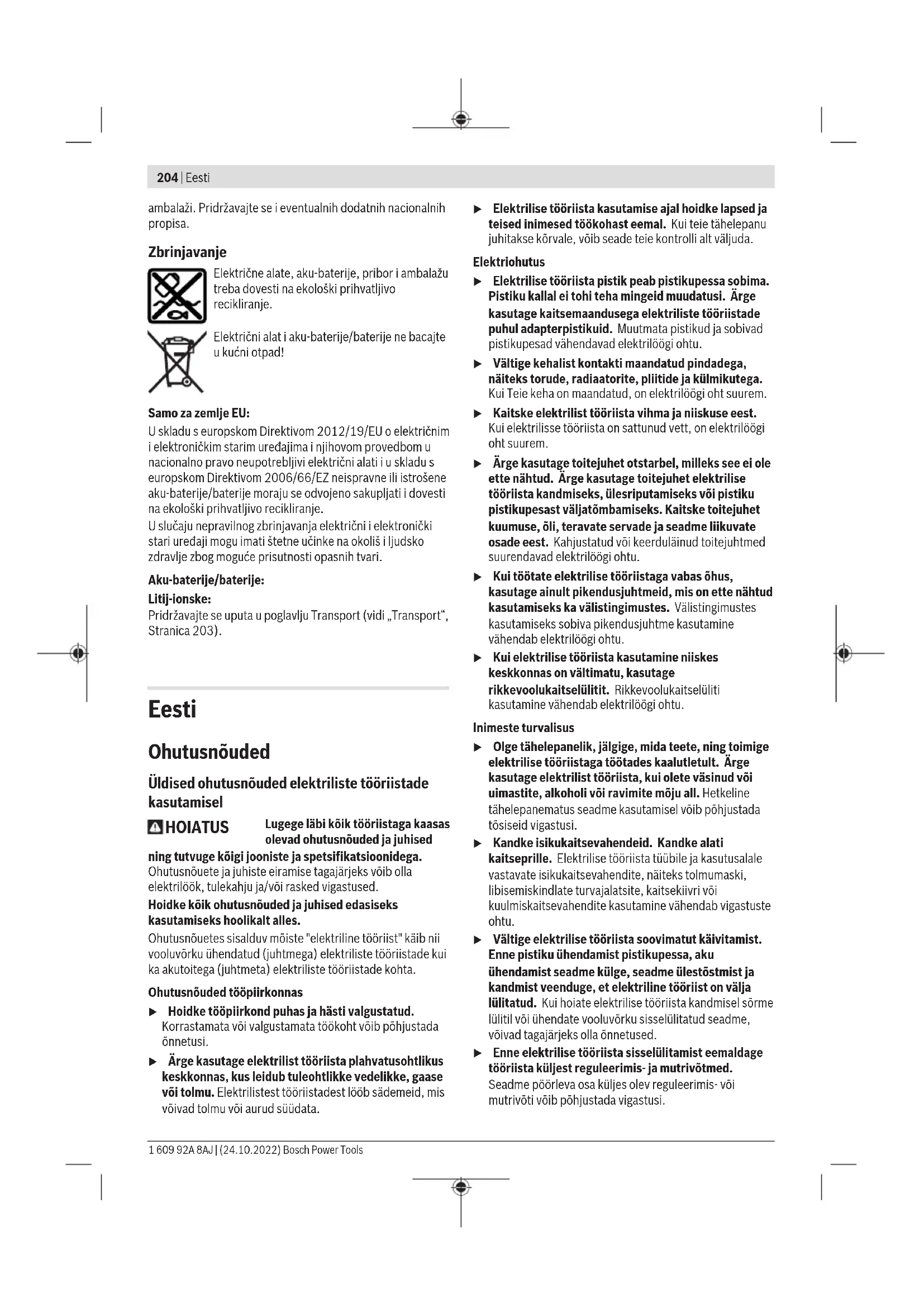 Low Energy Module GCY 30-4 opremljen je radijskim sučeljem. Potrebno je uvažavati propise o ograničenju korištenja, npr. u zrakoplovima ili bolnicama. u Električni alat stavite na maticu/vijak samo u isključenom stanju. Rotirajući radni alati mogu kliznuti. Nakon duljeg rada s manjim brojem okretaja, električni alat trebate ostaviti da u svrhu hlađenja radi cca. 3minute pri maks. broju okretaja u praznom hodu. Kod bušenja u metal koristite samo besprijekorna, naoštrena HSS svrdla (HSS=brzorezni čelik). Odgovarajuću kvalitetu jamči program Bosch pribora. Prije uvrtanja većih, duljih vijaka u tvrde materijale trebate s promjerom jezgre navoja prethodno bušiti na cca. 2/3 duljine vijka. Održavanje i servisiranje Održavanje i čišćenje u Prije svih radova na električnom alatu (npr. održavanje, zamjena alata, itd.), kao i kod njegovog transporta i spremanja, aku-bateriju treba izvaditi iz električnog alata. Kod nehotičnog aktiviranja prekidača za uključivanje/isključivanje postoji opasnost od ozljeda. u Električni alat i otvore za hlađenje održavajte čistima kako bi se moglo dobro i sigurno raditi. Servisna služba i savjeti o uporabi Naša servisna služba će odgovoriti na vaša pitanja o popravku i održavanju vašeg proizvoda, kao i o rezervnim dijelovima. Crteže u rastavljenom obliku i informacije o rezervnim dijelovima možete naći i na našoj adresi: www.bosch-pt.com Tim Bosch savjetnika o uporabi rado će odgovoriti na vaša pitanja o našim proizvodima i njihovom priboru. U slučaju upita ili naručivanja rezervnih dijelova, molimo vas obavezno navedite 10‑znamenkasti kataloški broj s tipske pločice proizvoda. Hrvatski Robert Bosch d.o.o PT/SHR-BSC Kneza Branimira 22 10040 Zagreb Tel.: +385 12 958 051 Fax: +385 12 958 050 E-Mail: RBKN-bsc@hr.bosch.com www.bosch.hr Ostale adrese servisa možete pronaći na: www.bosch-pt.com/serviceaddresses Transport Preporučene litij-ionske aku-baterije podliježu zakonu o transportu opasnih tvari. Korisnik bez ikakvih preduvjeta može transportirati aku-baterije cestovnim transportom. Ako transport obavlja treća strana (npr. transport zrakoplovom ili špedicija), treba se pridržavati posebnih zahtjeva za ambalažu i označavanje. Kod pripreme ovakvih pošiljki za transport prethodno se treba savjetovati sa stručnjakom za transport opasnih tvari. Aku-bateriju šaljite nekim transportnim sredstvom samo ako je njezino kućište neoštećeno. Oblijepite otvorene kontakte i zapakirajte aku-bateriju tako da se ne može pomicati u Bosch Power Tools 1 609 92A 8AJ | (24.10.2022)204 | Eesti ambalaži. Pridržavajte se i eventualnih dodatnih nacionalnih propisa. Zbrinjavanje Električne alate, aku-baterije, pribor i ambalažu treba dovesti na ekološki prihvatljivo recikliranje. Električni alat i aku-baterije/baterije ne bacajte u kućni otpad! Samo za zemljeEU: U skladu s europskom Direktivom 2012/19/EU o električnim i elektroničkim starim uređajima i njihovom provedbom u nacionalno pravo neupotrebljivi električni alati i u skladu s europskom Direktivom 2006/66/EZ neispravne ili istrošene aku-baterije/baterije moraju se odvojeno sakupljati i dovesti na ekološki prihvatljivo recikliranje. U slučaju nepravilnog zbrinjavanja električni i elektronički stari uređaji mogu imati štetne učinke na okoliš i ljudsko zdravlje zbog moguće prisutnosti opasnih tvari. Aku-baterije/baterije: Litij-ionske: Pridržavajte se uputa u poglavlju Transport (vidi „Transport“, Stranica203). Eesti Ohutusnõuded Üldised ohutusnõuded elektriliste tööriistade kasutamisel HOIATUS Lugege läbi kõik tööriistaga kaasas olevad ohutusnõuded ja juhised ning tutvuge kõigi jooniste ja spetsifikatsioonidega. Ohutusnõuete ja juhiste eiramise tagajärjeks võib olla elektrilöök, tulekahju ja/või rasked vigastused. Hoidke kõik ohutusnõuded ja juhised edasiseks kasutamiseks hoolikalt alles. Ohutusnõuetes sisalduv mõiste "elektriline tööriist" käib nii vooluvõrku ühendatud (juhtmega) elektriliste tööriistade kui ka akutoitega (juhtmeta) elektriliste tööriistade kohta. Ohutusnõuded tööpiirkonnas u Hoidke tööpiirkond puhas ja hästi valgustatud. Korrastamata või valgustamata töökoht võib põhjustada õnnetusi. u Ärge kasutage elektrilist tööriista plahvatusohtlikus keskkonnas, kus leidub tuleohtlikke vedelikke, gaase või tolmu. Elektrilistest tööriistadest lööb sädemeid, mis võivad tolmu või aurud süüdata. u Elektrilise tööriista kasutamise ajal hoidke lapsed ja teised inimesed töökohast eemal. Kui teie tähelepanu juhitakse kõrvale, võib seade teie kontrolli alt väljuda. Elektriohutus u Elektrilise tööriista pistik peab pistikupessa sobima. Pistiku kallal ei tohi teha mingeid muudatusi. Ärge kasutage kaitsemaandusega elektriliste tööriistade puhul adapterpistikuid. Muutmata pistikud ja sobivad pistikupesad vähendavad elektrilöögi ohtu. u Vältige kehalist kontakti maandatud pindadega, näiteks torude, radiaatorite, pliitide ja külmikutega. Kui Teie keha on maandatud, on elektrilöögi oht suurem. u Kaitske elektrilist tööriista vihma ja niiskuse eest. Kuielektrilisse tööriista on sattunud vett, on elektrilöögi oht suurem. u Ärge kasutage toitejuhet otstarbel, milleks see ei ole ette nähtud. Ärge kasutage toitejuhet elektrilise tööriista kandmiseks, ülesriputamiseks või pistiku pistikupesast väljatõmbamiseks. Kaitske toitejuhet kuumuse, õli, teravate servade ja seadme liikuvate osade eest. Kahjustatud või keerduläinud toitejuhtmed suurendavad elektrilöögi ohtu. u Kui töötate elektrilise tööriistaga vabas õhus, kasutage ainult pikendusjuhtmeid, mis on ette nähtud kasutamiseks ka välistingimustes. Välistingimustes kasutamiseks sobiva pikendusjuhtme kasutamine vähendab elektrilöögi ohtu. u Kui elektrilise tööriista kasutamine niiskes keskkonnas on vältimatu, kasutage rikkevoolukaitselülitit. Rikkevoolukaitselüliti kasutamine vähendab elektrilöögi o