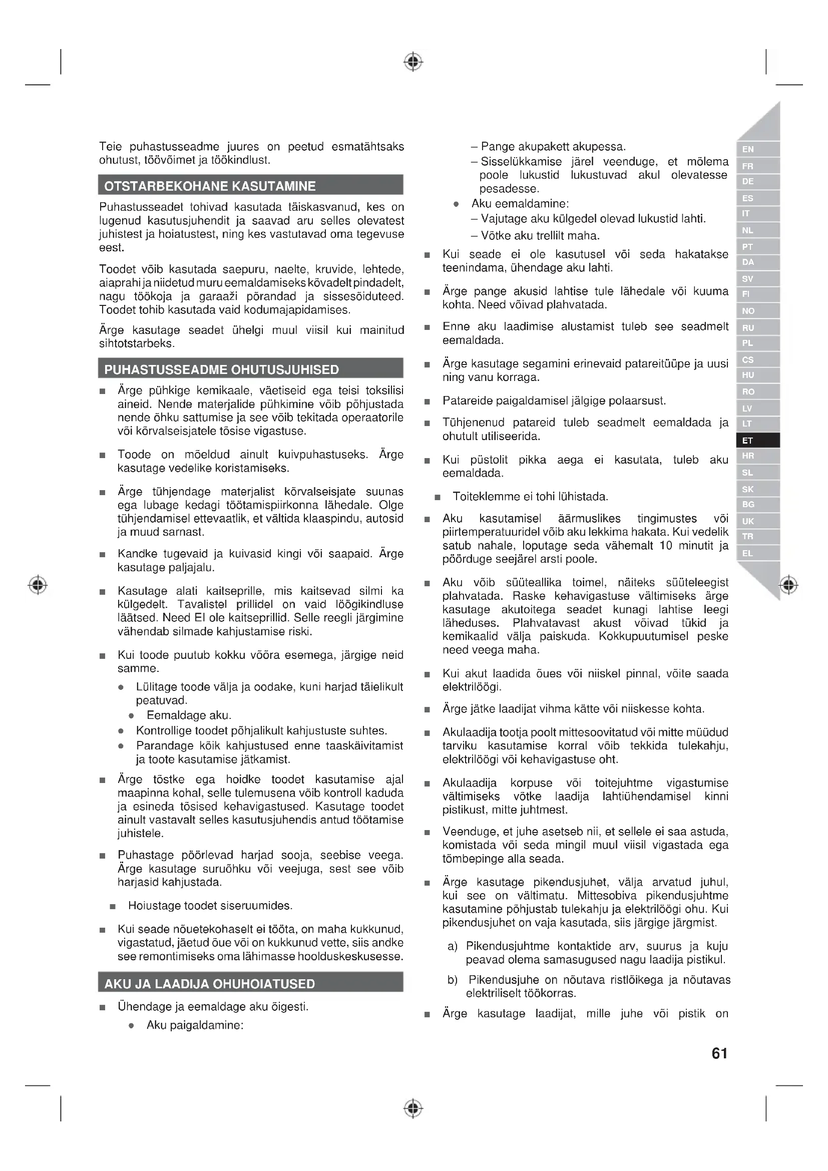 Saugos perspơjimas CE atitiktis V Voltai Nuolatinơ srovơ „EurAsian“ atitikties ženklas Atidžiai persikaitykite instrukcijas prieš pradơdami naudoti mechanizmą. Ukrainos atitikties ženklas Ilgus plaukus privaloma surišti ir nesiartinti prie oro Ƴleidimo angos, nes galima susižaloti. Valymo plotis Elektriniǐ produktǐ atliekos neturi bnjti metamos kartu su namǐ njkio atliekomis. Prašome perdirbkite jas ten, kur yra tokios perdirbimo bazơs. Dơl perdirbimo patarimo kreipkitơs Ƴ savo vietinĊ savivaldybĊ ar pardavơją. SIMBOLIAI VADOVE Pastaba Detalơs arba priedai yra parduodami atskirai Atrakinti BloƷƝtƗjs Greitis, minimalus Greitis, maksimalus Šie signaliniai žodžiai yra skirti nurodyti su prietaiso naudojimu susijusio pavojaus lygƳ. PAVOJUS Rodo grĊsianþią pavojingą situaciją, kurios neišvengus galima patirti mirtiną arba sunkǐ sužalojimą, ƲSPƠJIMAS Rodo potencialiai pavojingą situaciją, kurios neišvengus galima patirti mirtiną arba sunkǐ sužalojimą. ATSARGIAI Rodo potencialiai pavojingą situaciją, kurios neišvengus galima patirti nesunkǐ arba vidutinio sunkumo sužalojimą. ATSARGIAI (Be Ƴspơjamojo šauktuko) Reiškia situaciją, kurioje galima sugadinti turtą. 60 | LietuviškaiTeie puhastusseadme juures on peetud esmatähtsaks ohutust, töövõimet ja töökindlust. OTSTARBEKOHANE KASUTAMINE Puhastusseadet tohivad kasutada täiskasvanud, kes on lugenud kasutusjuhendit ja saavad aru selles olevatest juhistest ja hoiatustest, ning kes vastutavad oma tegevuse eest. Toodet võib kasutada saepuru, naelte, kruvide, lehtede, aiaprahi ja niidetud muru eemaldamiseks kõvadelt pindadelt, nagu töökoja ja garaaži põrandad ja sissesõiduteed. Toodet tohib kasutada vaid kodumajapidamises. Ärge kasutage seadet ühelgi muul viisil kui mainitud sihtotstarbeks. PUHASTUSSEADME OHUTUSJUHISED Ŷ Ärge pühkige kemikaale, väetiseid ega teisi toksilisi aineid. Nende materjalide pühkimine võib põhjustada nende õhku sattumise ja see võib tekitada operaatorile või kõrvalseisjatele tõsise vigastuse. Ŷ Toode on mõeldud ainult kuivpuhastuseks. Ärge kasutage vedelike koristamiseks. Ŷ Ärge tühjendage materjalist kõrvalseisjate suunas ega lubage kedagi töötamispiirkonna lähedale. Olge tühjendamisel ettevaatlik, et vältida klaaspindu, autosid ja muud sarnast. Ŷ Kandke tugevaid ja kuivasid kingi või saapaid. Ärge kasutage paljajalu. Ŷ Kasutage alati kaitseprille, mis kaitsevad silmi ka külgedelt. Tavalistel prillidel on vaid löögikindluse läätsed. Need EI ole kaitseprillid. Selle reegli järgimine vähendab silmade kahjustamise riski. Ŷ Kui toode puutub kokku võõra esemega, järgige neid samme. Ɣ Lülitage toode välja ja oodake, kuni harjad täielikult peatuvad. Ɣ Eemaldage aku. Ɣ Kontrollige toodet põhjalikult kahjustuste suhtes. Ɣ Parandage kõik kahjustused enne taaskäivitamist ja toote kasutamise jätkamist. Ŷ Ärge tõstke ega hoidke toodet kasutamise ajal maapinna kohal, selle tulemusena võib kontroll kaduda ja esineda tõsised kehavigastused. Kasutage toodet ainult vastavalt selles kasutusjuhendis antud töötamise juhistele. Ŷ Puhastage pöörlevad harjad sooja, seebise veega. Ärge kasutage suruõhku või veejuga, sest see võib harjasid kahjustada. Ŷ Hoiustage toodet siseruumides. Ŷ Kui seade nõuetekohaselt ei tööta, on maha kukkunud, vigastatud, jäetud õue või on kukkunud vette, siis andke see remontimiseks oma lähimasse hoolduskeskusesse.