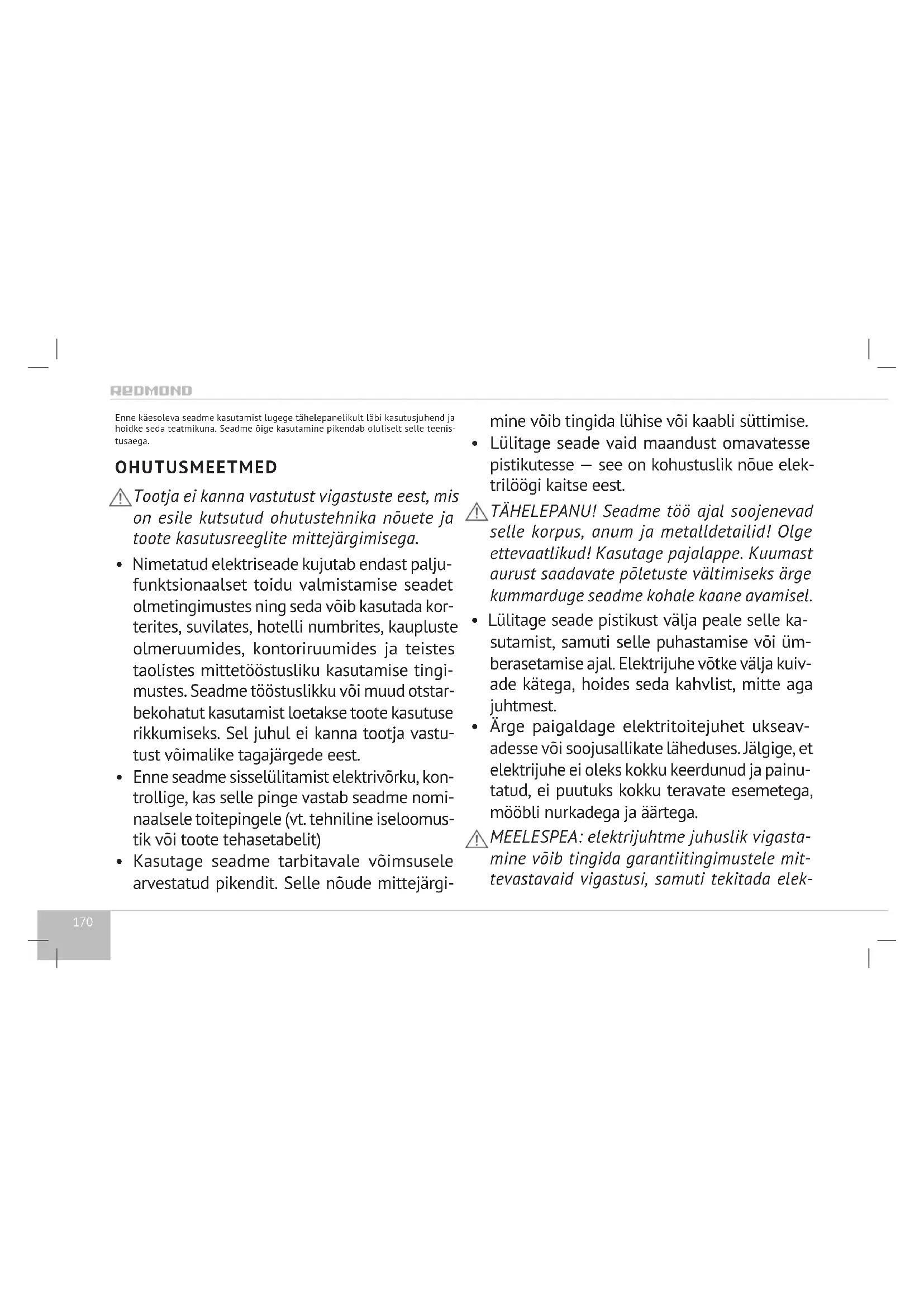Lülitage seade vaid maandust omavatesse pistikutesse — see on kohustuslik nõue elek- trilöögi kaitse eest. TÄHELEPANU! Seadme töö ajal soojenevad selle korpus, anum ja metalldetailid! Olge ettevaatlikud! Kasutage pajalappe. Kuumast aurust saadavate põletuste vältimiseks ärge kummarduge seadme kohale kaane avamisel.