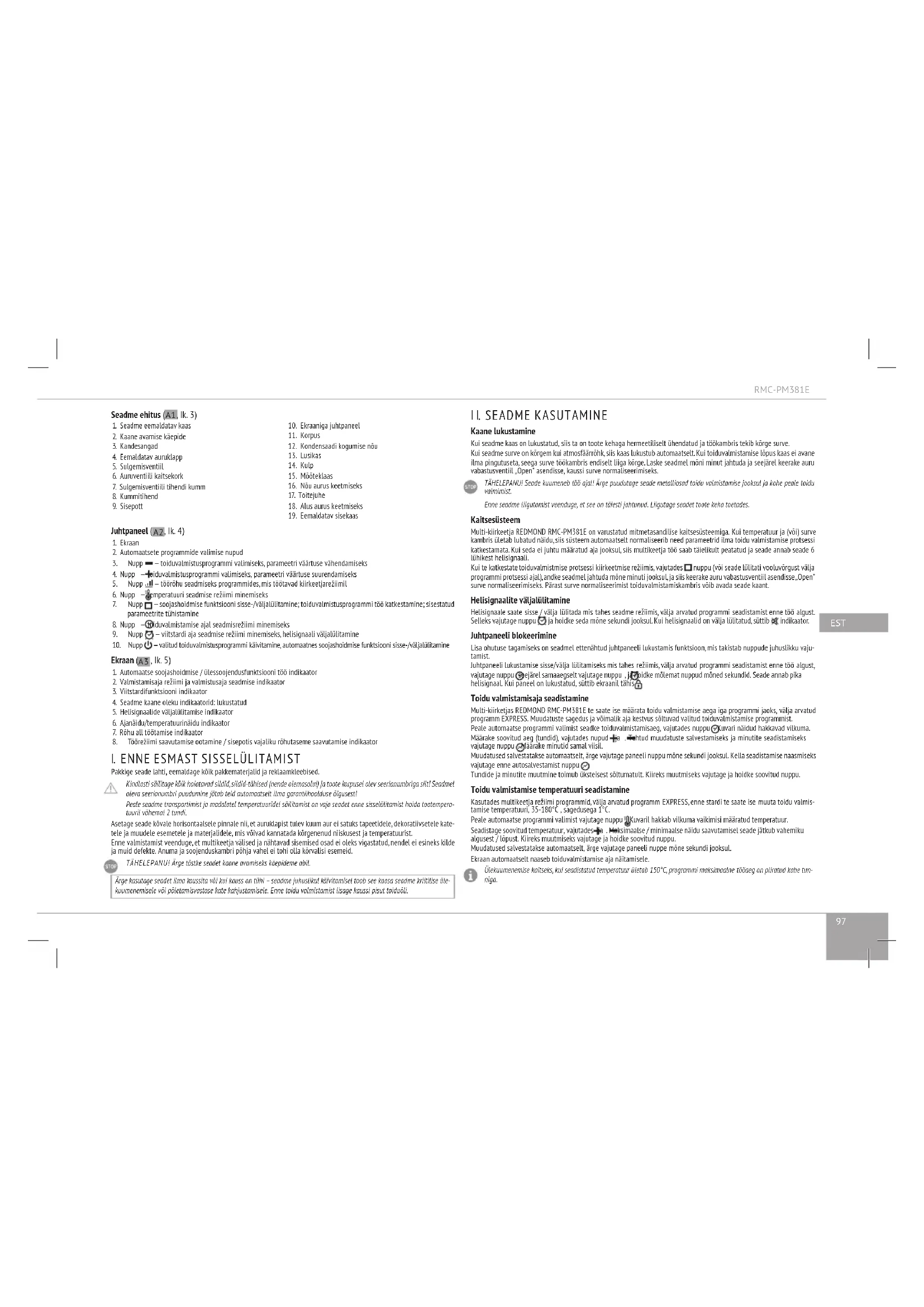 Kaane lukustamine Kui seadme kaas on lukustatud, siis ta on toote kehaga hermeetiliselt ühendatud ja töökambris tekib kõrge surve. Kui seadme surve on kõrgem kui atmosfäärrõhk, siis kaas lukustub automaatselt. Kui toiduvalmistamise lõpus kaas ei avane ilma pingutuseta, seega surve töökambris endiselt liiga kõrge. Laske seadmel mõni minut jahtuda ja seejärel keerake auru vabastusventiil „Open” asendisse, kaussi surve normaliseerimiseks. TÄHELEPANU! Seade kuumeneb töö ajal! Ärge puudutage seade metalliosad toidu valmistamise jooksul ja kohe peale toidu valmimist. Enne seadme liigutamist veenduge, et see on täiesti jahtunud. Liigutage seadet toote keha toetades. Kaitsesüsteem Multi-kiirkeetja REDMOND RMC-PM381E on varustatud mitmetasandilise kaitsesüsteemiga. Kui temperatuur ja (või) surve kambris ületab lubatud näidu, siis süsteem automaatselt normaliseerib need parameetrid ilma toidu valmistamise protsessi katkestamata. Kui seda ei juhtu määratud aja jooksul, siis multikeetja töö saab täielikult peatatud ja seade annab seade 6 lühikest helisignaali. Kui te katkestate toiduvalmistmise protsessi kiirkeetmise režiimis, vajutades nuppu (või seade lülitati vooluvõrgust välja programmi protsessi ajal), andke seadmel jahtuda mõne minuti jooksul, ja siis keerake auru vabastusventiil asendisse „Open” surve normaliseerimiseks. Pärast surve normaliseerimist toiduvalmistamiskambris võib avada seade kaant. Helisignaalite väljalülitamine Helisignaale saate sisse / välja lülitada mis tahes seadme režiimis, välja arvatud programmi seadistamist enne töö algust. Selleks vajutage nuppu ja hoidke seda mõne sekundi jooksul. Kui helisignaalid on välja lülitatud, süttib indikaator. Juhtpaneeli blokeerimine Lisa ohutuse tagamiseks on seadmel ettenähtud juhtpaneeli lukustamis funktsioon, mis takistab nuppude juhuslikku vaju- tamist. Juhtpaneeli lukustamise sisse/välja lülitamiseks mis tahes režiimis, välja arvatud programmi seadistamist enne töö algust, vajutage nuppu seejärel samaaegselt vajutage nuppu , ja hoidke mõlemat nuppud mõned sekundid. Seade annab pika helisignaal. Kui paneel on lukustatud, süttib ekraanil tähis . Toidu valmistamisaja seadistamine Multi-kiirketjas REDMOND RMC-PM381E te saate ise määrata toidu valmistamise aega iga programmi jaoks, välja arvatud programm EXPRESS. Muudatuste sagedus ja võimalik aja kestvus sõltuvad valitud toiduvalmistamise programmist. Peale automaatse programmi valimist seadke toiduvalmistamisaeg, vajutades nuppu . Kuvari näidud hakkavad vilkuma. Määrake soovitud aeg (tundid), vajutades nupud ja . Tehtud muudatuste salvestamiseks ja minutite seadistamiseks vajutage nuppu . Määrake minutid samal viisil. Muudatused salvestatakse automaatselt, ärge vajutage paneeli nuppu mõne sekundi jooksul. Kella seadistamise naasmiseks vajutage enne autosalvestamist nuppu . Tundide ja minutite muutmine toimub üksteisest sõltumatult. Kiireks muutmiseks vajutage ja hoidke soovitud nuppu. Toidu valmistamise temperatuuri seadistamine Kasutades multikeetja režiimi programmid, välja arvatud programm EXPRESS, enne stardi te saate ise muuta toidu valmis- tamise temperatuuri, 35-180°С , sagedusega 1°С. Peale automaatse programmi valimist vajutage nuppu . Kuvaril hakkab vilkuma vaikimisi määratud temperatuur. Seadistage soovitud temperatuur, vajutades ja . Maksimaalse / minimaalse näidu saavutamisel seade jätkub vahemiku algusest / lõpust. Kiireks muutmiseks vajutage ja hoidke soovitud nuppu. Muudatused salvestatakse automaatselt, ärge vajutage paneeli nuppe mõne sekundi jooksul. Ekraan automaatselt naaseb toiduvalmistamise aja näitamisele. Ülekuumenemise kaitseks, kui seadistatud temperatuur ületab 150°С, programmi maksimaalne tööaeg on piiratud kahe tun- niga.98 Surve taseme määramine Kasutades kiirkeetja režiimi programmid, Te saate ise muuta surve tasemet. Survereguleerimise režiimi kasutamiseks vaju- tage nuppu , kuvaril hakkavad vilkuma indikaator ja surve taseme skaala. Surve korrigeerimine toimub nupude ja abiga ja surve taseme skaalal olevate jaotuste arv muutub sümmeetriliselt. Maksimaalse/minimaalse näidu saavuta- misel seade jätkub vahemiku algusest/lõpust. Kiireks muutmiseks vajutage ja hoidke soovitud nuppu. Muudatused salvestatakse automaatselt, ärge vajutage paneeli nuppu mõne sekundi jooksul. Ekraan automaatselt naaseb toiduvalmistamise aja näitamisele, surveindikaatorid lõpetavad vilkumist. Peale automaatse programmi käivitamist hakkab surve tase indikaator vilkuma kuni seade saavutab seadistatud tööpara- meetre, on surve taseme skaala järk-järgult jõuab määratud tasemeni. Pärast tööparameetrite jõudmiseni, mõlemad indikaa- torid jätkuvad kajastuma, kuni toidu valmistamisprotsess on lõppenud. Alguse viivitamine funktsioon Funktsioon „Alguse viivitamine” võimaldab määrata ajaintervalli, mille möödumisel alustatakse toidu valmistamise program- mi. Kellaaeg saab seadistada vahemikus 1 minut kuni 24 tunnini, sagedusega 1 minut. Peale automaatse toiduvalmistamise programmi valimist, „Alguse viivitamise“ programmi määramiseks, vajutage nupp . Ku- varil hakkab põlema indikaator ja kellaaeg hakkab vilkuma. Seadistage soovitud kellaaeg vajutades nupud ja . Muu- datuste salvestmiseks ja minutide seadistamiseks vajutage nuppu . Sama moodi määrake minutid Muudatused salvestatakse automaatselt, ärge vajutage paneeli nuppe mõne sekundi jooksul. Kellaaja seadistamise naasmiseks, enne automaatset salves- tamist, klõpsake uuesti nuppu . Peale automaatset salvestamist indikaator kustub, kuvaril uuesti hakkab põlema indikaa- tor ja kuvar naaseb toiduvalmistamise aega näidule. Selleks et näha algusaja viiviust, vajutage nuppu . Tundide ja minutite muutmine toimub üksteisest sõltumatult. Max/min tähenduse jõudmisel, jätkub seadistamine vahemiku algusest/lõppemisest. Väärtuse kiireks muutmiseks vajutage ja hoidke soovitud nuppu. Funktsioon