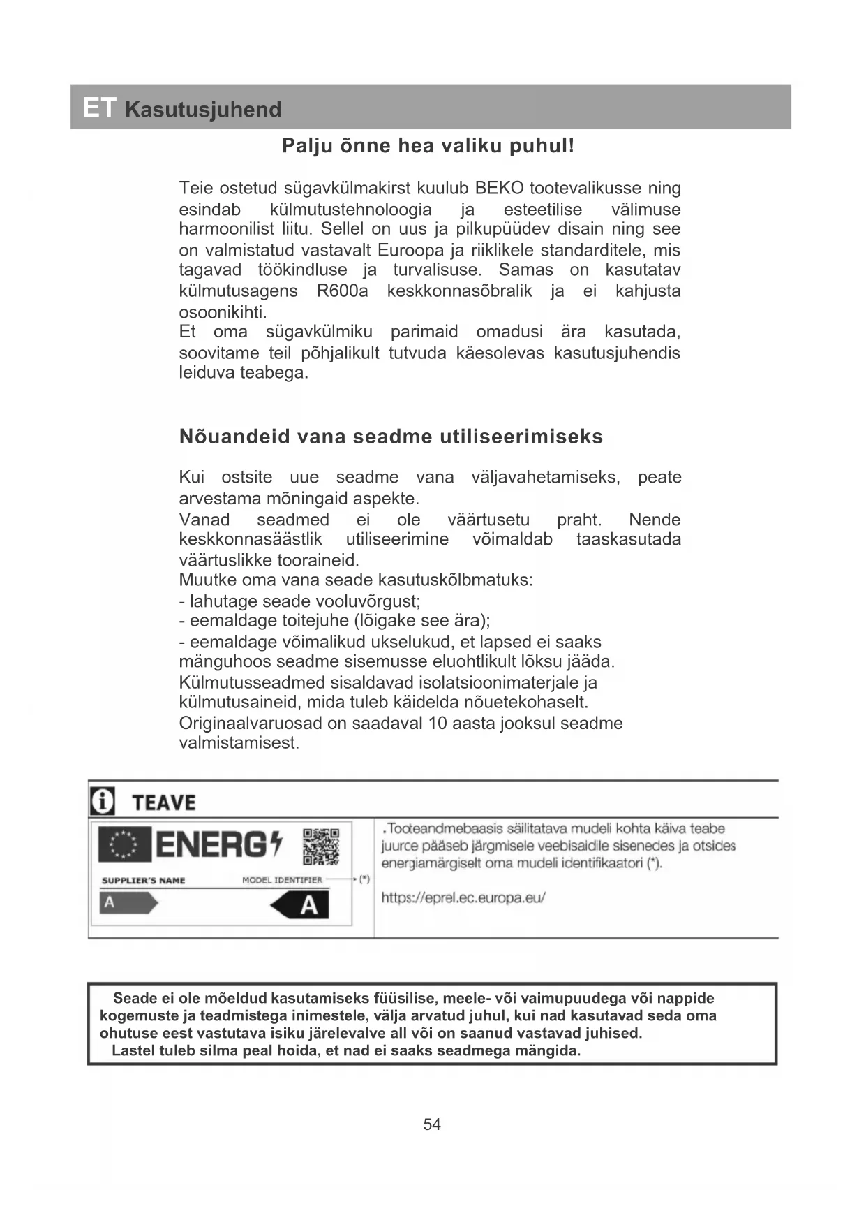 tootevalikusse ning esindab külmutustehnoloogia ja esteetilise välimuse harmoonilist liitu. Sellel on uus ja pilkupüüdev disain ning see on valmistatud vastavalt Euroopa ja riiklikele standarditele, mis tagavad töökindluse ja turvalisuse. Samas on kasutatav külmutusagens R600a keskkonnasõbralik ja ei kahjusta osoonikihti. Et oma sügavkülmiku parimaid omadusi ära kasutada, soovitame teil põhjalikult tutvuda käesolevas kasutusjuhendis leiduva teabega. Nõuandeid vana seadme utiliseerimiseks Kui ostsite uue seadme vana väljavahetamiseks, peate arvestama mõningaid aspekte. Vanad seadmed ei ole väärtusetu praht. Nende keskkonnasäästlik utiliseerimine võimaldab taaskasutada väärtuslikke tooraineid. Muutke oma vana seade kasutuskõlbmatuks: - lahutage seade vooluvõrgust; - eemaldage toitejuhe (lõigake see ära); - eemaldage võimalikud ukselukud, et lapsed ei saaks mänguhoos seadme sisemusse eluohtlikult lõksu jääda. Külmutusseadmed sisaldavad isolatsioonimaterjale ja külmutusaineid, mida tuleb käidelda nõuetekohaselt. Originaalvaruosad on saadaval 10 aasta jooksul seadme valmistamisest.