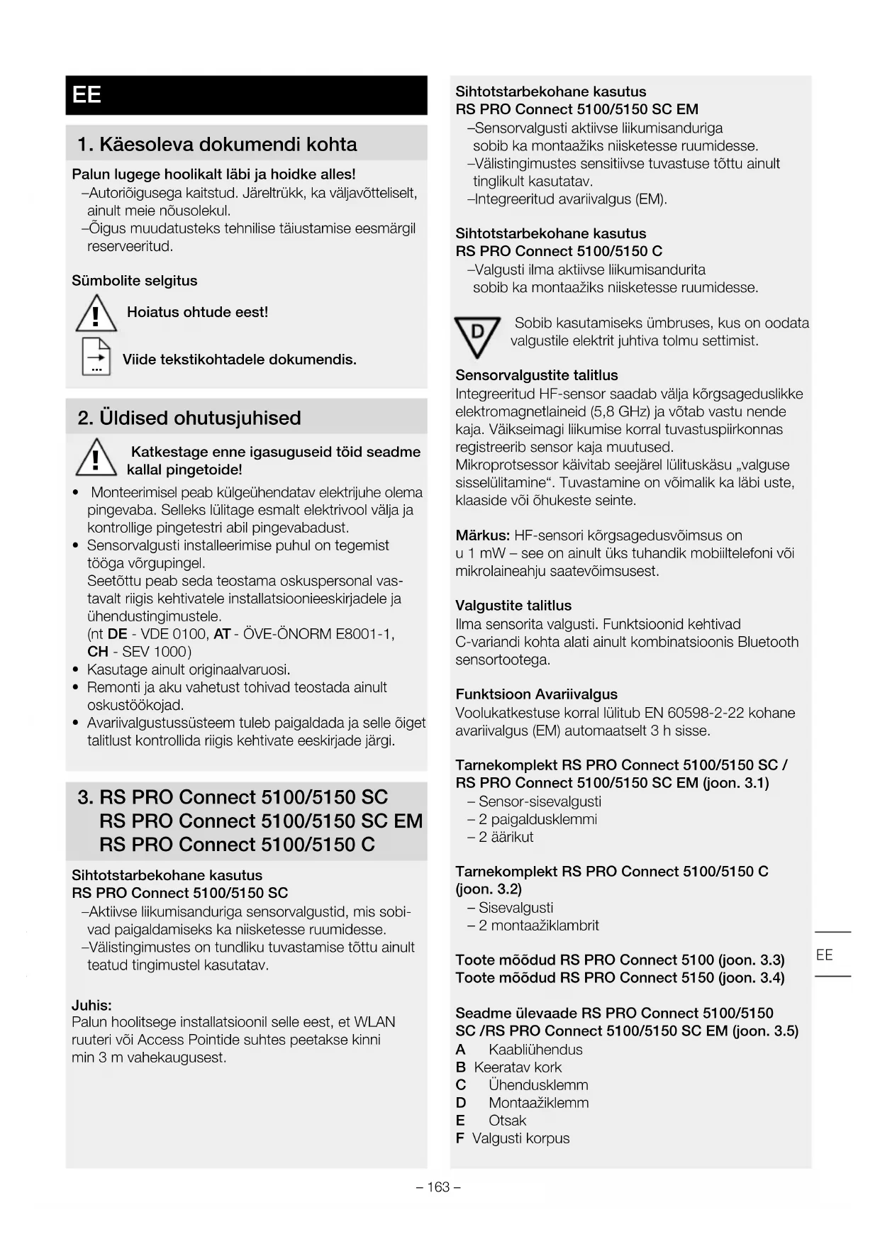 RS PRO Connect 5100/5150 SC EM RS PRO Connect 5100/5150 C Sihtotstarbekohane kasutus RS PRO Connect 5100/5150 SC – Aktiivse liikumisanduriga sensorvalgustid, mis sobi- vad paigaldamiseks ka niisketesse ruumidesse. – Välistingimustes on tundliku tuvastamise tõttu ainult teatud tingimustel kasutatav. Juhis: Palun hoolitsege installatsioonil selle eest, et WLAN ruuteri või Access Pointide suhtes peetakse kinni min 3 m vahekaugusest. Sihtotstarbekohane kasutus RS PRO Connect 5100/5150 SC EM – Sensorvalgusti aktiivse liikumisanduriga sobib ka montaažiks niisketesse ruumidesse. – Välistingimustes sensitiivse tuvastuse tõttu ainult tinglikult kasutatav. – Integreeritud avariivalgus (EM). Sihtotstarbekohane kasutus RS PRO Connect 5100/5150 C – Valgusti ilma aktiivse liikumisandurita sobib ka montaažiks niisketesse ruumidesse. Sobib kasutamiseks ümbruses, kus on oodata valgustile elektrit juhtiva tolmu settimist. Sensorvalgustite talitlus Integreeritud HF-sensor saadab välja kõrgsageduslikke elektromagnetlaineid (5,8 GHz) ja võtab vastu nende kaja. Väikseimagi liikumise korral tuvastuspiirkonnas registreerib sensor kaja muutused. Mikroprotsessor käivitab seejärel lülituskäsu „valguse sisselülitamine“. Tuvastamine on võimalik ka läbi uste, klaaside või õhukeste seinte. Märkus: HF-sensori kõrgsagedusvõimsus on u 1 mW – see on ainult üks tuhandik mobiiltelefoni või mikrolaineahju saatevõimsusest. Valgustite talitlus Ilma sensorita valgusti. Funktsioonid kehtivad C-variandi kohta alati ainult kombinatsioonis Bluetooth sensortootega. Funktsioon Avariivalgus Voolukatkestuse korral lülitub EN 60598-2-22 kohane avariivalgus (EM) automaatselt 3 h sisse. Tarnekomplekt RS PRO Connect 5100/5150 SC / RS PRO Connect 5100/5150 SC EM (joon. 3.1) – Sensor-sisevalgusti – 2 paigaldusklemmi – 2 äärikut Tarnekomplekt RS PRO Connect 5100/5150 C (joon. 3.2) – Sisevalgusti – 2 montaažiklambrit Toote mõõdud RS PRO Connect 5100 (joon. 3.3) Toote mõõdud RS PRO Connect 5150 (joon. 3.4) Seadme ülevaade RS PRO Connect 5100/5150 SC /RS PRO Connect 5100/5150 SC EM (joon. 3.5) A Kaabliühendus B Keeratav kork C Ühendusklemm D Montaažiklemm E Otsak F Valgusti korpus EE– 164 – G HF-sensor H Sisestatav katik Seadme ülevaade RS PRO Connect 5100/5150 C (joon. 3.6) A Kaablikeermik B Pöördsulgur C Ühendusklemm D Montaažiklamber E Otsakübarad F Valgusti korpus Tuvastuspiirkonnad, laemontaaž Ø 1-10m (joon. 3.7) Tuvastuspiirkond, seinamontaaž Ø 1-10m (joon. 3.8) Valgustugevuse jaotus (joon. 3.9 - 3.14)