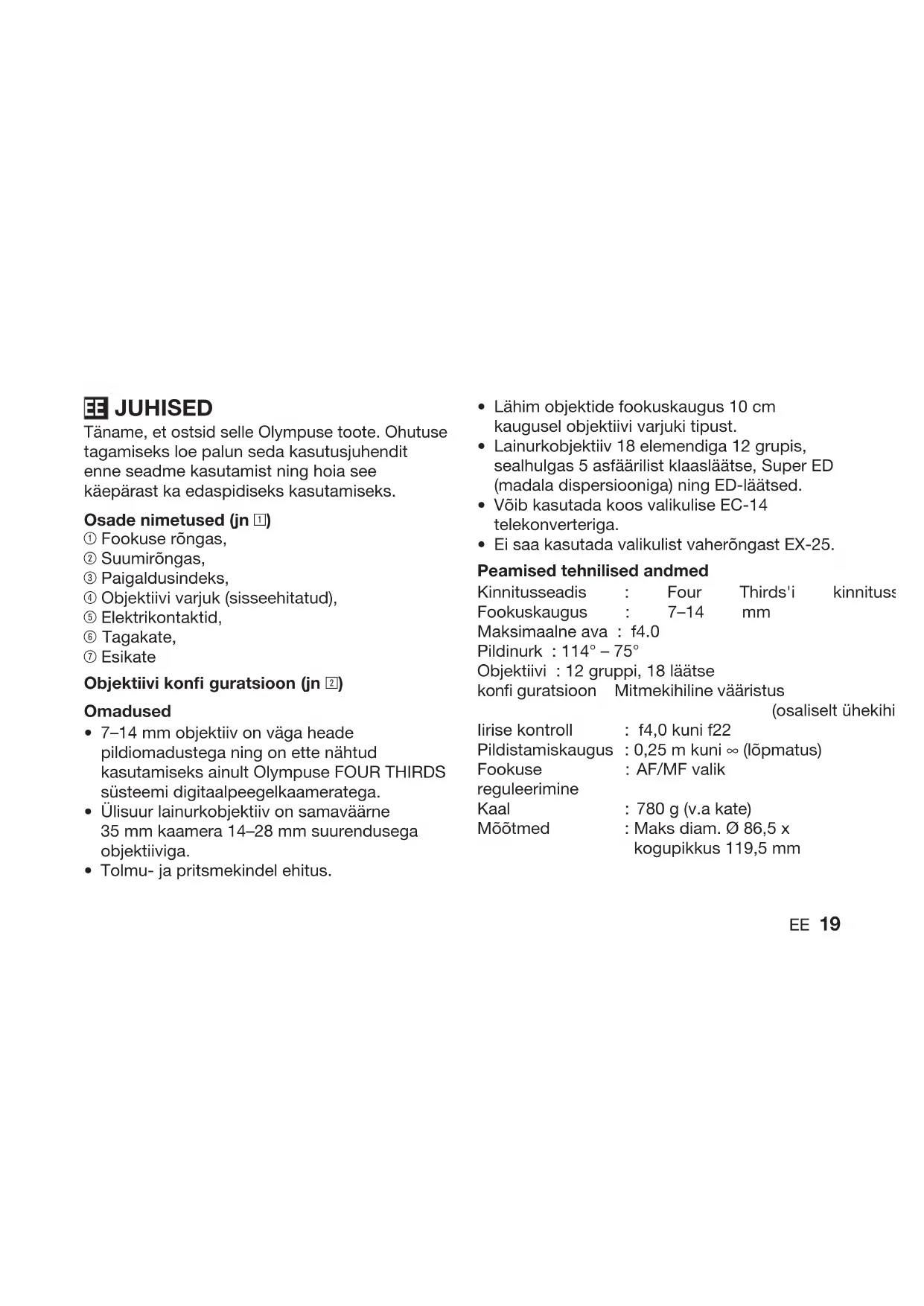 - EE 19 JUHISED Täname, et ostsid selle Olympuse toote. Ohutuse tagamiseks loe palun seda kasutusjuhendit enne seadme kasutamist ning hoia see käepärast ka edaspidiseks kasutamiseks. Osade nimetused (jn 1) 1 Fookuse rõngas, 2 Suumirõngas, 3 Paigaldusindeks, 4 Objektiivi varjuk (sisseehitatud), 5 Elektrikontaktid, 6 Tagakate, 7 Esikate Objektiivi konfi guratsioon (jn 2) Omadused 7–14 mm objektiiv on väga heade pildiomadustega ning on ette nähtud kasutamiseks ainult Olympuse FOUR THIRDS süsteemi digitaalpeegelkaameratega. Ülisuur lainurkobjektiiv on samaväärne 35 mm kaamera 14–28 mm suurendusega objektiiviga. Tolmu- ja pritsmekindel ehitus.