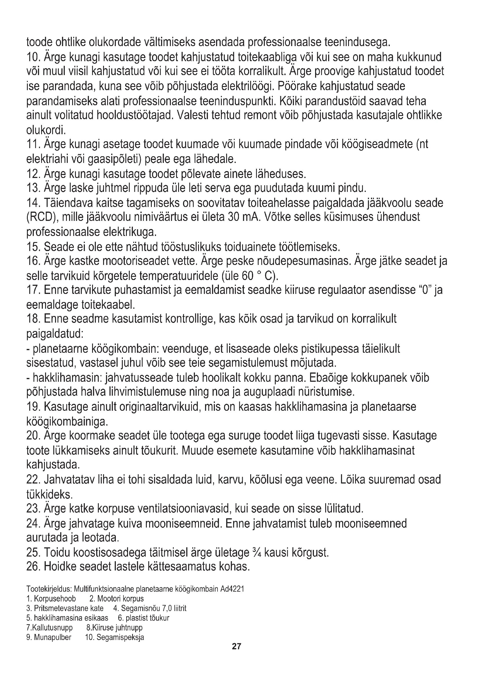 9. Kontrollige perioodiliselt toitekaabli seisukorda. Kui toitekaabel on kahjustatud, tuleb27