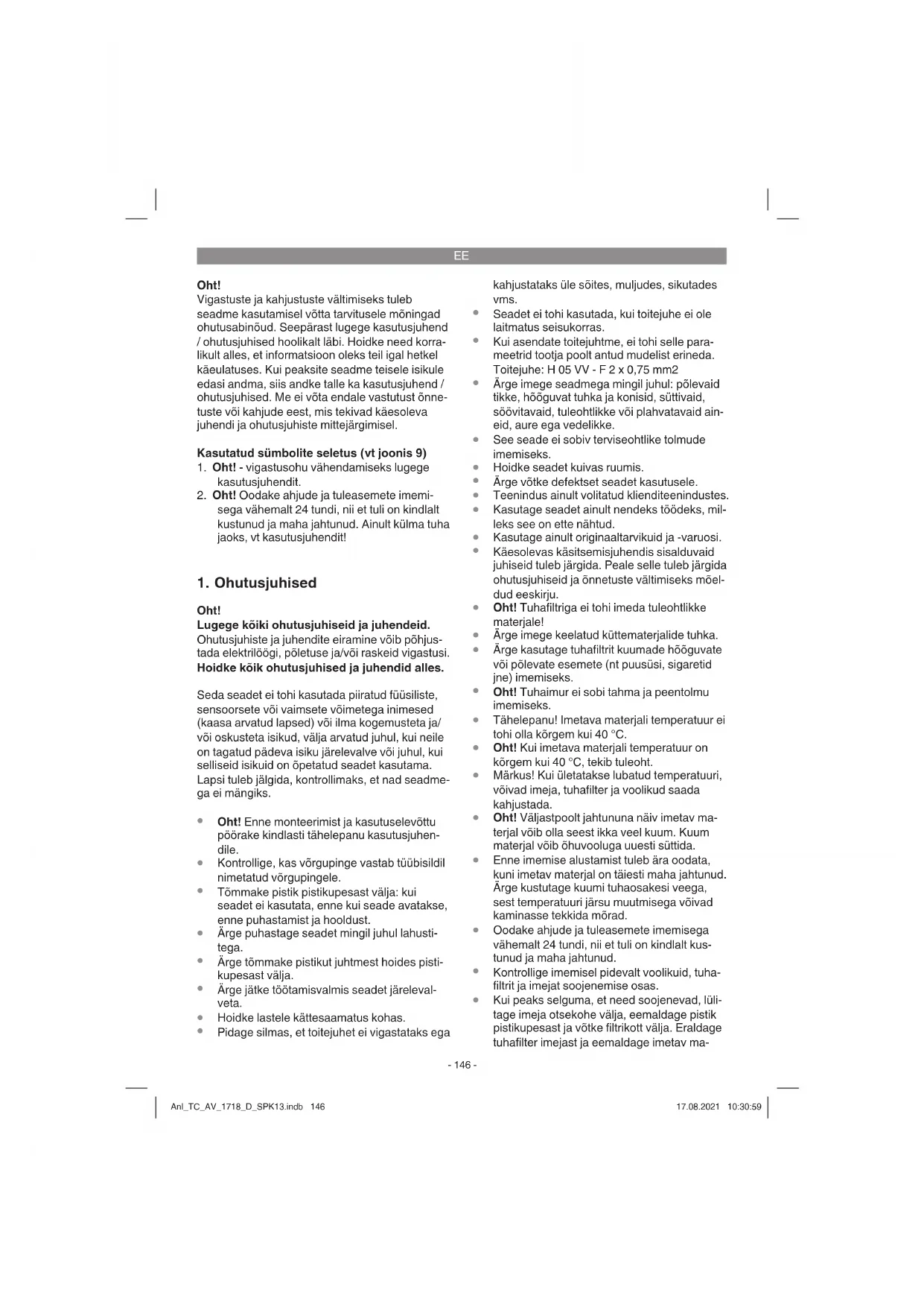 Kui asendate toitejuhtme, ei tohi selle para- meetrid tootja poolt antud mudelist erineda. Toitejuhe: H 05 VV - F 2 x 0,75 mm2