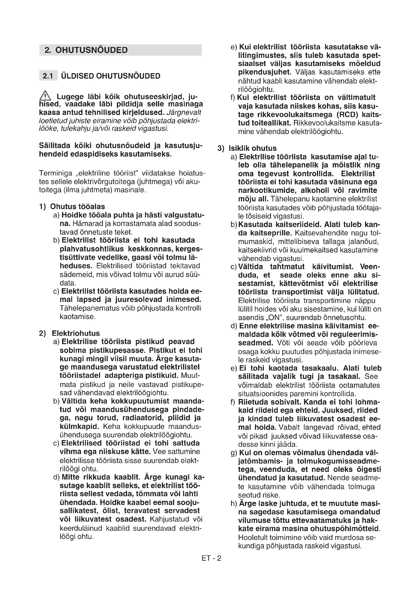 a) Elektrilise tööriista kasutamise ajal tu- leb olla tähelepanelik ja mõistlik ning oma tegevust kontrollida. Elektrilist tööriista ei tohi kasutada väsinuna ega narkootikumide, alkoholi või ravimite mõju all. Tähelepanu kaotamine elektrilist tööriista kasutades võib põhjustada töötaja- le tõsiseid vigastusi. b) Kasutada kaitseriideid. Alati tuleb kan- da kaitseprille. Kaitsevahendite nagu tol- mumaskid, mittelibiseva tallaga jalanõud, kaitsekiivrid või kuulmekaitsed kasutamine vähendab vigastusi. c) Vältida tahtmatut käivitumist. Veen- duda, et seade oleks enne aku si- sestamist, kättevõtmist või elektrilise tööriista transportimist välja lülitatud. Elektrilise tööriista transportimine näppu lülitil hoides või aku sisestamine, kui lüliti on asendis „ON”, suurendab õnnetusohtu. d) Enne elektrilise masina käivitamist ee- maldada kõik võtmed või reguleerimis- seadmed. Võti või seade võib pöörleva osaga kokku puutudes põhjustada inimese- le raskeid vigastusi. e) Ei tohi kaotada tasakaalu. Alati tuleb säilitada vajalik tugi ja tasakaal. See võimaldab elektrilist tööriista ootamatutes situatsioonides paremini kontrollida. f) Riietuda sobivalt. Kanda ei tohi lohma- kaid riideid ega ehteid. Juuksed, riided ja kindad tuleb liikuvatest osadest ee- mal hoida. Vabalt langevad rõivad, ehted või pikad juuksed võivad liikuvatesse osa- desse kinni jääda. g) Kui on olemas võimalus ühendada väl- jatõmbamis- ja tolmukogumisseadme- tega, veenduda, et need oleks õigesti ühendatud ja kasutatud. Nende seadme- te kasutamine võib vähendada tolmuga seotud riske. h) Ärge laske juhtuda, et te muutute masi- na sagedase kasutamisega omandatud vilumuse tõttu ettevaatamatuks ja hak- kate eirama masina ohutuspõhimõtteid. Hooletult toimimine võib vaid murdosa se- kundiga põhjustada raskeid vigastusi.ET - 3