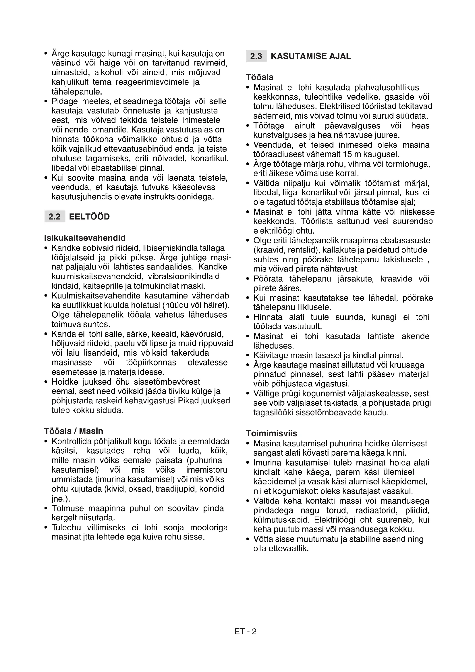 Purunemiste või õnnetuste korral töö ajal seisake koheselt mootor ja viige masin eemale, et vältida lisakahjustusi; õnnetuste puhul vigastustega endale või teistele alus- tage koheselt olukorrale vastavate esmaabi- võtetega ja pöörduge vajaliku ravi saamiseks tervishoiuasutuse poole. Eemaldada hooli- kalt võimalikud jäägid, mis võiksid põhjusta- da tähelepanuta jäämise korral kahjustusi või vigastusi inimestele või loomadele. Pikaajaline vibratsiooniga kokkupuu- tumine võib põhjustada kahjustusi ja närvi- süsteemi häireid (tuntud ka nagu „Raynaudi sündroom“ või „valge käsi“ ) eriti neile, kes kannatavad vereringe häirete käes. Sümp- tomid puudutavad käsi, randmeid ja sõrmi ja need ilmnevad tundlikkuse kadumisega, tuimusega, sügelusega, valuga, naha värvi või struktuuri muutustega. Neid efekte võib tugevdada madal õhutemperatuur ja/või liiga tugev haare käepidemel. Sümptomide ilmne- misel tuleb vähendada masina kasutamisae- ga ja pidada nõu arstiga. Kasutuspiirangud